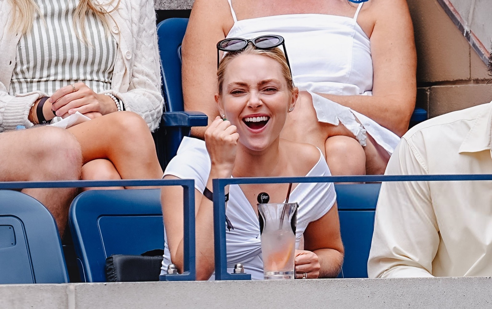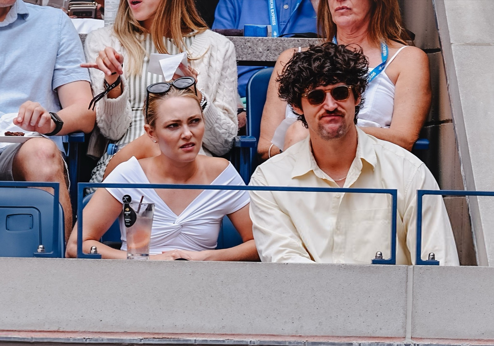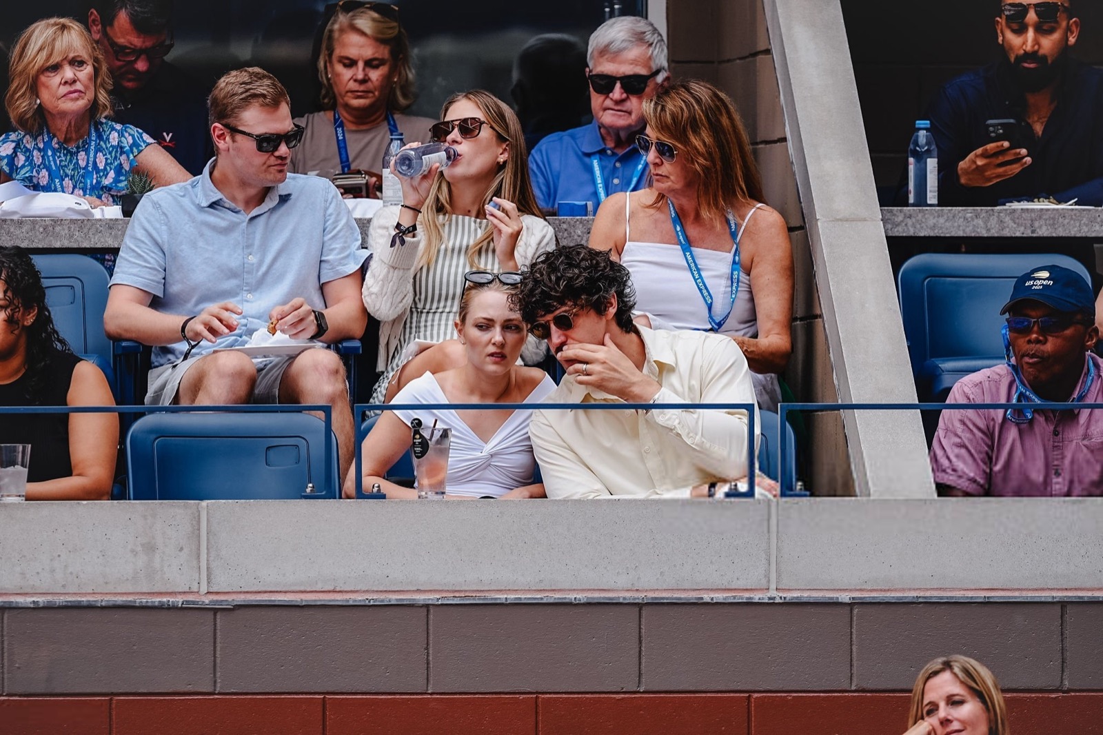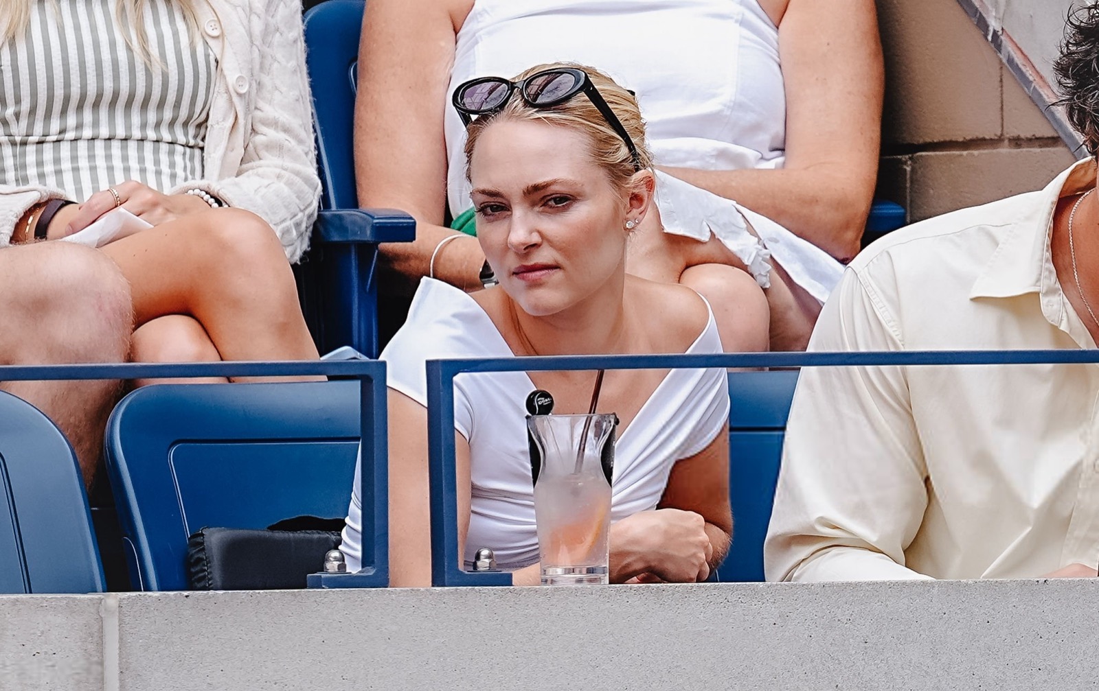 Dans les gradins, AnnaSophia Robb joue la carte du fair-play enthousiaste. Poing levé, sourire XXL et cocktail à la main, elle encourage chaque échange comme si elle y était invitée par Wimbledon lui-même.