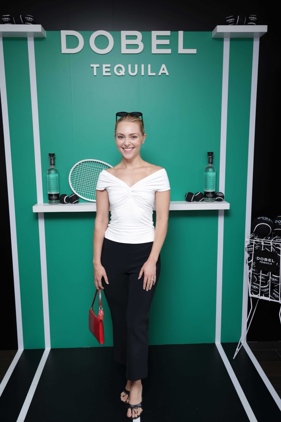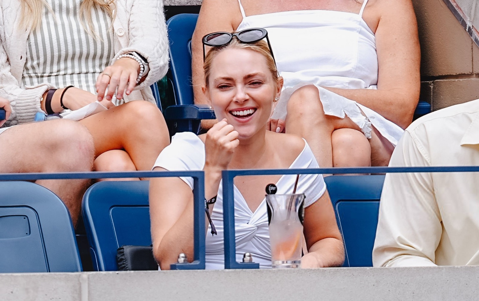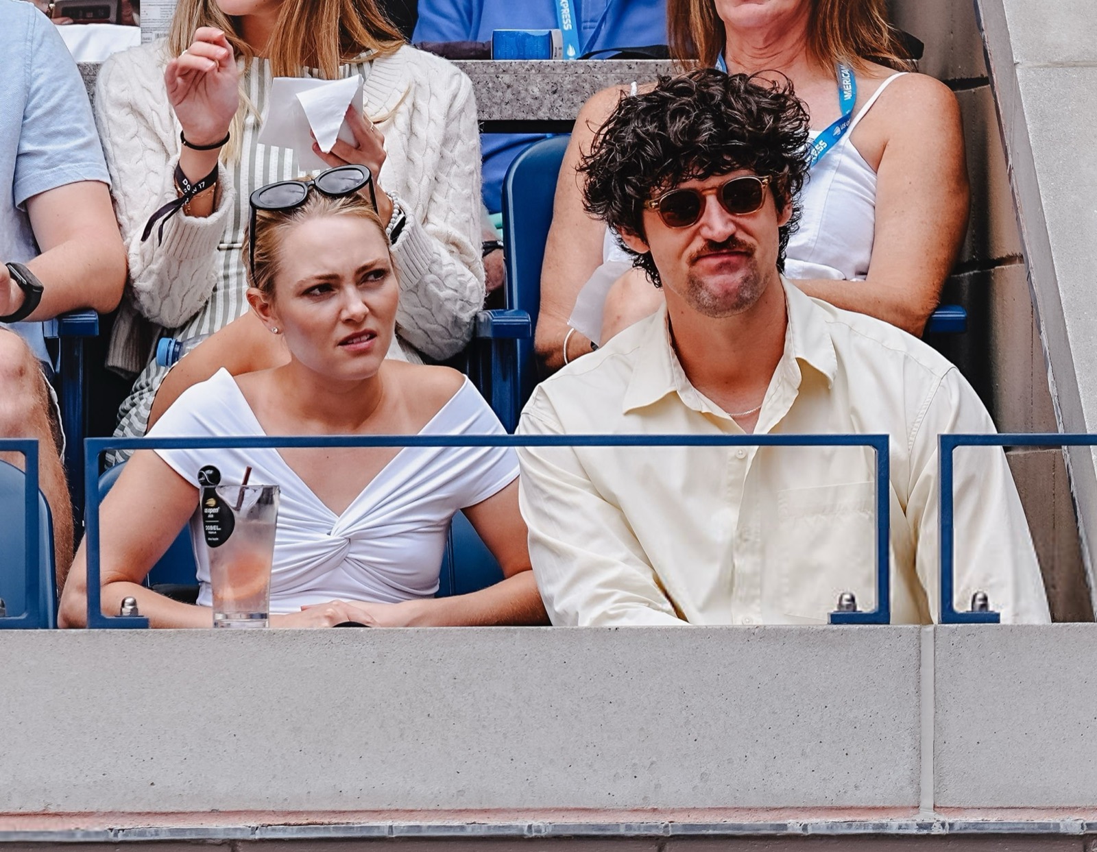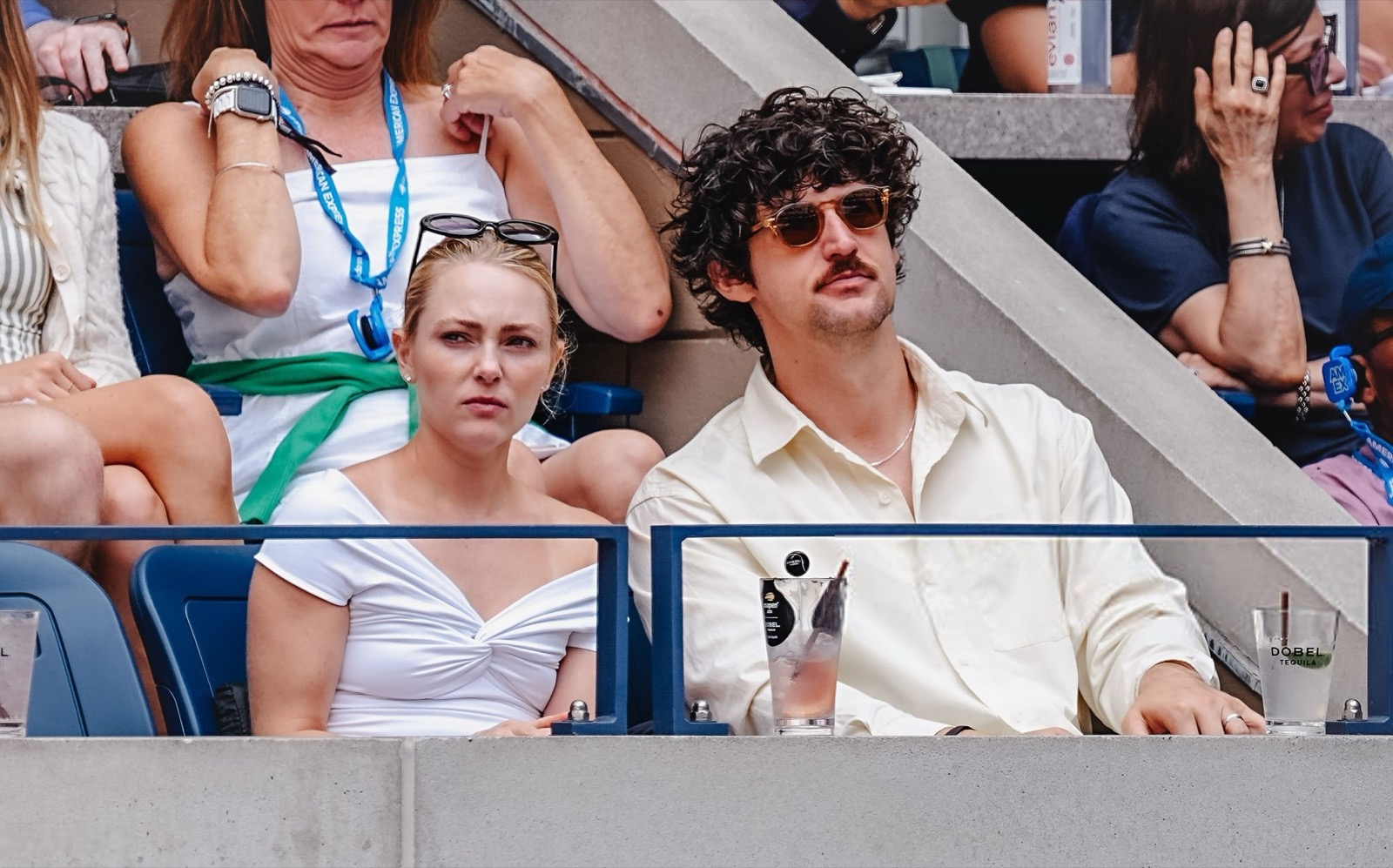 Dans les gradins, AnnaSophia Robb joue la carte du fair-play enthousiaste. Poing levé, sourire XXL et cocktail à la main, elle encourage chaque échange comme si elle y était invitée par Wimbledon lui-même.