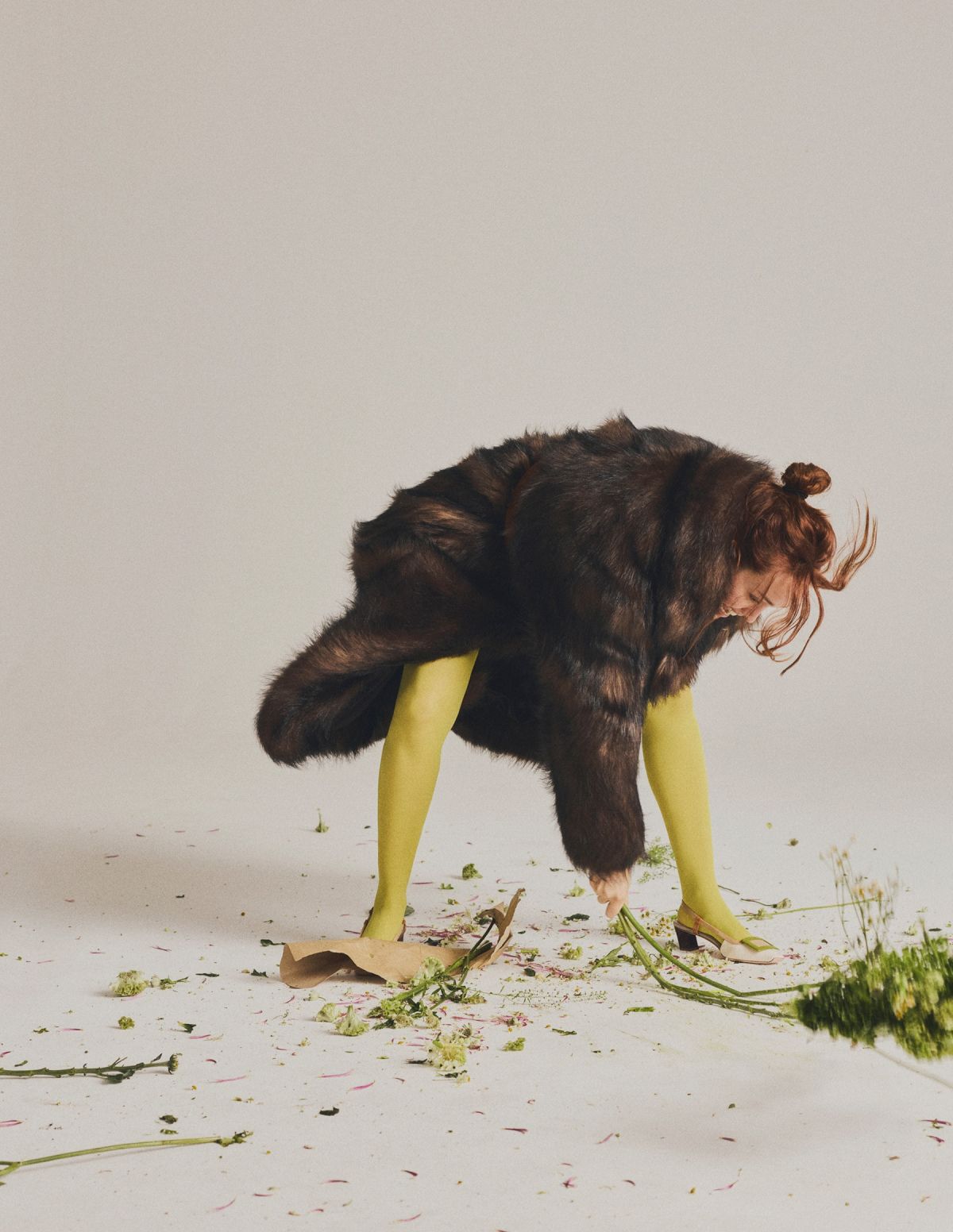 Dans un décor minimaliste, Olivia Cooke s’enveloppe dans un manteau de fourrure démesuré, brandissant des tournesols comme s’il s’agissait d’un accessoire haute couture. La mode version nature morte, mais avec un clin d’œil ironique au romantisme bucolique.