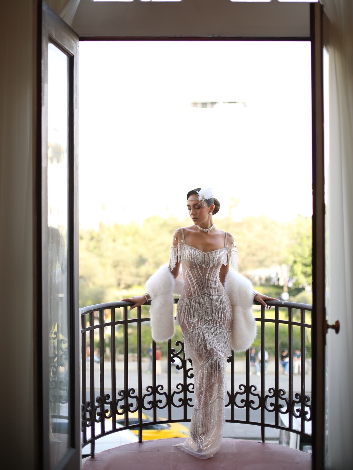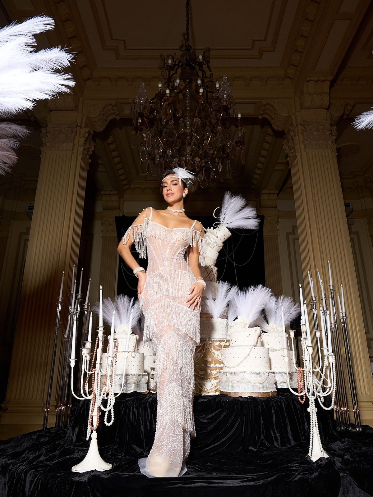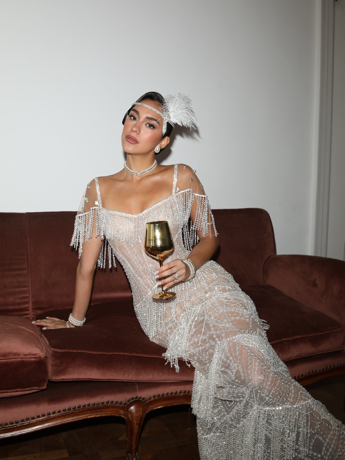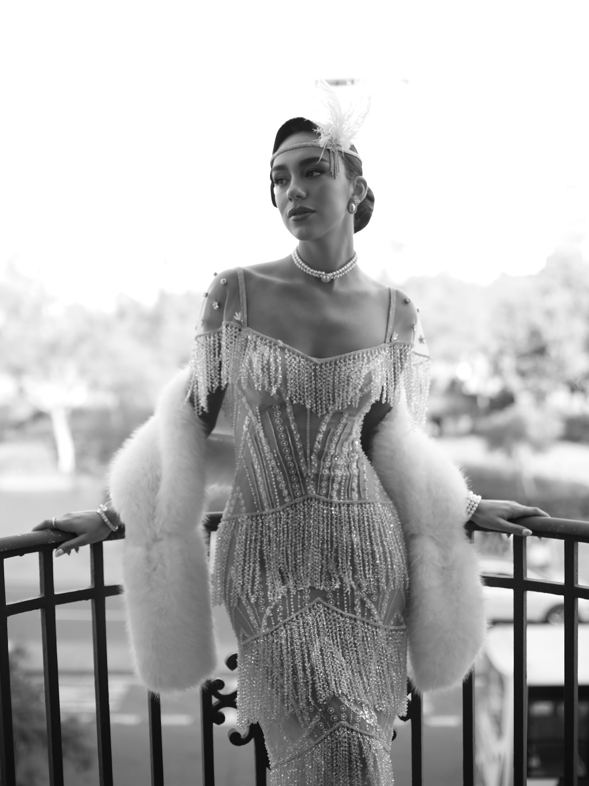Dans sa robe perlée qui scintille comme une boule disco des années folles, Luana Barron s’approprie sans complexe l’esprit des années 20. Épaules couvertes de fausse fourrure, diadème à plume et sourire étudié : l’illusion est totale, comme si F. Scott Fitzgerald l’avait écrite lui-même.