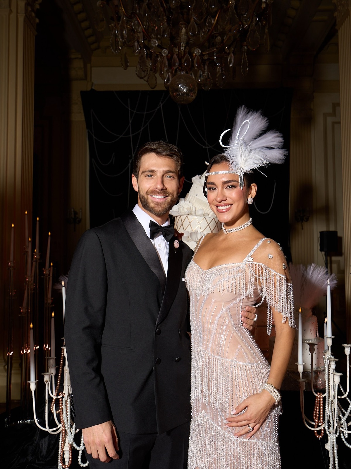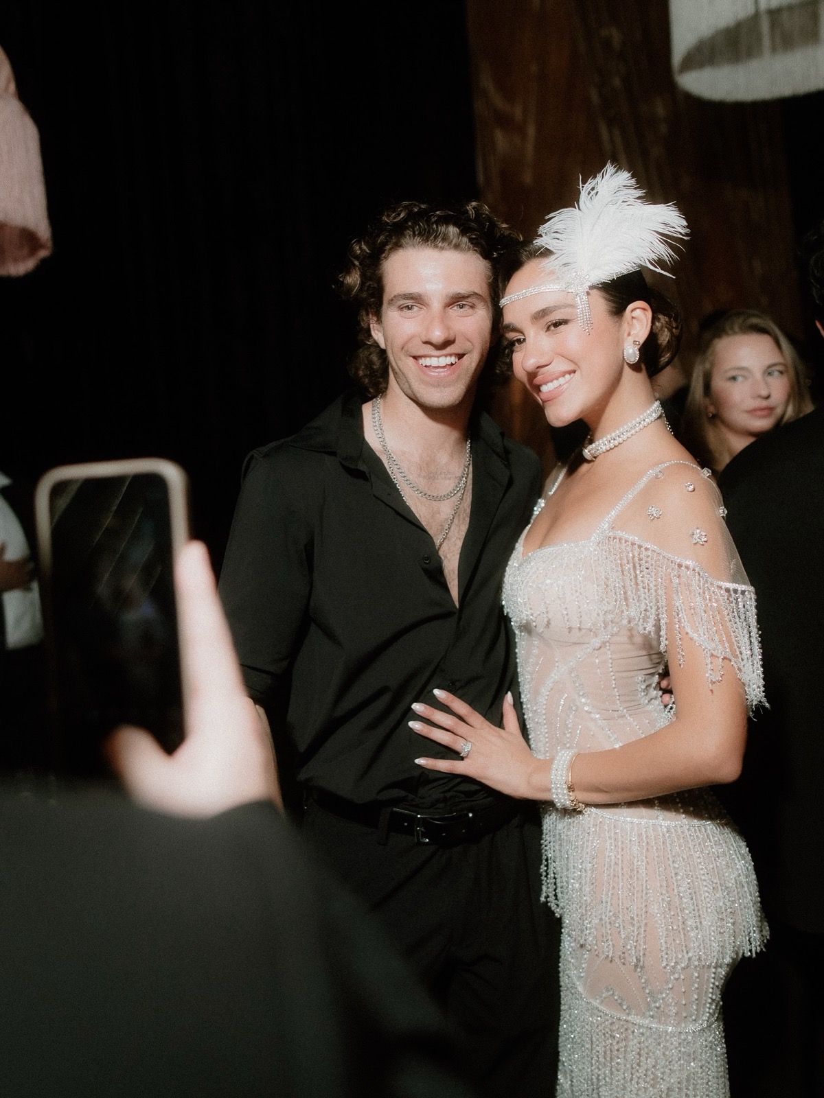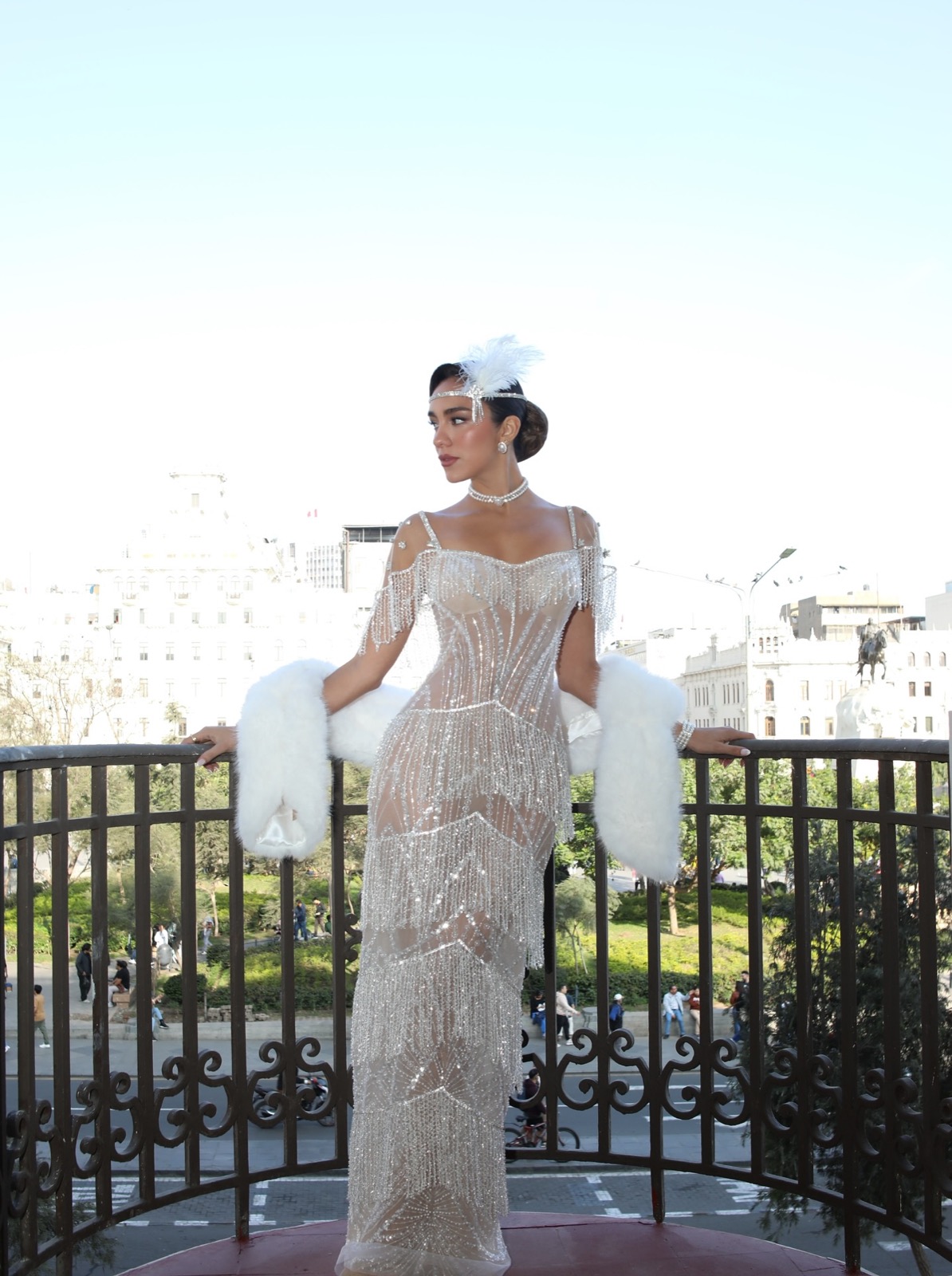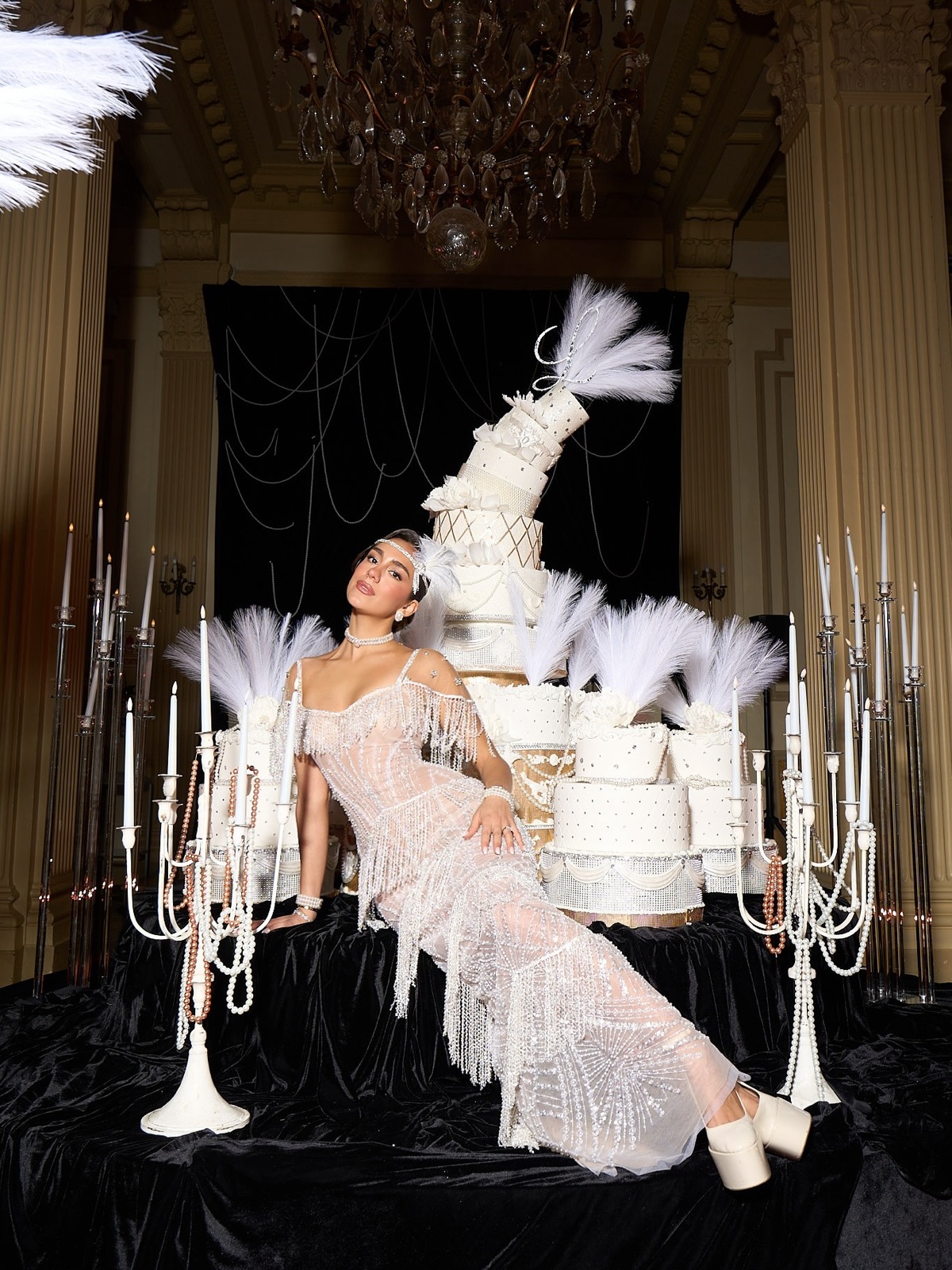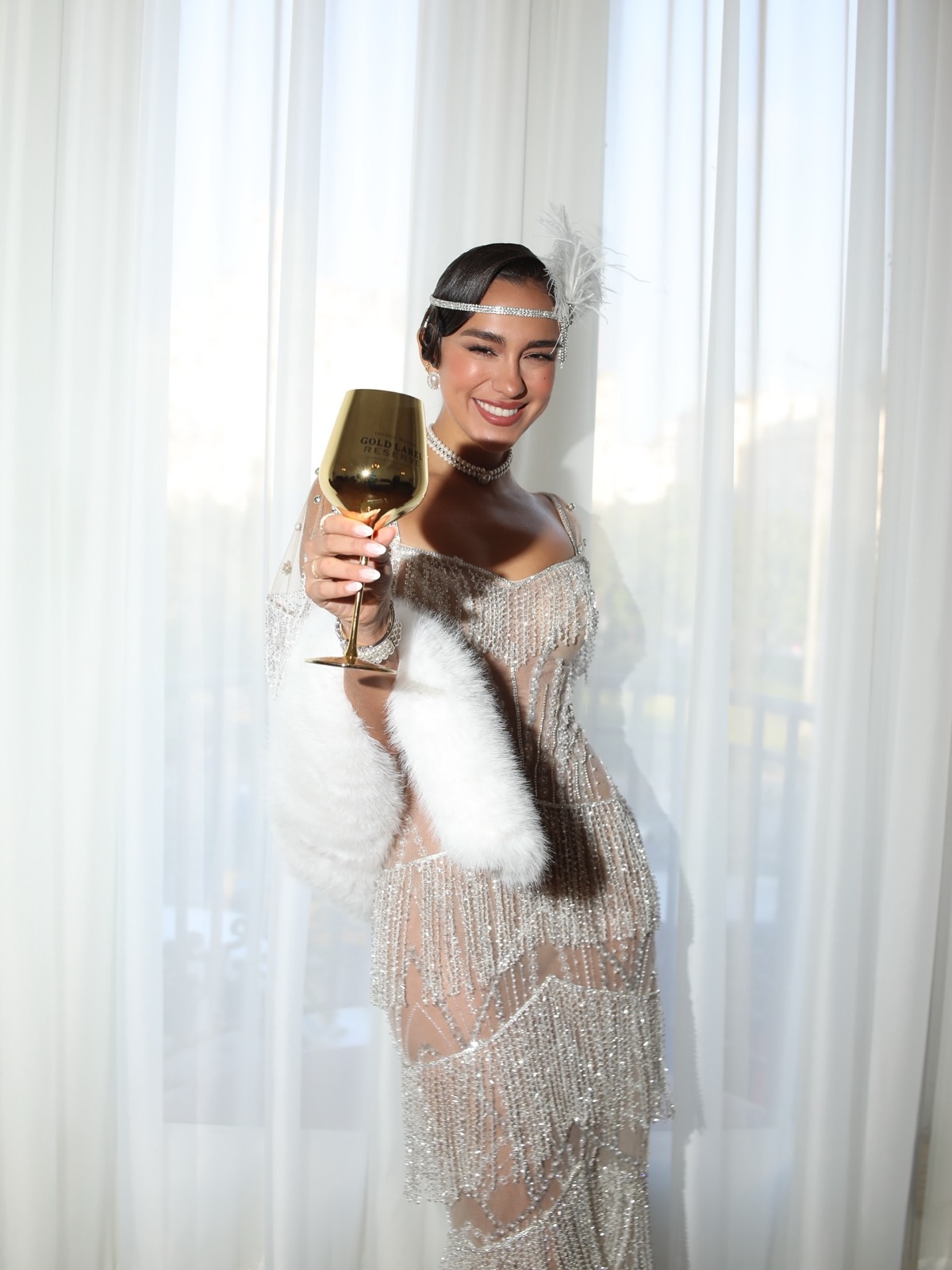 Dans sa robe perlée qui scintille comme une boule disco des années folles, Luana Barron s’approprie sans complexe l’esprit des années 20. Épaules couvertes de fausse fourrure, diadème à plume et sourire étudié : l’illusion est totale, comme si F. Scott Fitzgerald l’avait écrite lui-même.