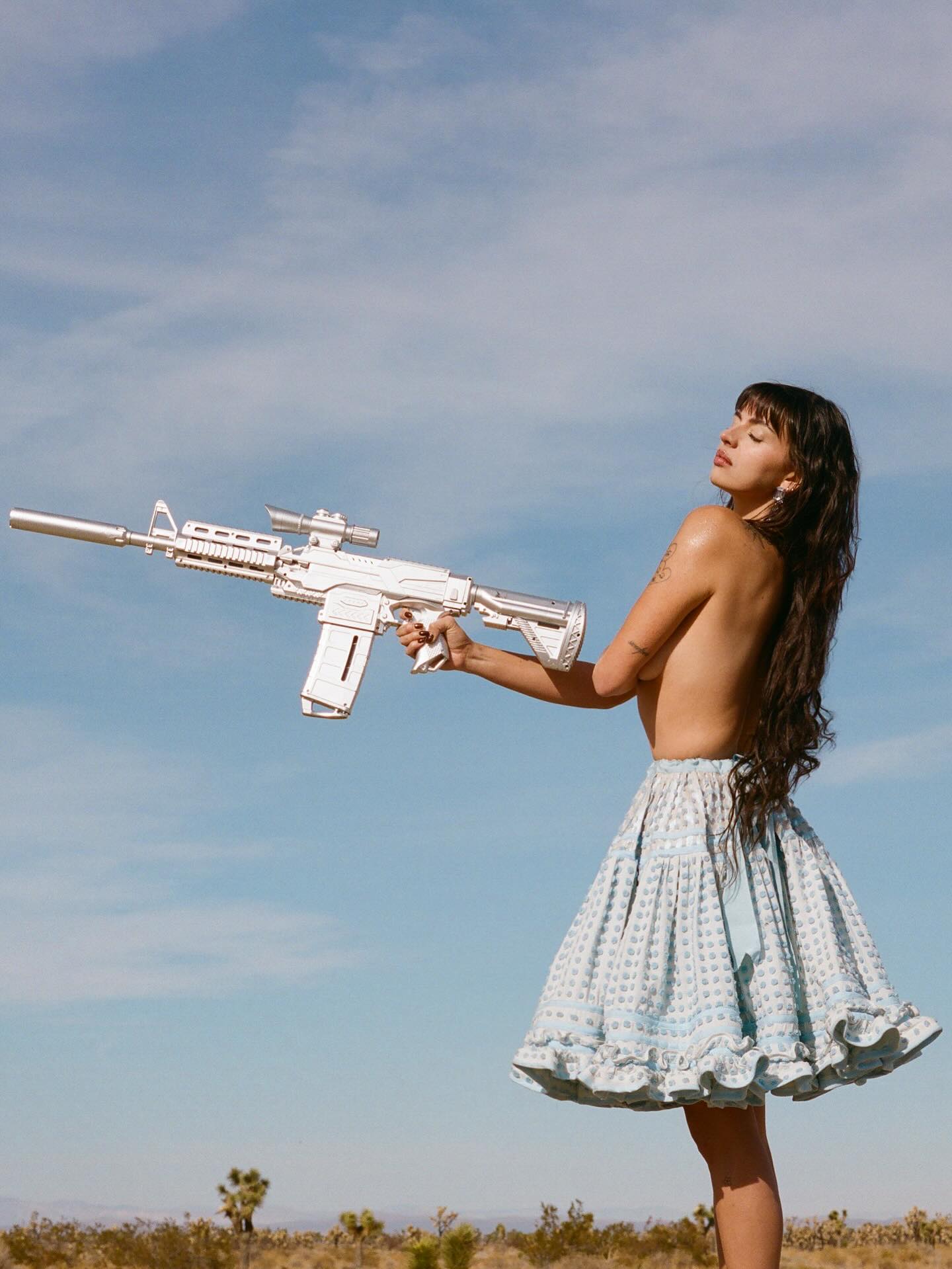 Une jupe rétro à pois, un ciel bleu désertique et un fusil argenté plus imposant que la tracklist de Salvation : Rebecca Black ne pose pas, elle déclare la guerre au minimalisme. En haut, rien. En bas, tout le volume. Et au milieu, une assurance nucléaire.