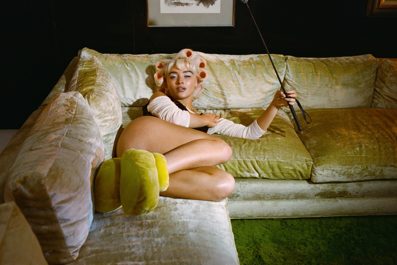 Sur le velours vert d’un canapé d’un autre temps, Sabrina Carpenter joue la drama queen domestique en burn-out esthétique : bigoudis XXL, pantoufles peluche et œillades lascives, fouet inclus. Même la moquette semble dépassée par le casting.