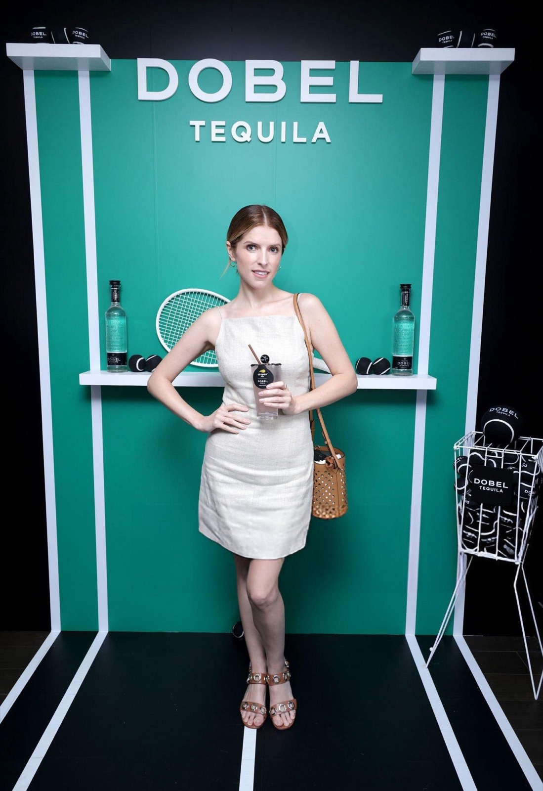 Devant un fond vert presque clinique, Anna Kendrick affiche une robe beige minimaliste, un verre Dobel en main et la pose assurée d’une championne du photocall.