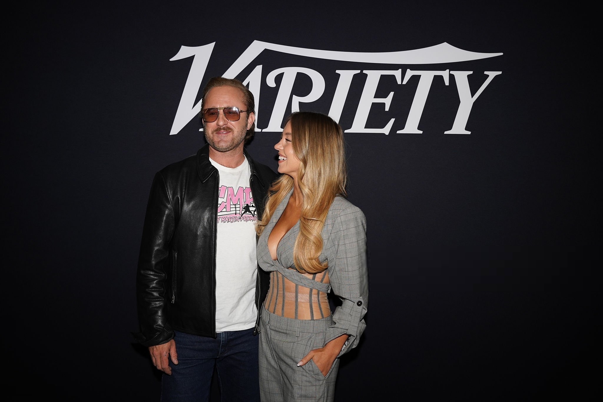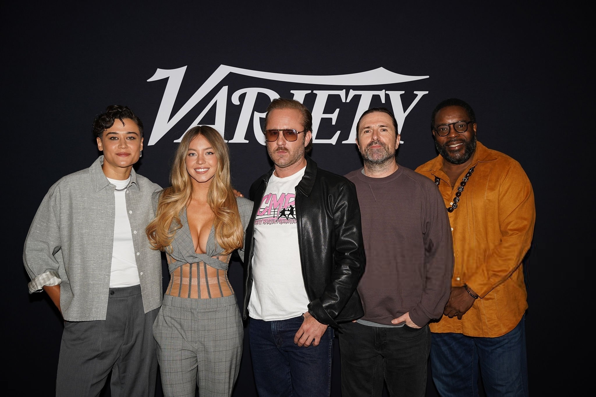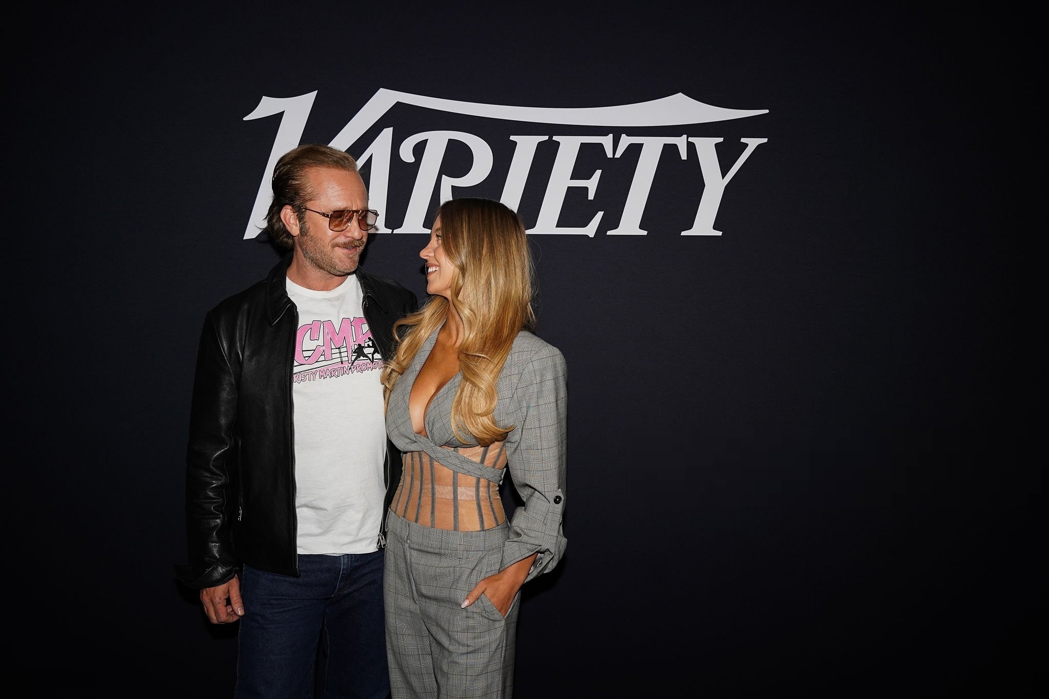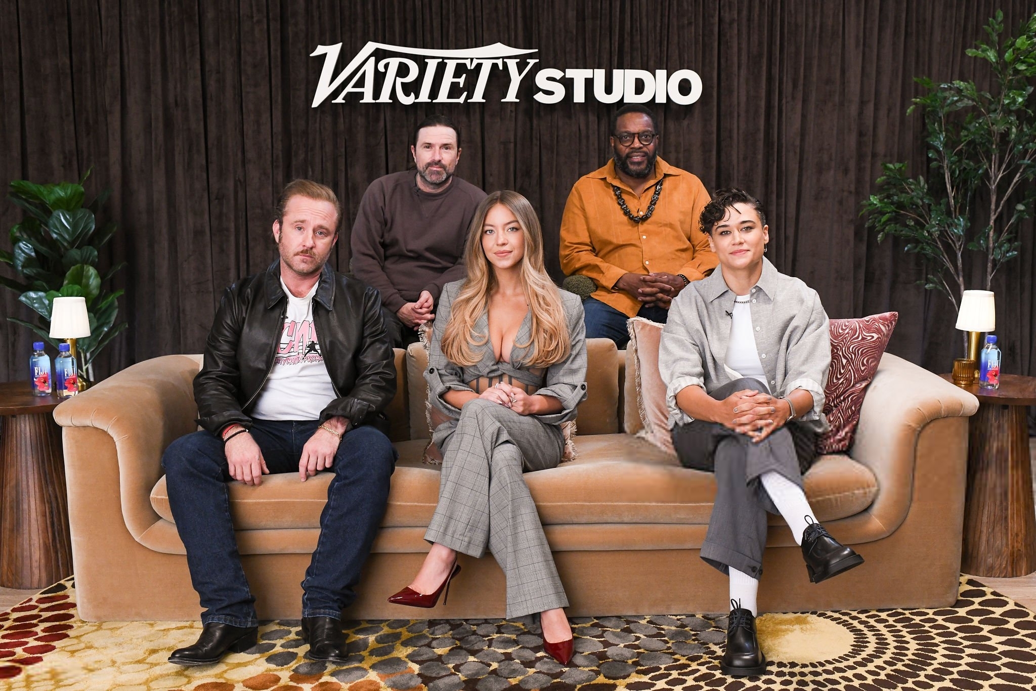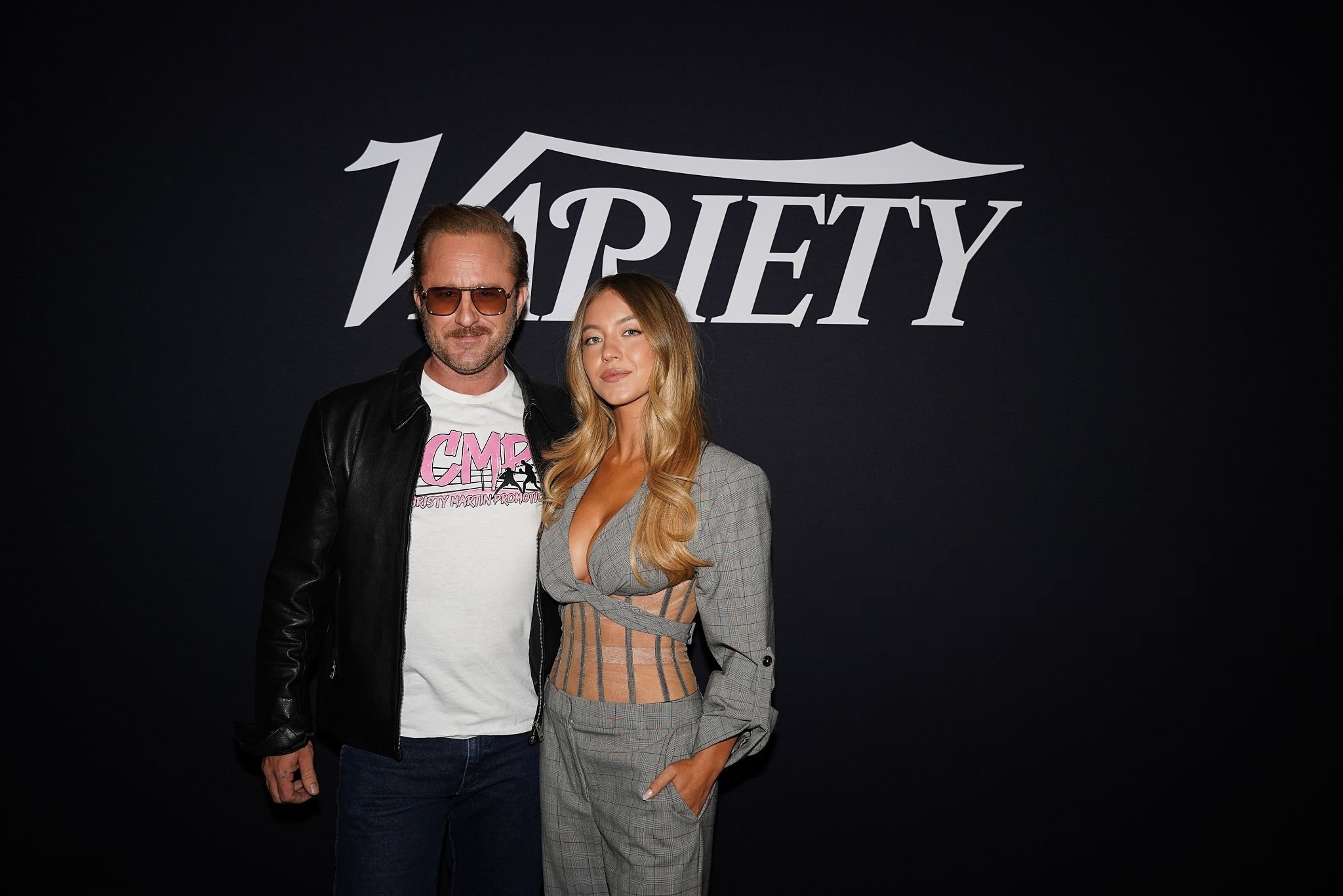 Face au mur noir barré du logo Variety, Sydney Sweeney joue la businesswoman version fantasy. Son tailleur gris façon plaid cache une armature transparente sculptée comme un corset post-renaissance.