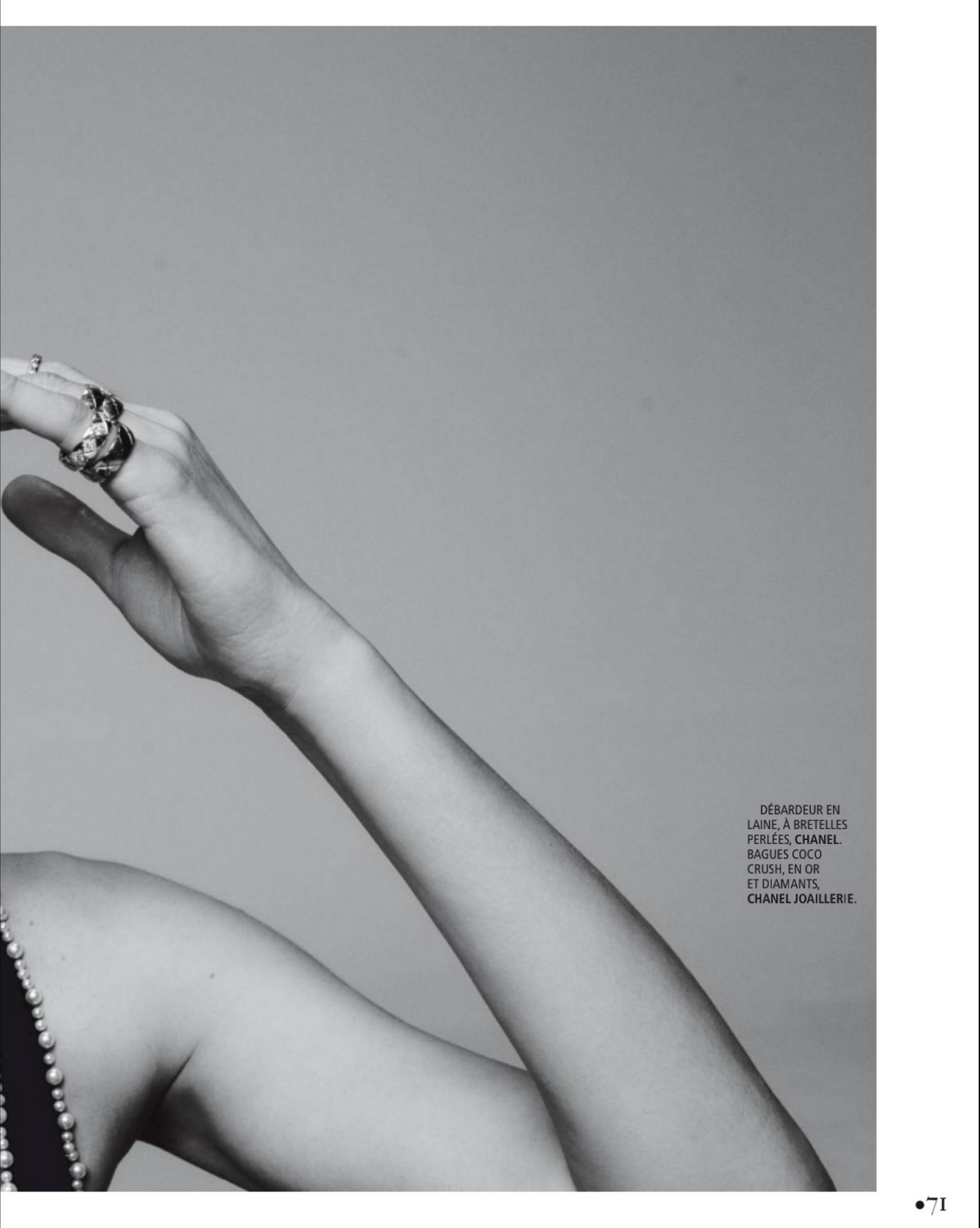 On la retrouve allongée, pensive, en veste en tweed Chanel et bagues griffées Coco Crush, comme si la gravité du monde reposait sur ses sourcils. Chaque cil est un poème. Chaque pose, une tragédie grecque.