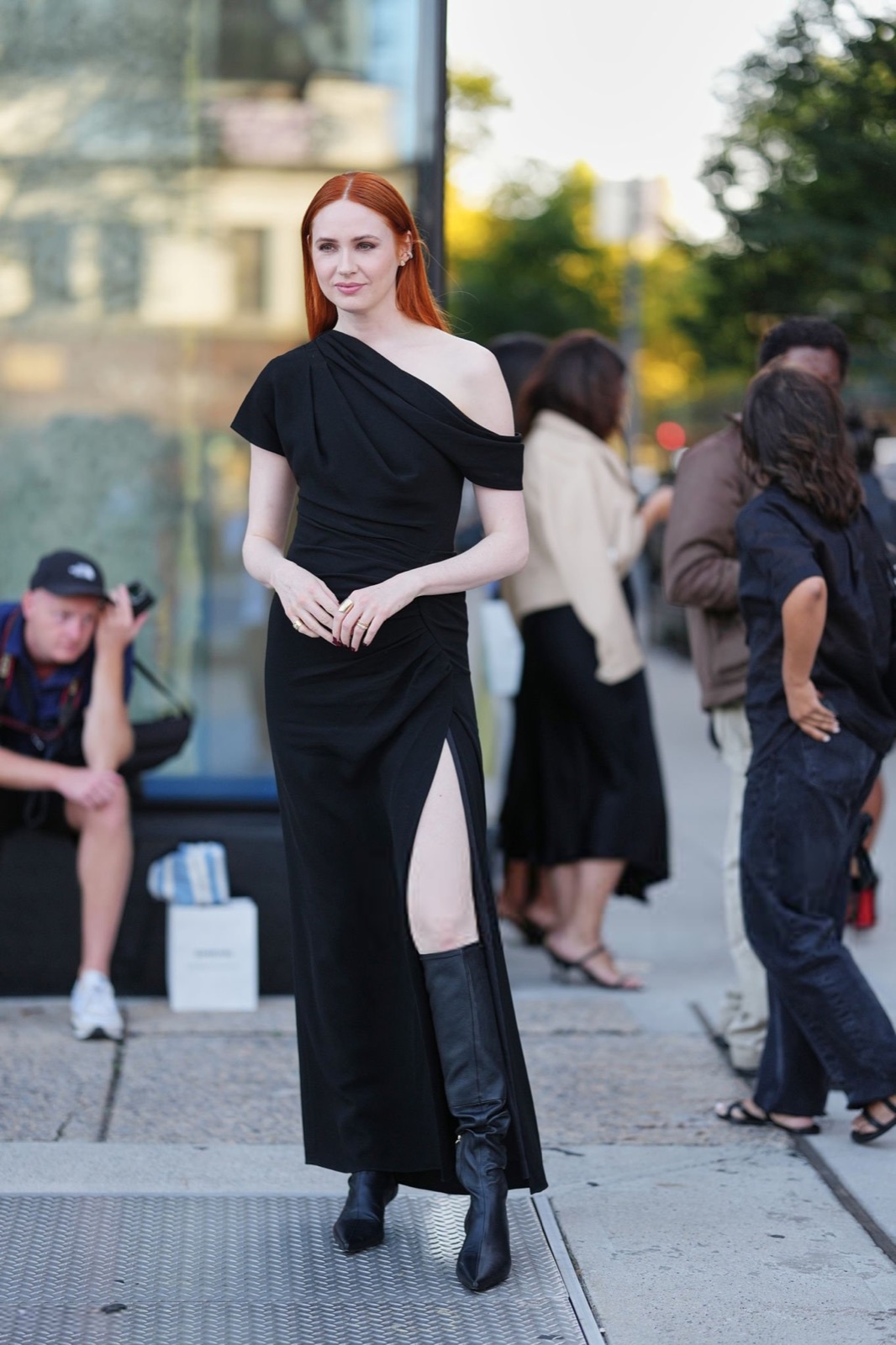 À ses pieds, des bottes en cuir noir pointues dignes d’un reboot fashion de Matrix. Les bijoux dorés sur ses doigts viennent ajouter une touche de pouvoir discret, pendant que son brushing roux reste aussi lisse que son expression neutre.