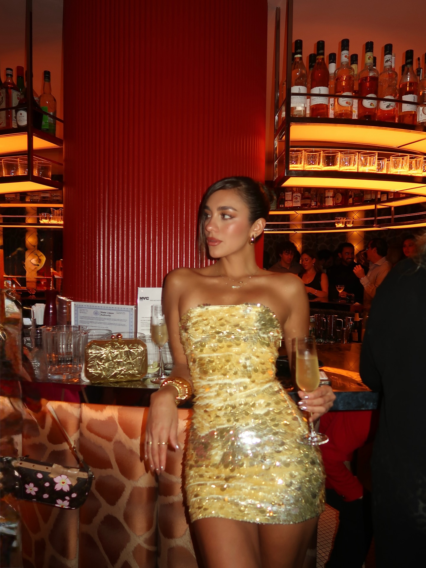 Moulée dans un mini-soleil pailleté, Luana transforme les cocktails en podium improvisé, en distribuant des poses dignes d’un Oscar pour meilleure actrice de la mondanité scintillante.