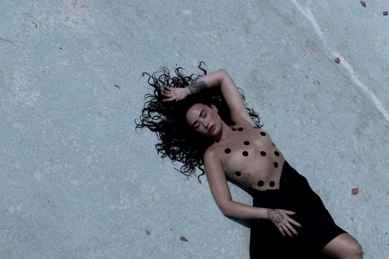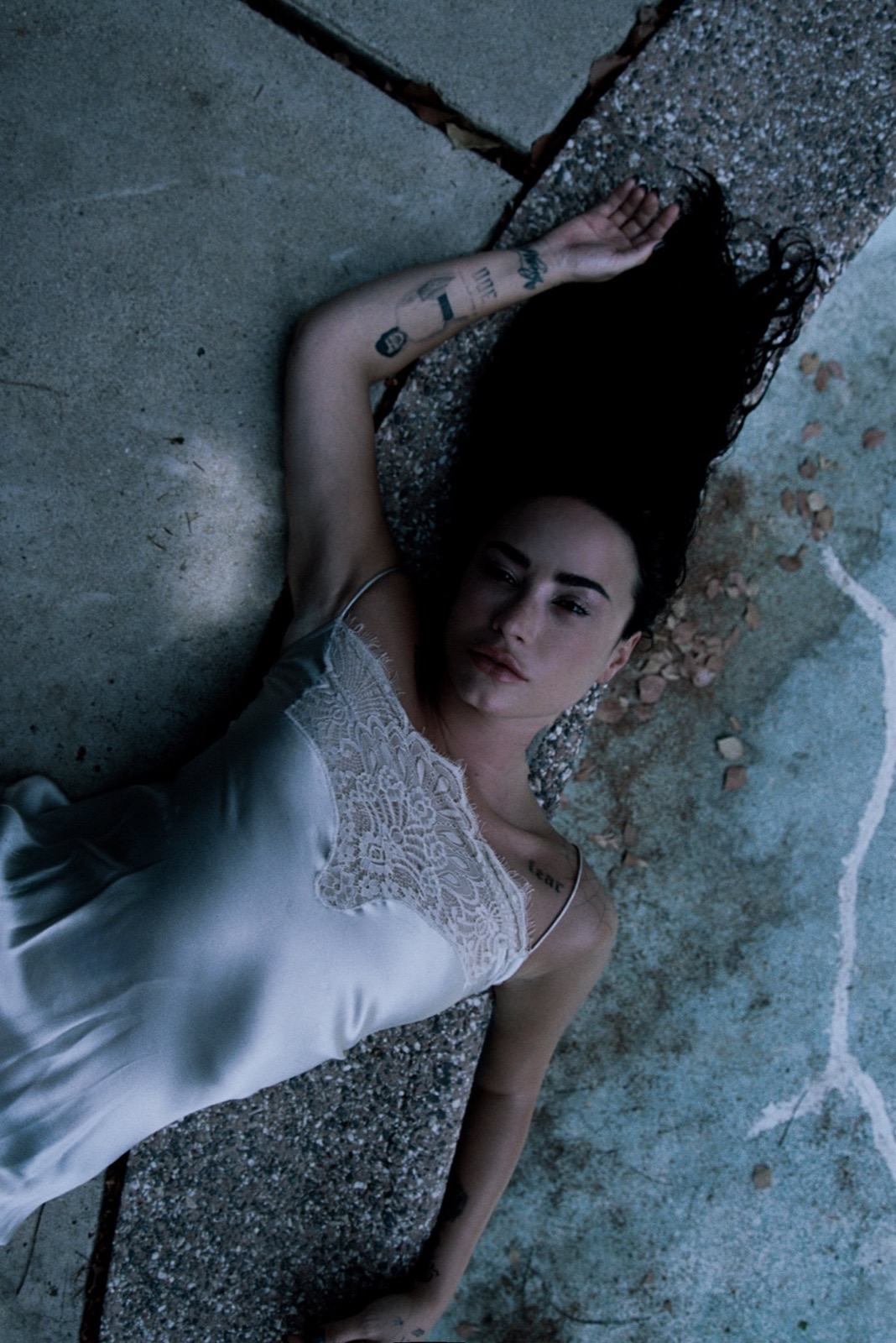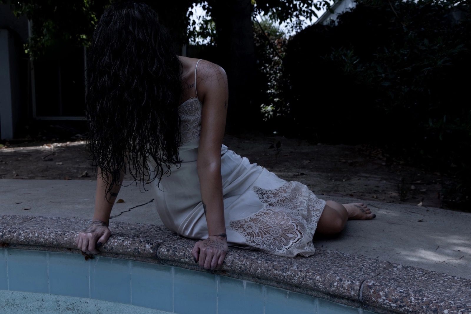 Étendue sur le béton fissuré, en nuisette ivoire froissée, elle semble hésiter entre un rêve brisé et un clip inavoué. Même les tatouages jouent les accessoires dramatiques.