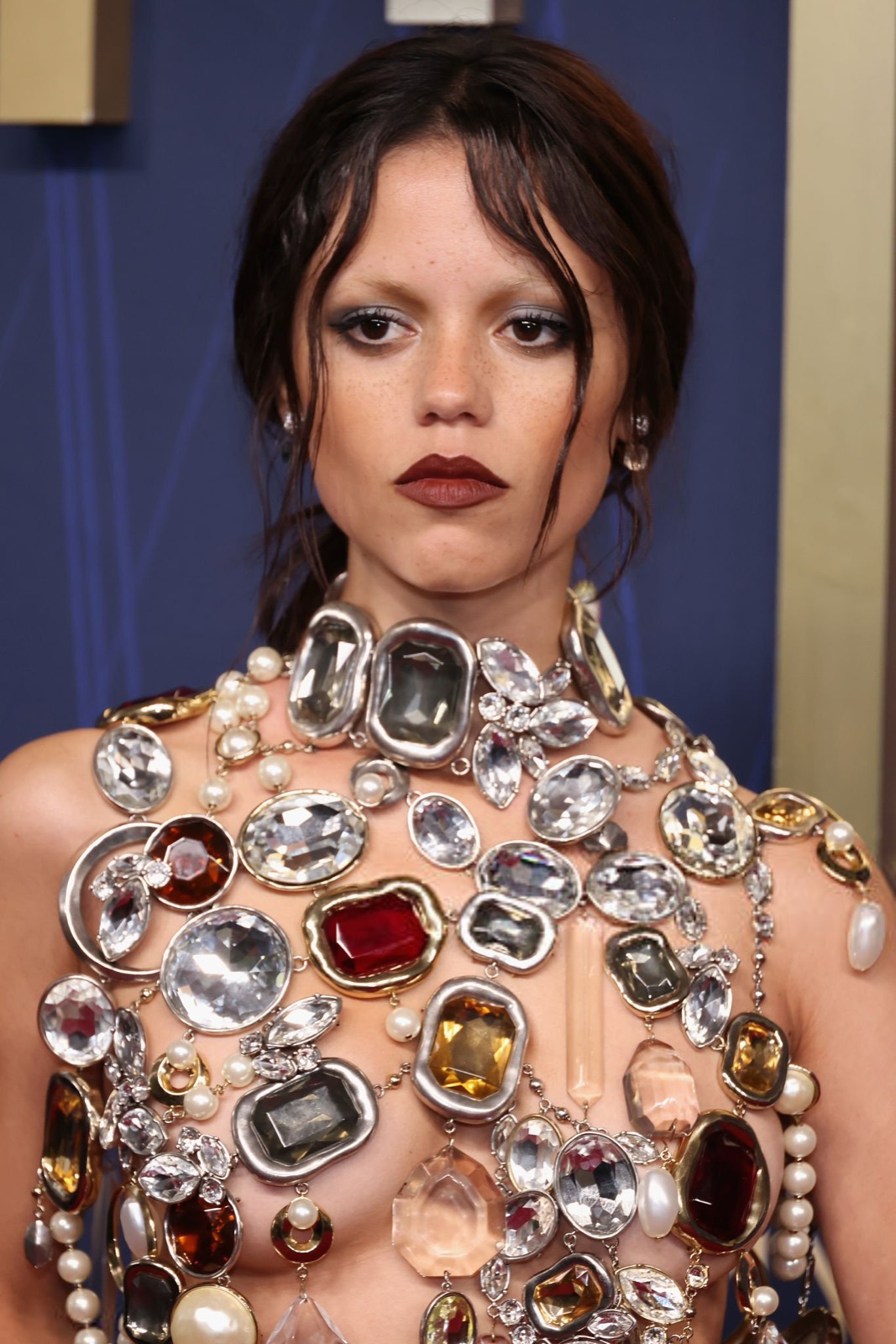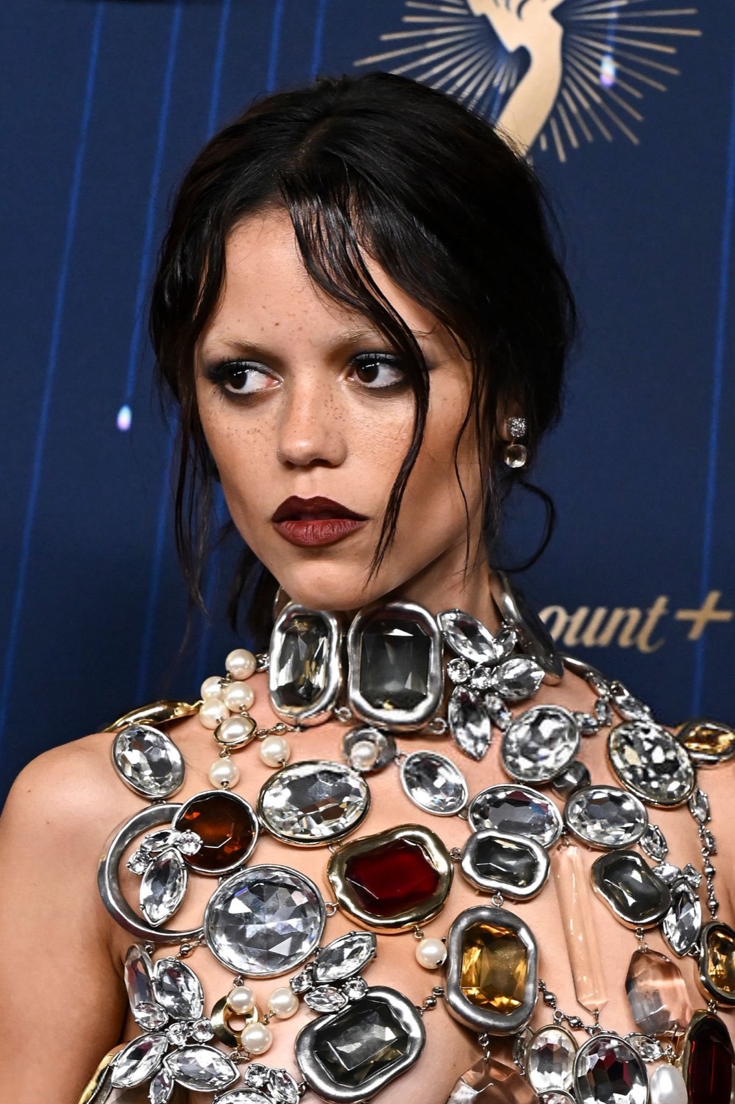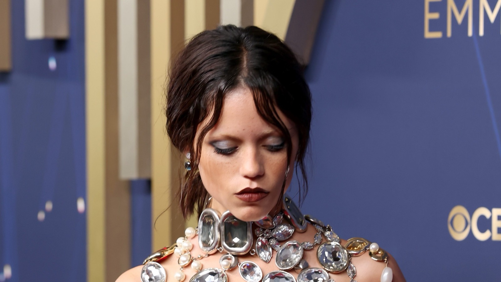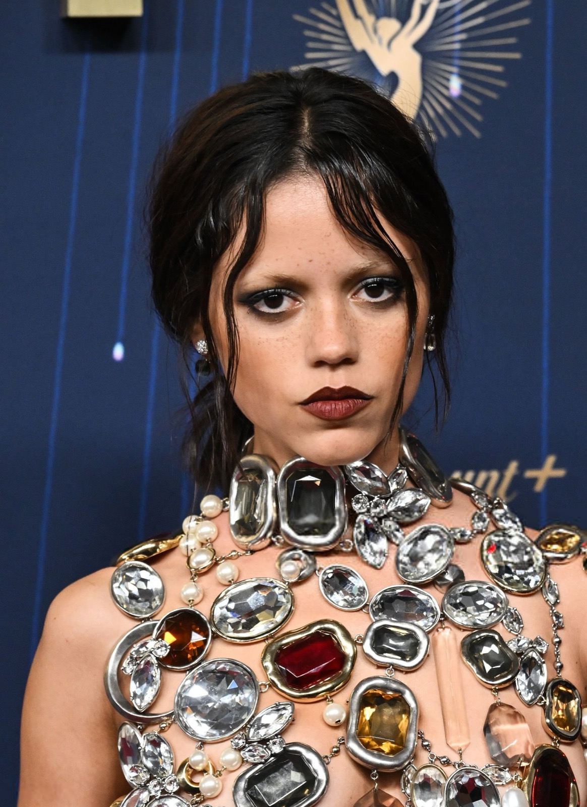 Dans une robe transformée en vitrine de joaillerie ambulante, Jenna Ortega exhibe un plastron couvert de pierres colorées et de perles géantes, façon coffre-fort ouvert des Emmy Awards.