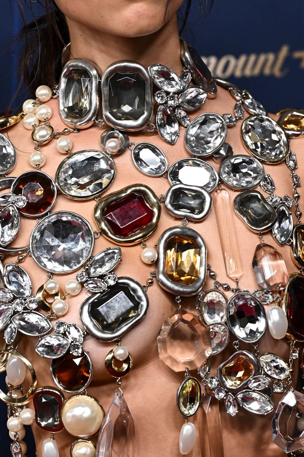 Son expression dramatique, renforcée par un maquillage sombre et un regard perçant, accentue le décalage entre tapis rouge mondain et tenue inspirée d’un atelier de gemmologie survolté.