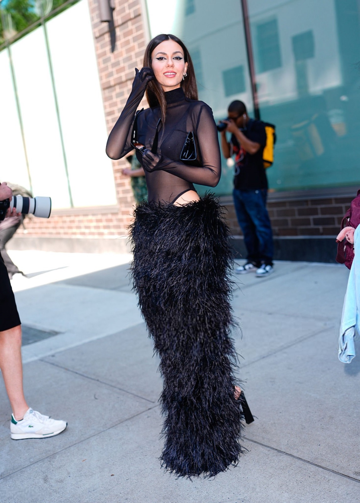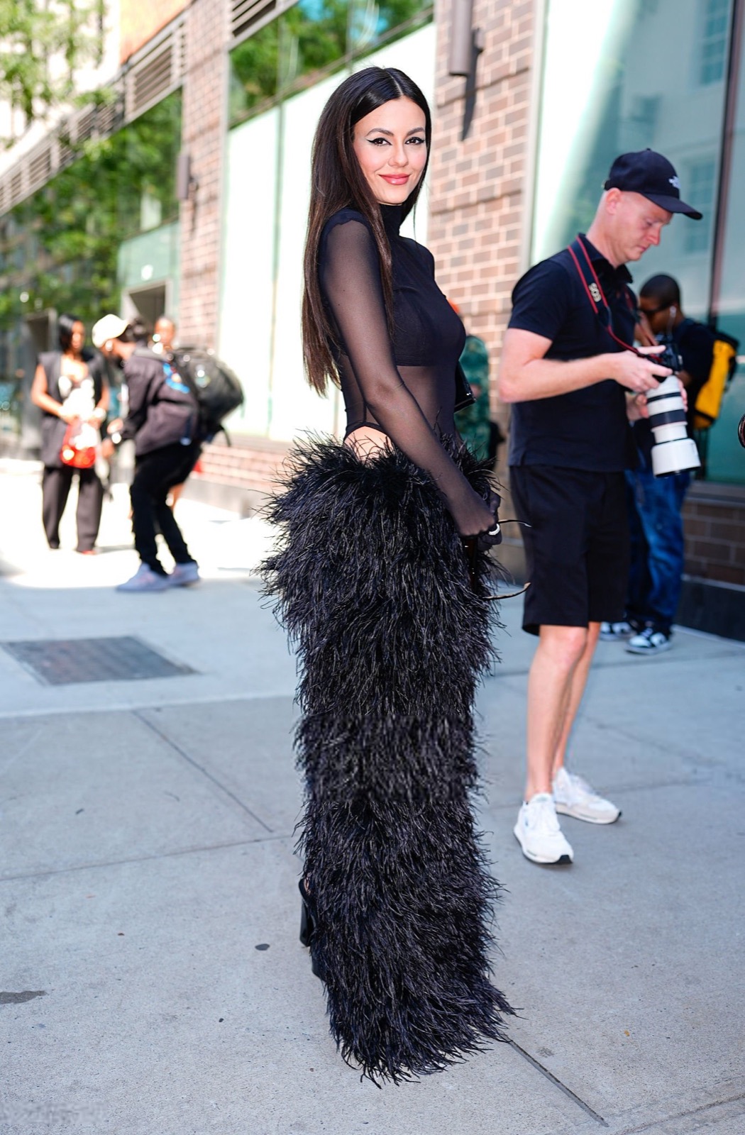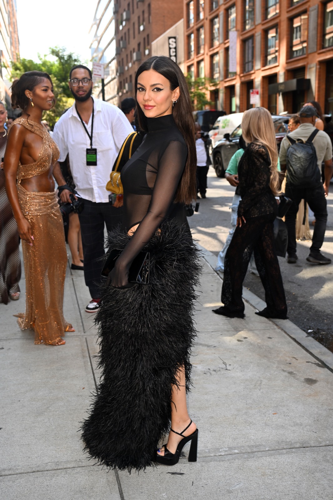 Habillée d’un haut transparent et d’une jupe noire hérissée de plumes façon coussin éventré, Victoria avance comme si les pavés de New York avaient été sponsorisés par Bronx and Banco. Le sérieux dans son regard vaut presque un générique de télé-réalité.
