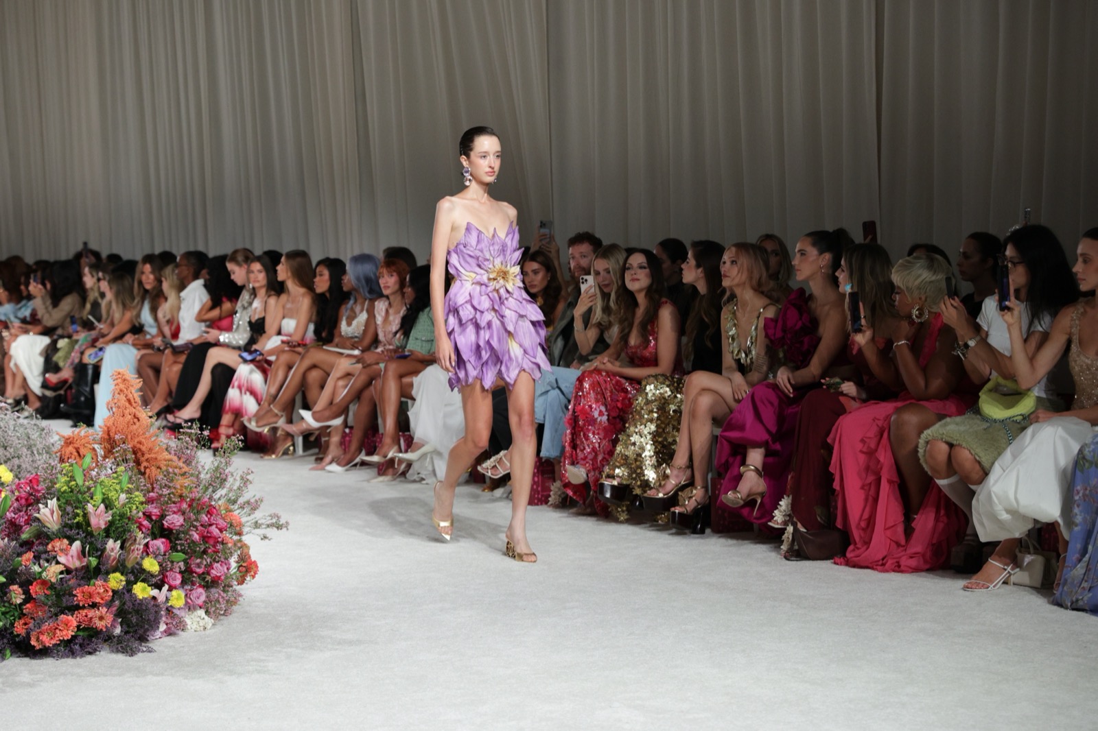 Perchée au milieu des fleurs, Elizabeth Gillies ne défilait pas, mais réussissait quand même à voler la vedette comme si PatBO l’avait engagée pour jouer l’accessoire floral officiel.