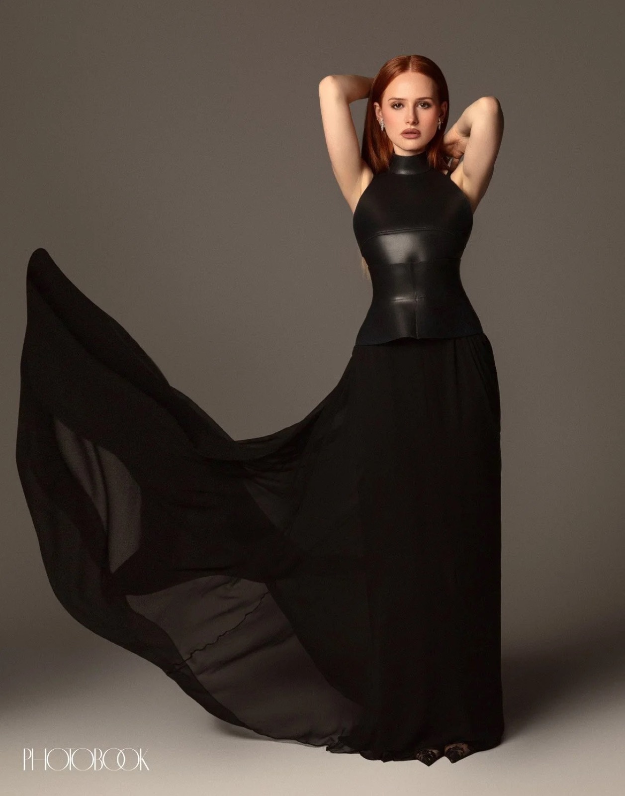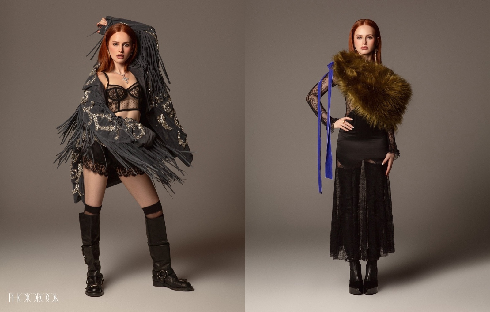 Dans ce shooting pour Photobook Magazine, Madelaine Petsch déploie son arsenal de provocation : corseterie noire, franges théâtrales et bottes cavalières. Une cow-girl sortie d’un cabaret gothique, prête à fouetter le bon goût.