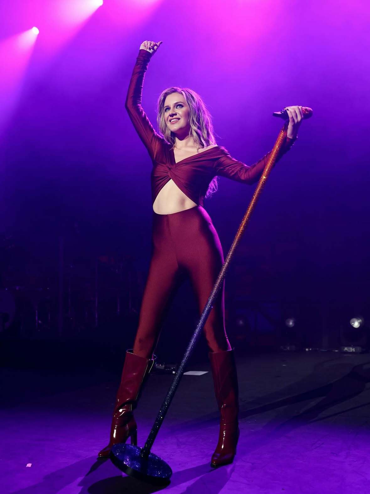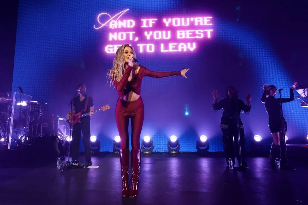 Rouge sang, rouge désir, rouge scandale : Kelsea Ballerini transforme la scène du Riviera Theatre en ring sensuel, genoux au sol, cheveux lâchés comme une sirène rock en pleine crise d’extase.