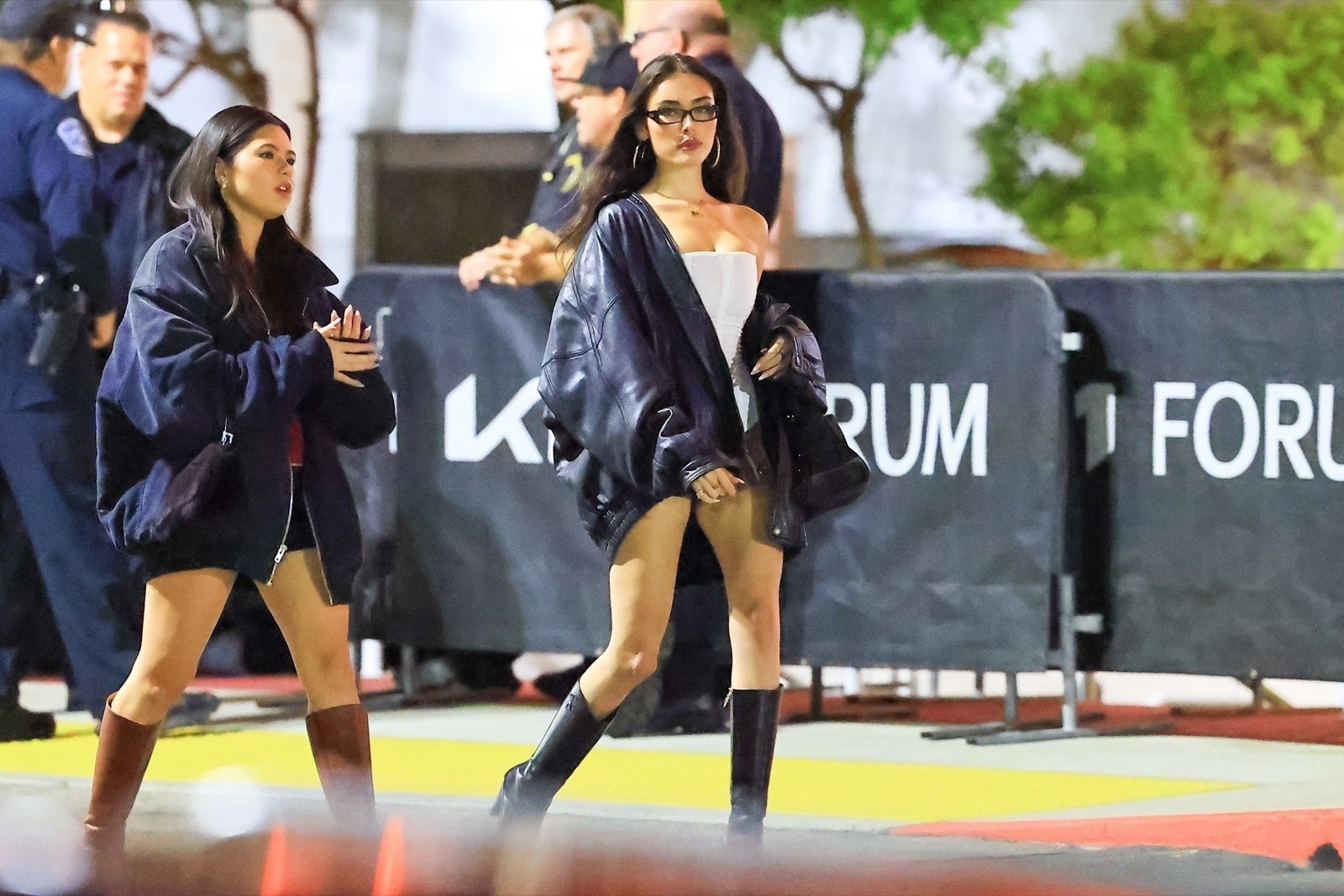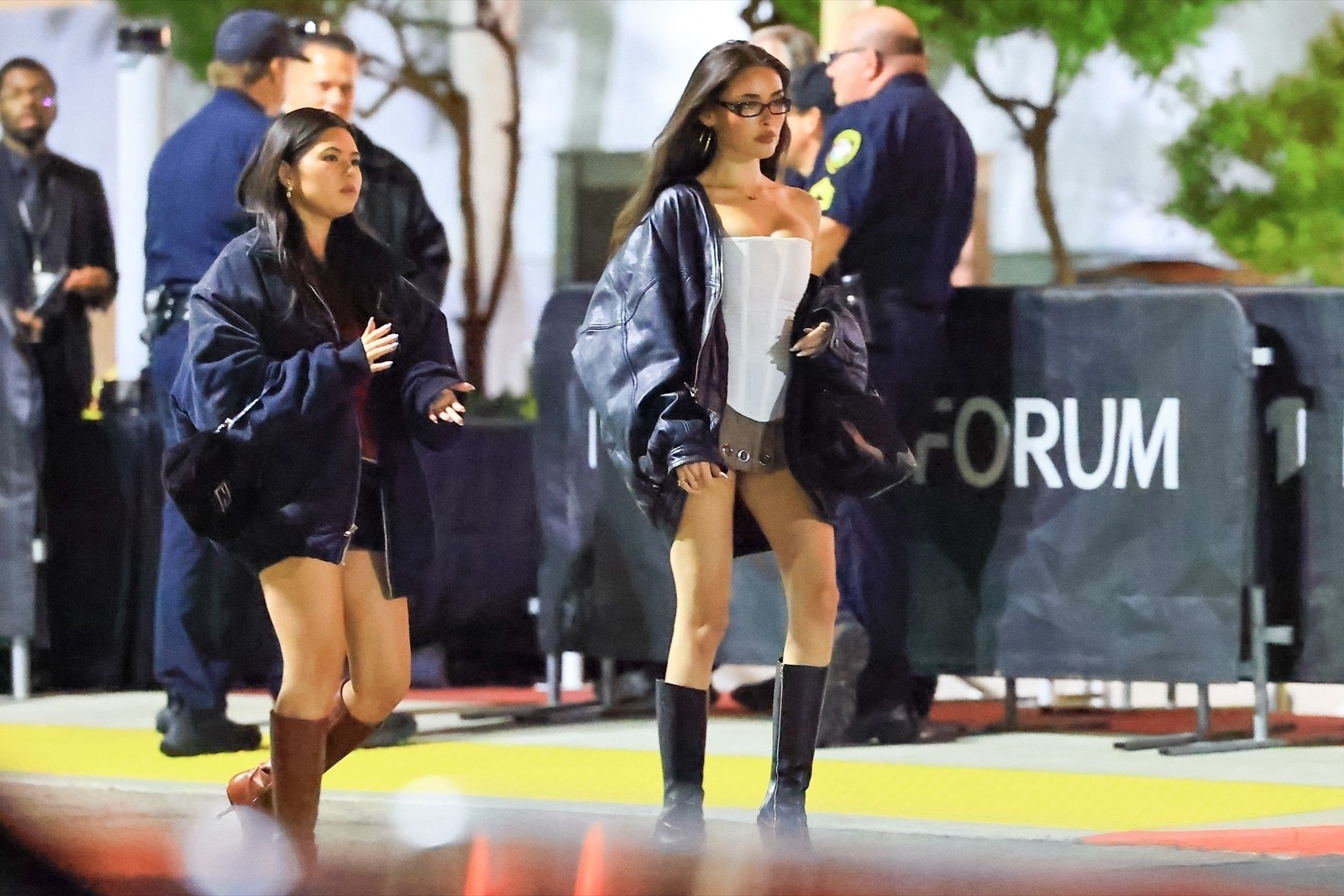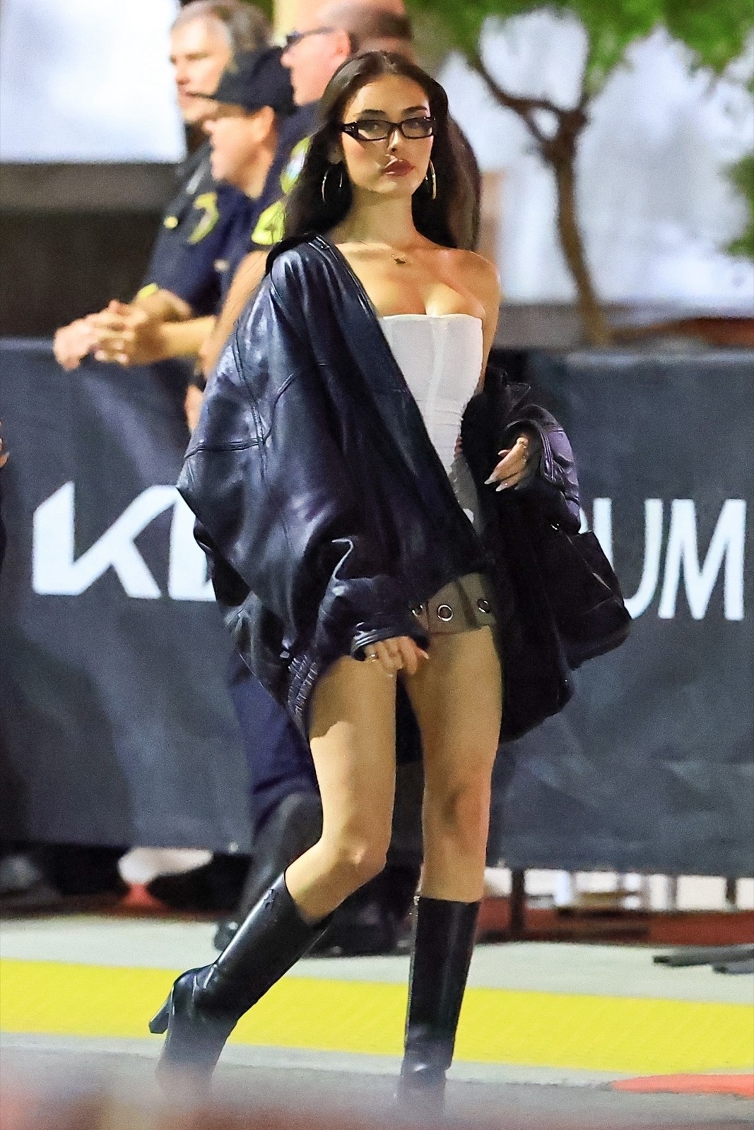 Corset serré, bottes hautes et blouson XXL, Madison transforme un concert pop en défilé sulfureux façon strip-club chic sous néons californiens.