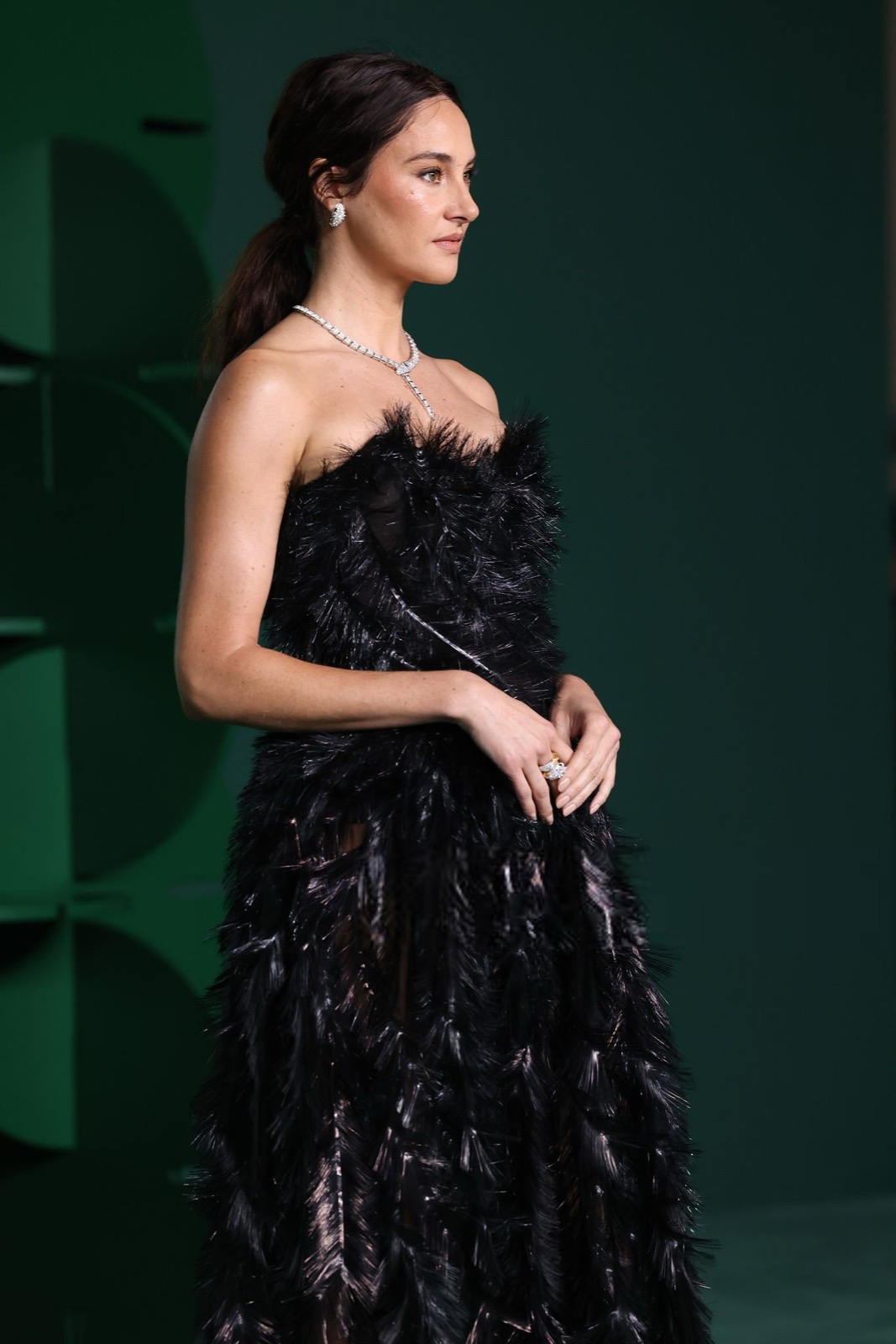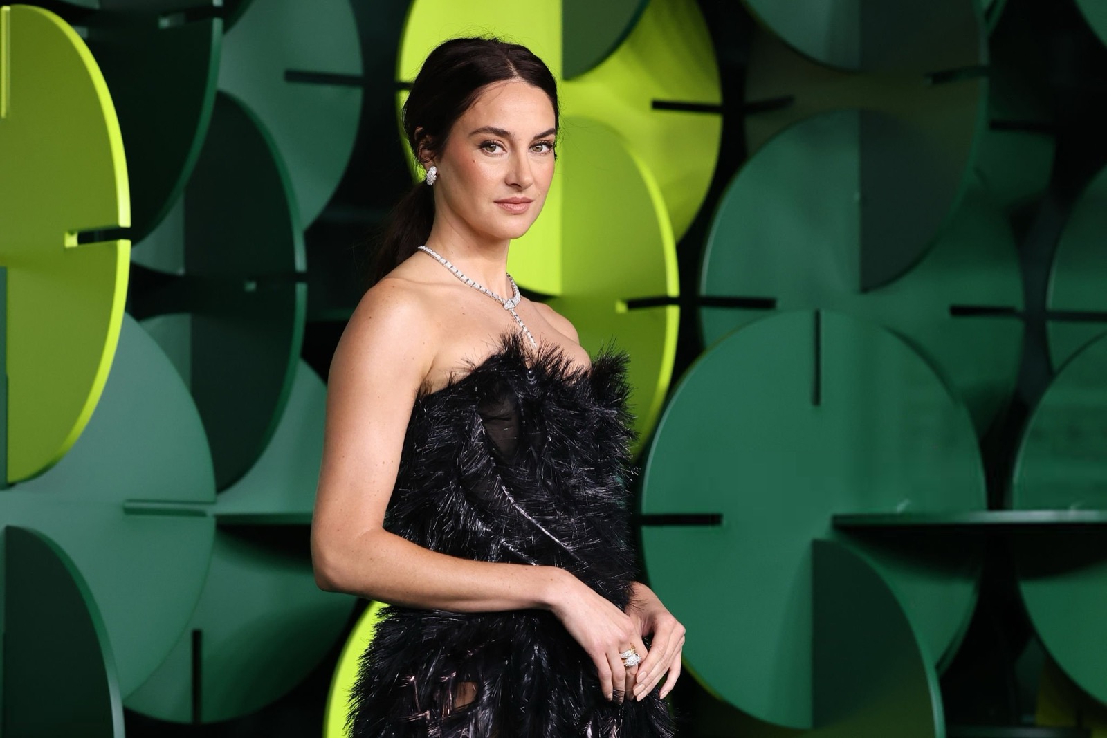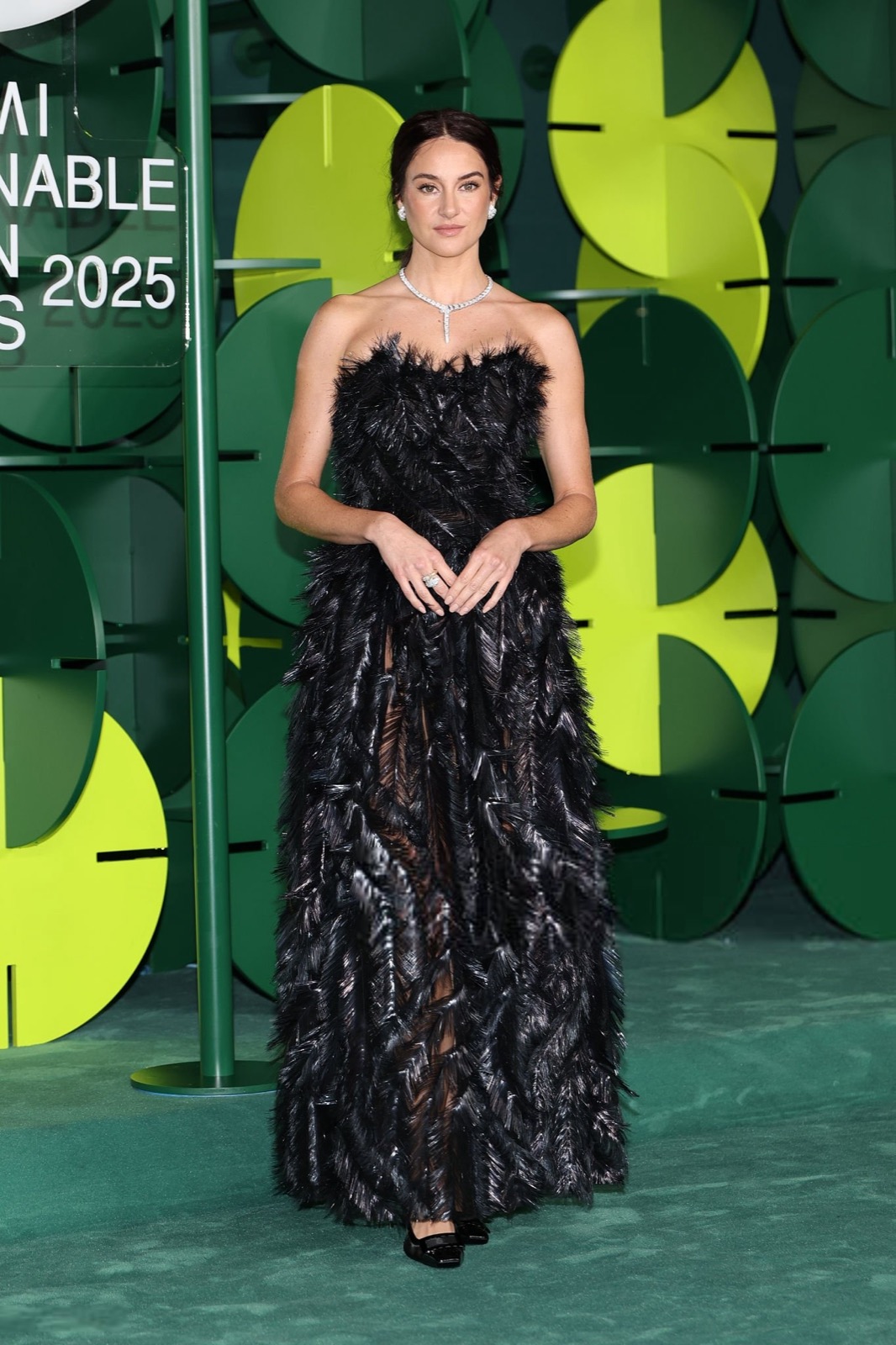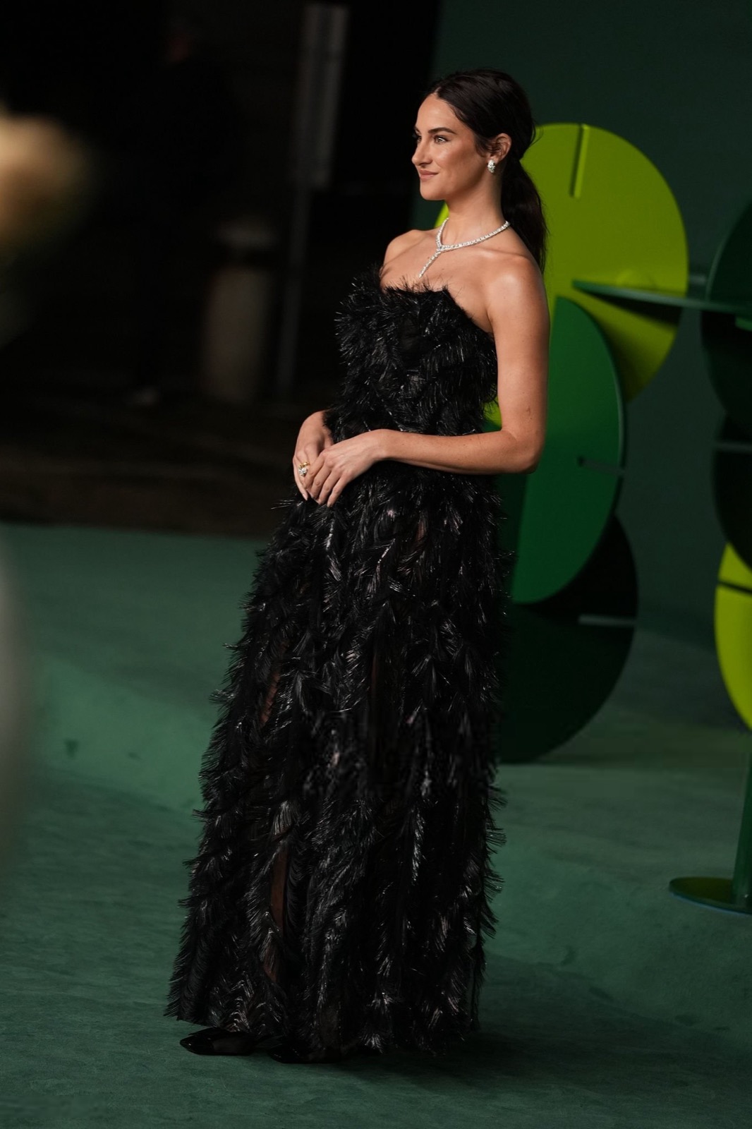 Dans sa robe de plumes noires, Shailene Woodley semble sortie d’un film noir revisité par un styliste vegan, oscillant entre diva ténébreuse et oiseau de nuit en pleine parade.