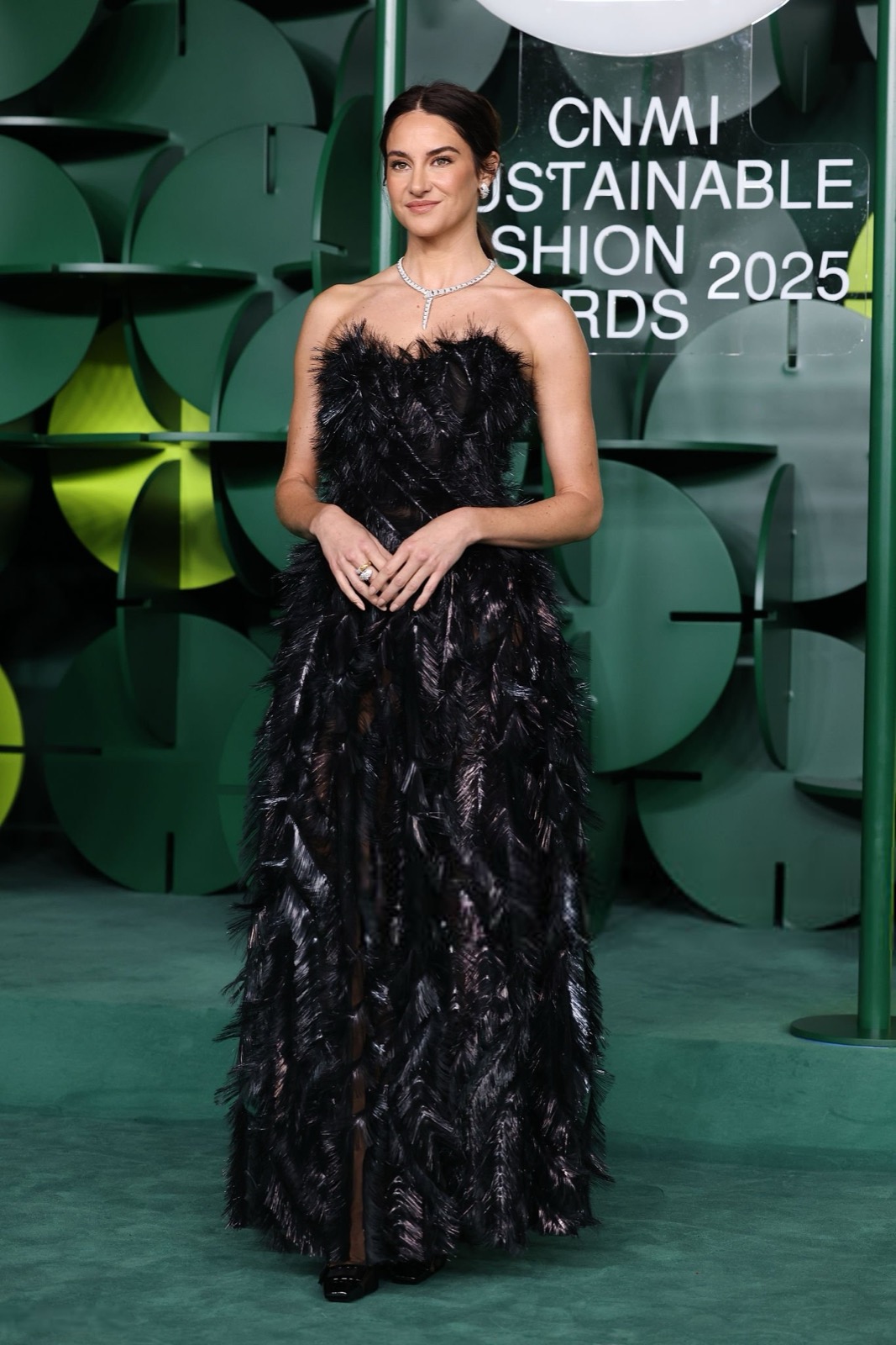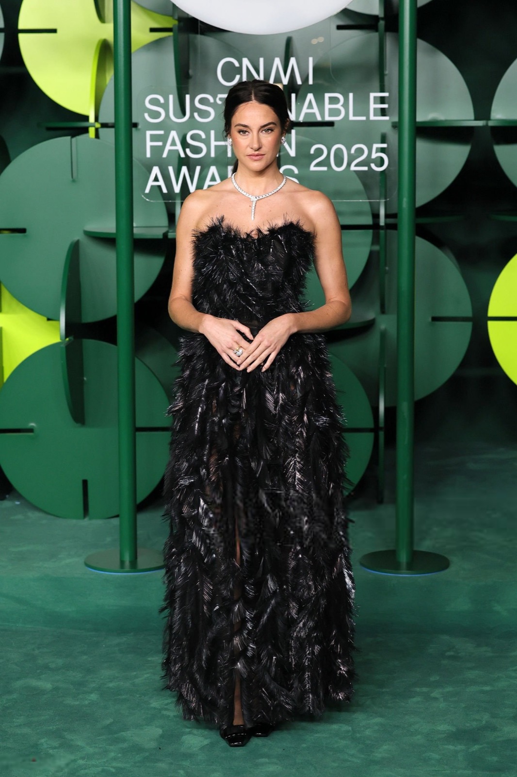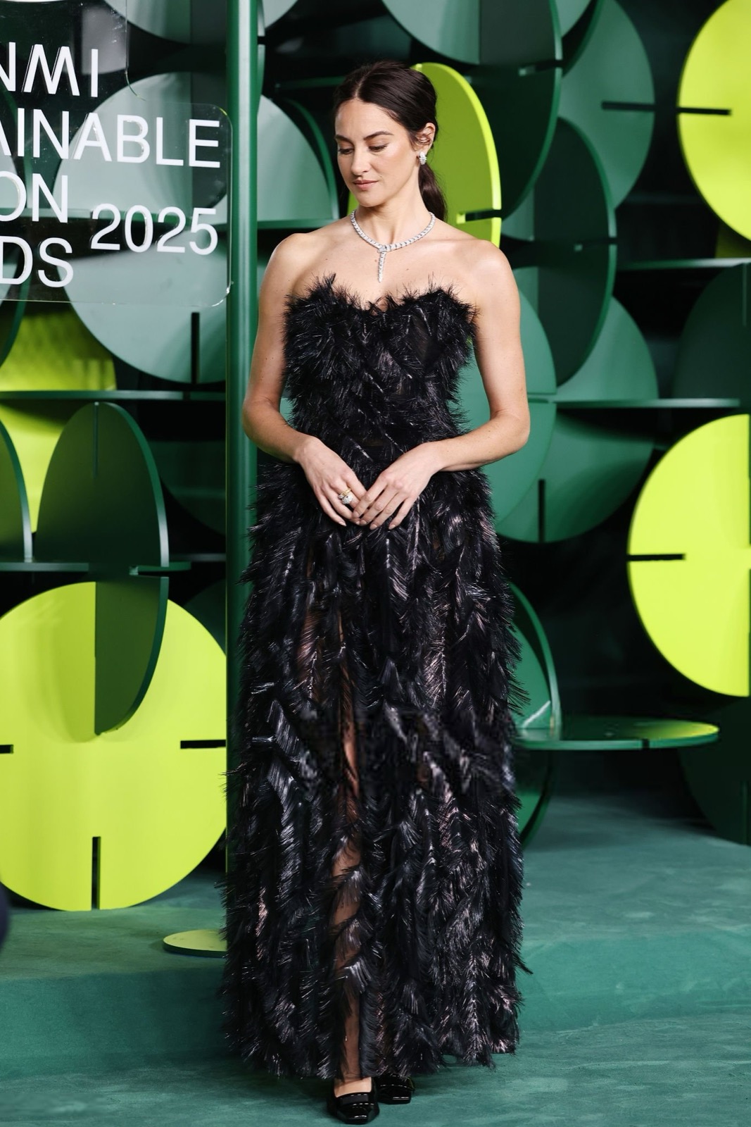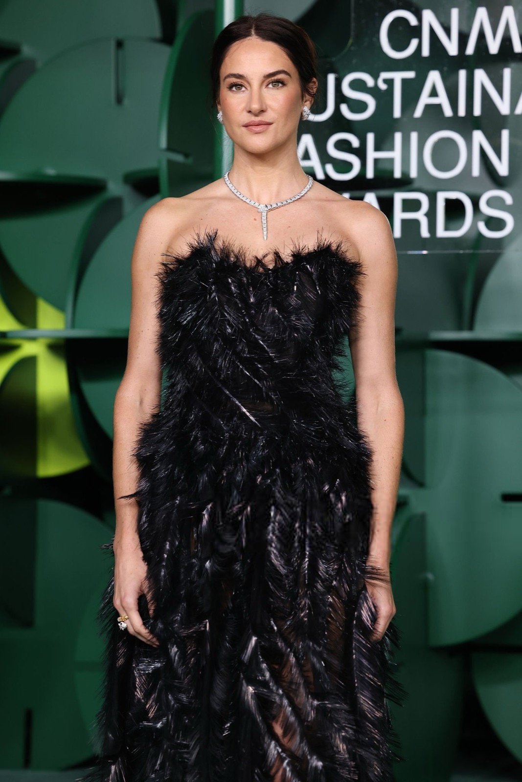 Dans sa robe de plumes noires, Shailene Woodley semble sortie d’un film noir revisité par un styliste vegan, oscillant entre diva ténébreuse et oiseau de nuit en pleine parade.