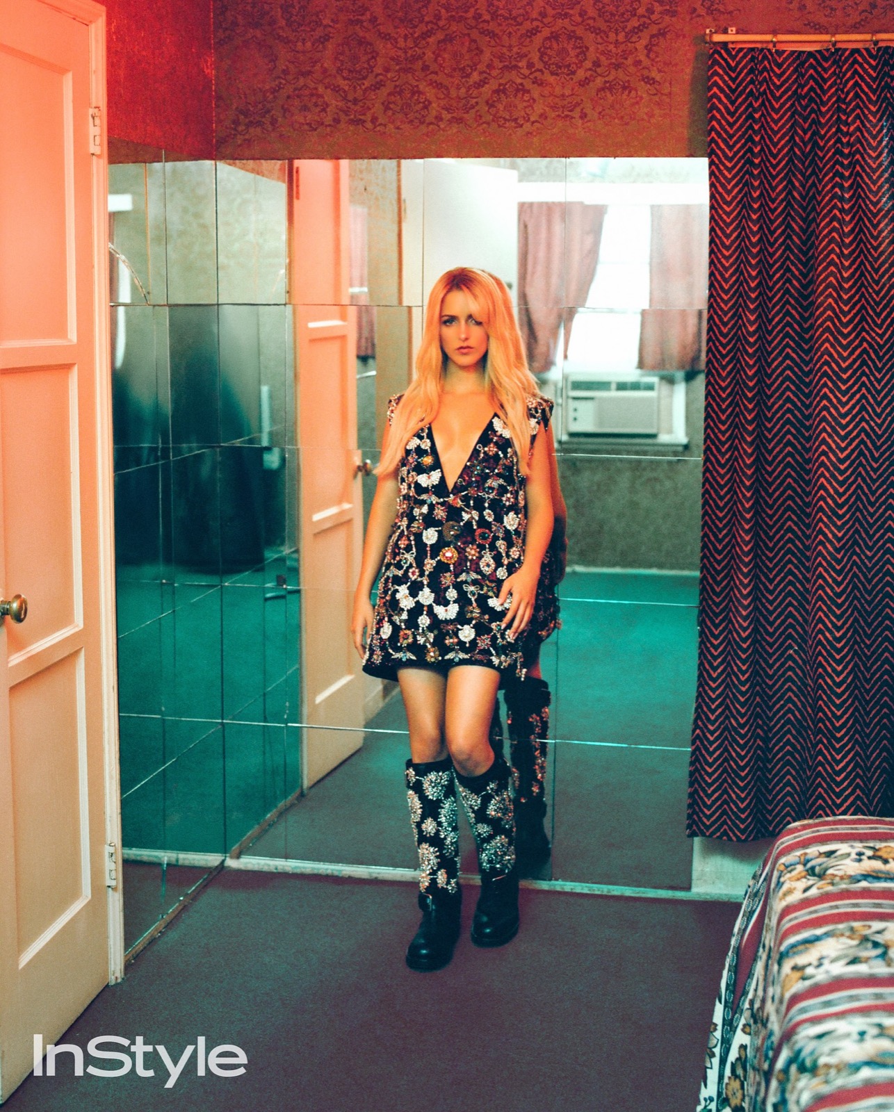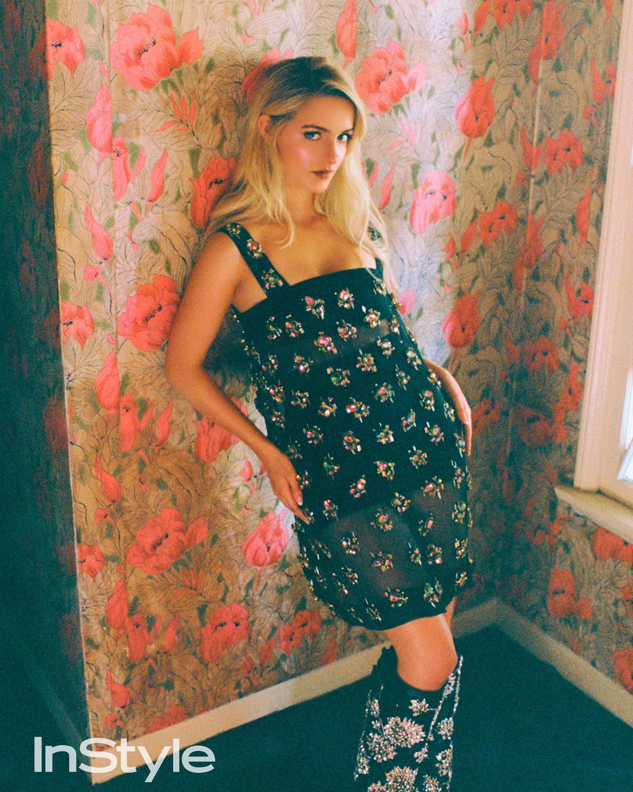 Dans une robe fleurie brodée, elle se colle contre un papier peint fané comme une héroïne de soap qui a trop lu InStyle. L’attitude ? Un mélange d’innocence feinte et de provocation calculée.
