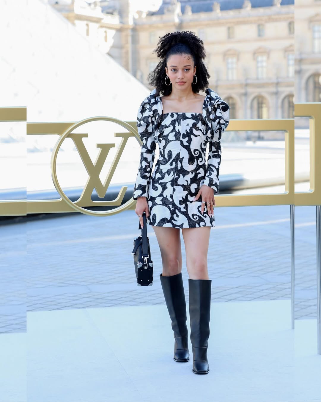 Devant la pyramide de verre, son sac rigide devient sceptre ironique : qui aurait cru que le cube le plus sexy de la semaine serait signé Louis Vuitton ?