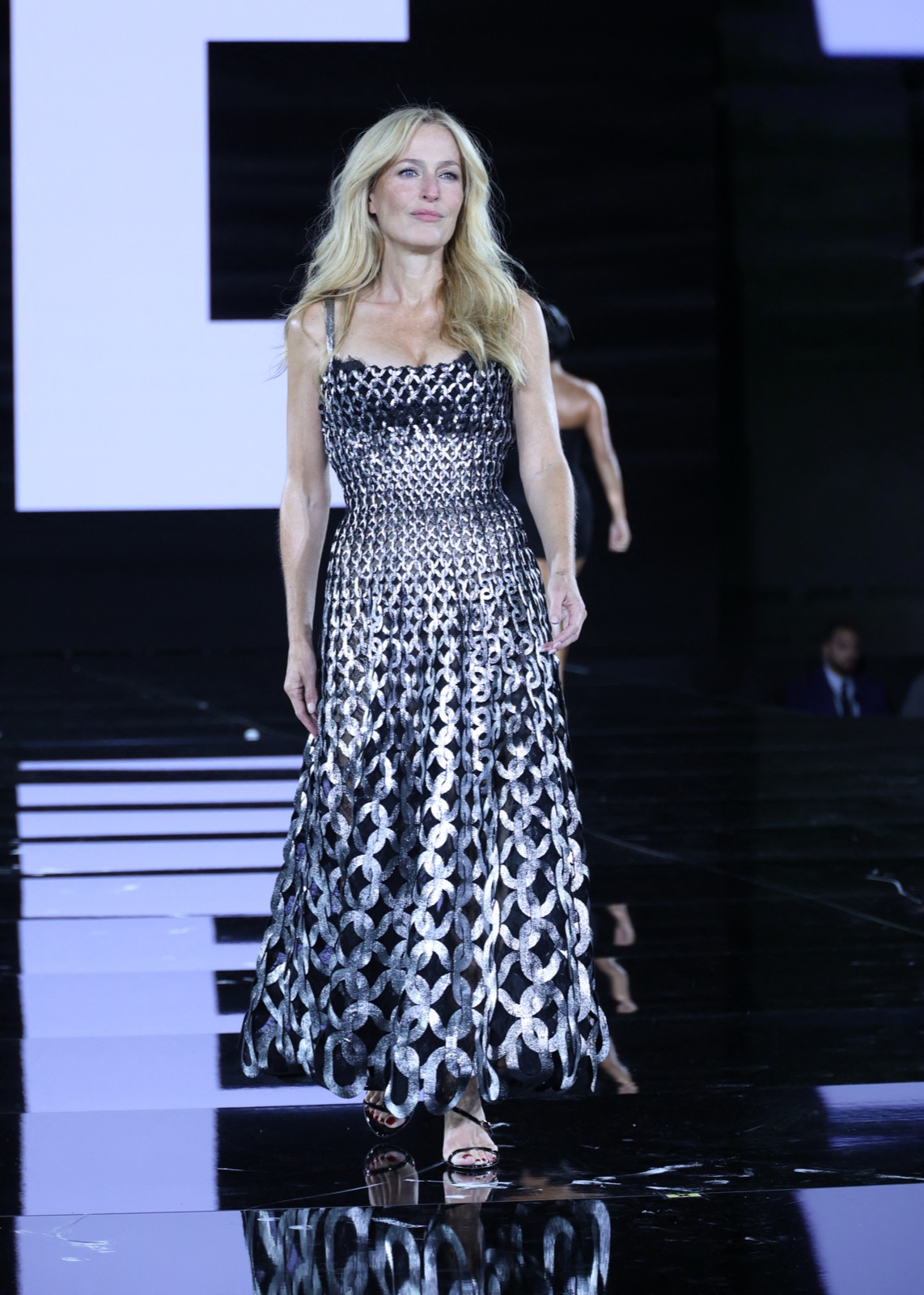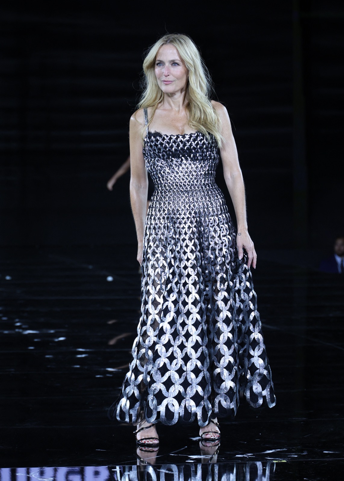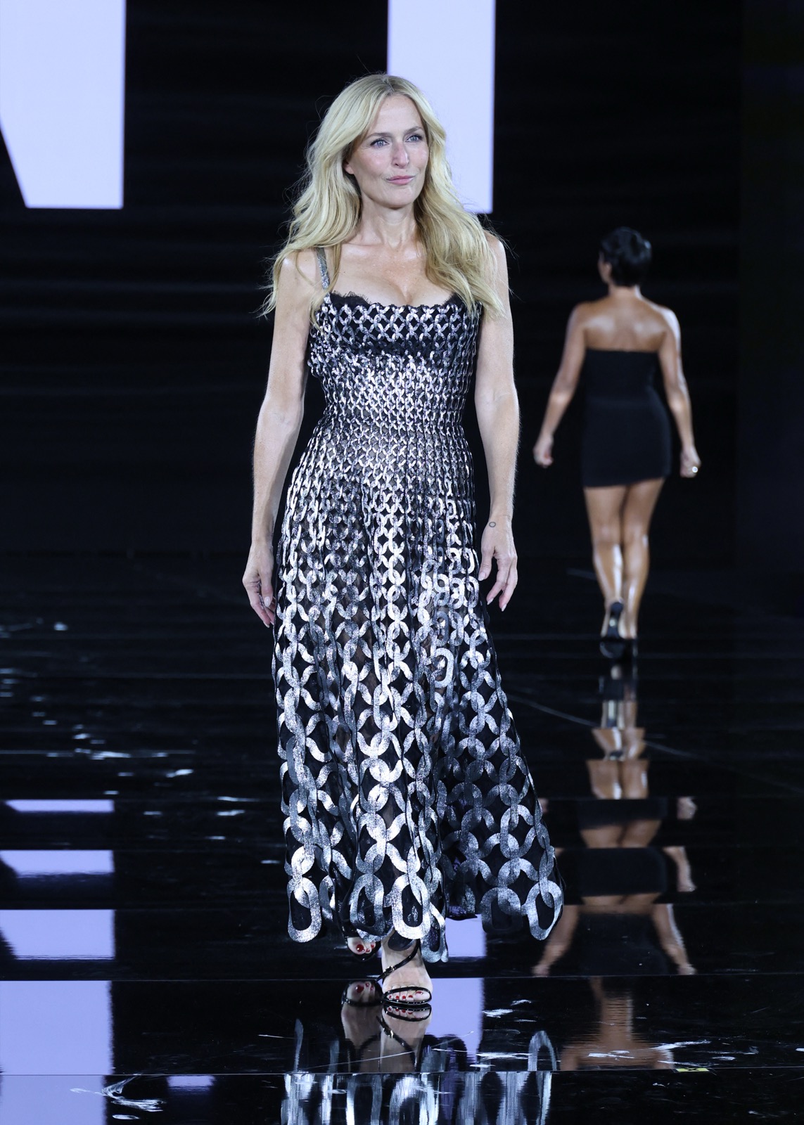 Gillian Anderson en déesse métallique au défilé L’Oréal à Paris