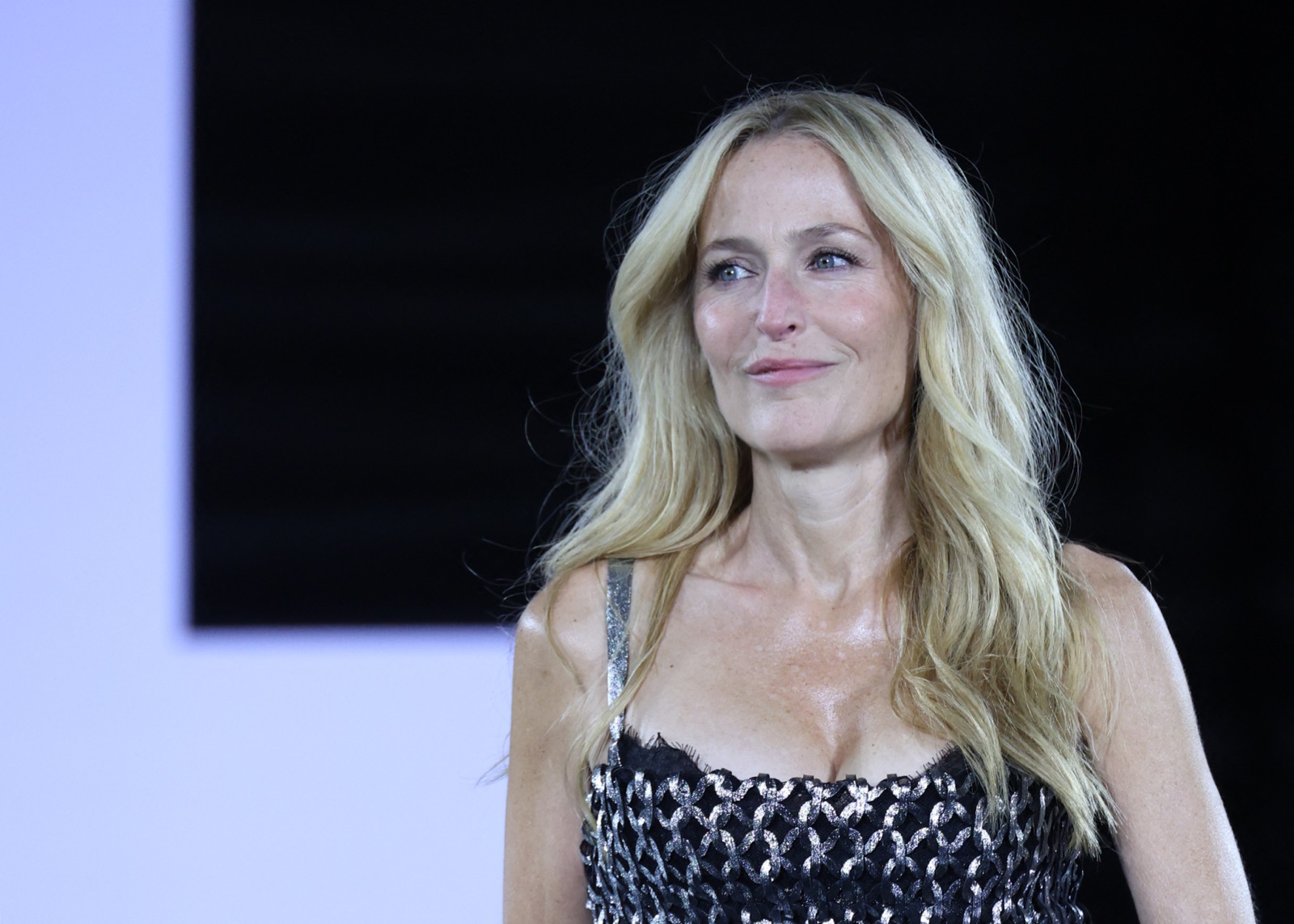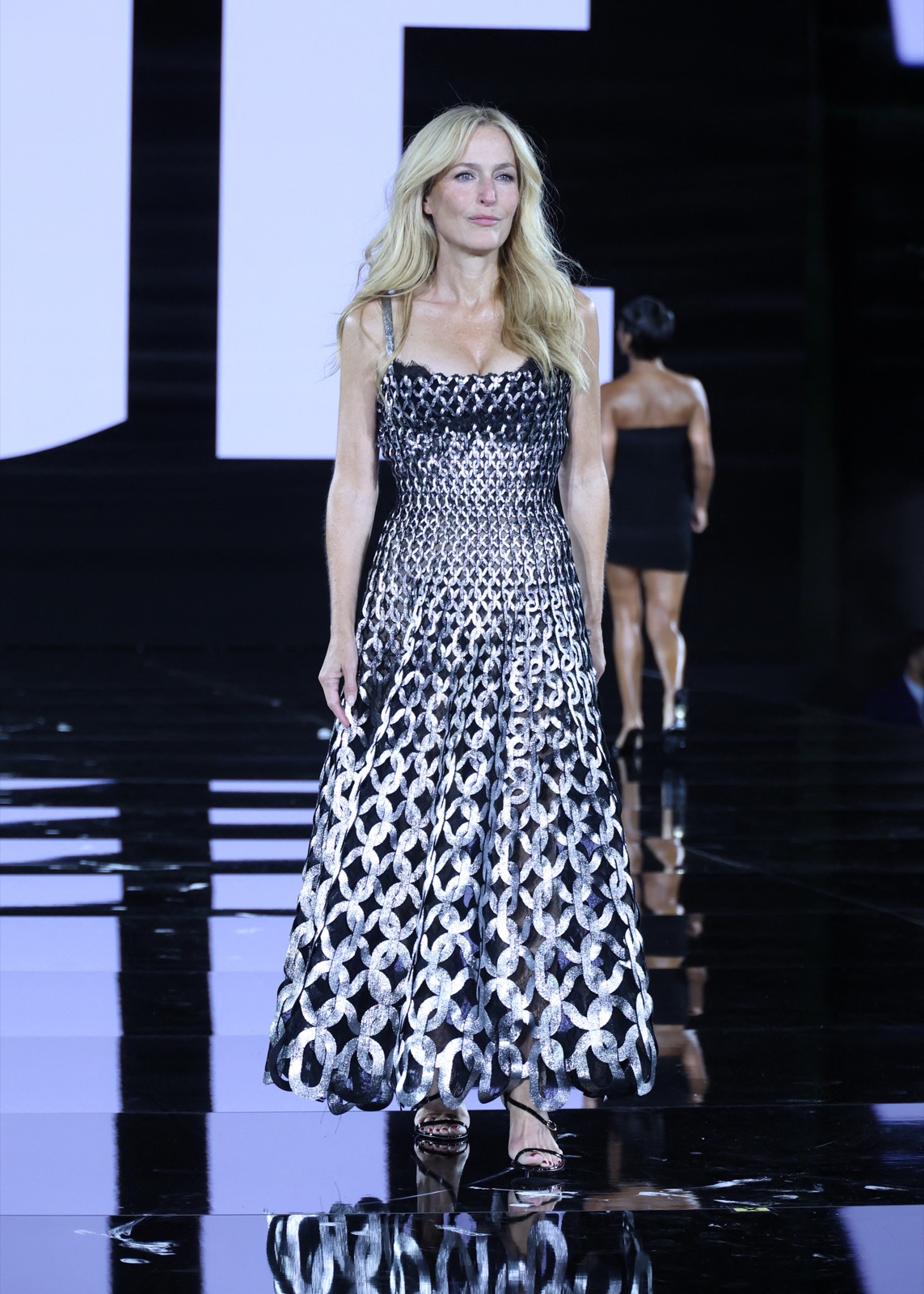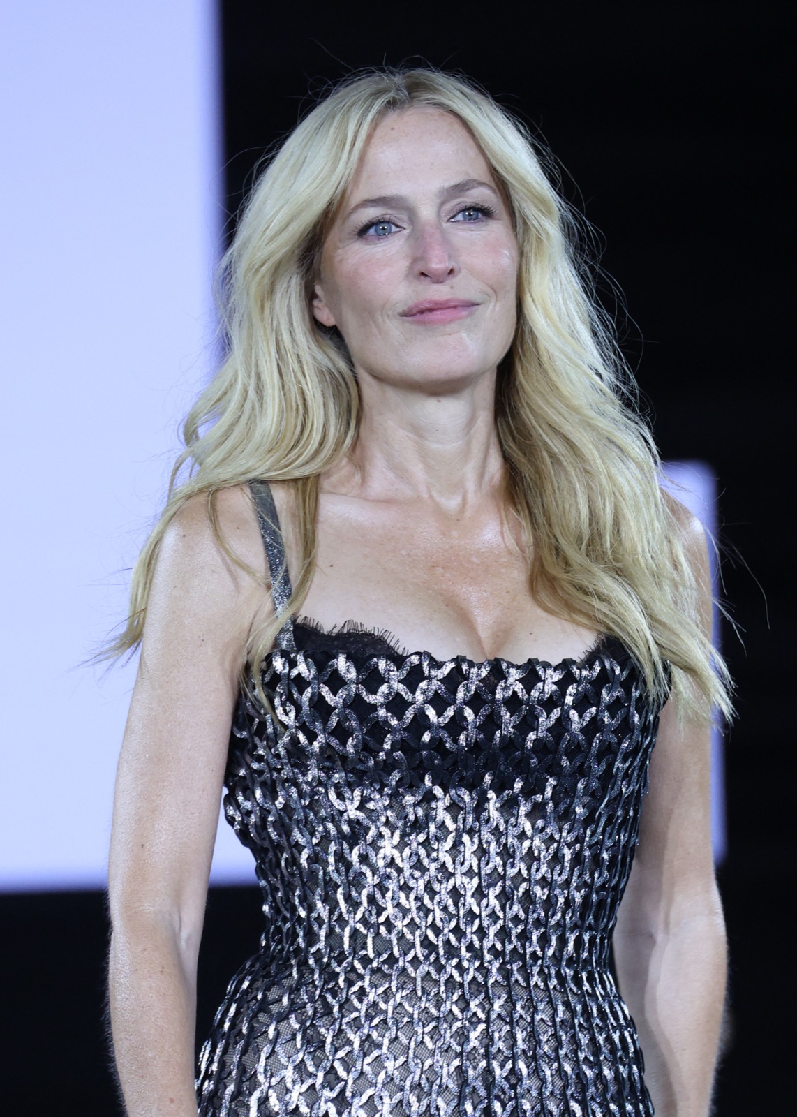 Gillian Anderson en déesse métallique au défilé L’Oréal à Paris