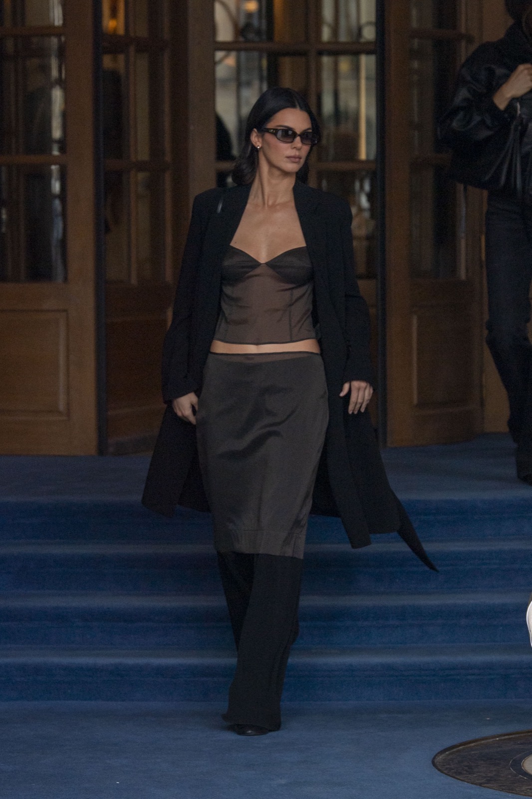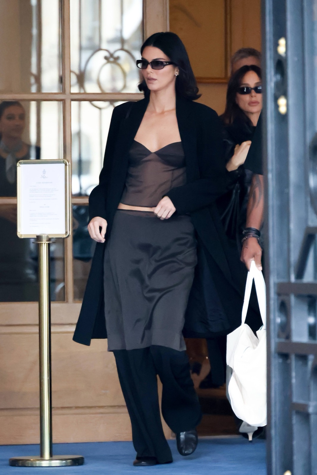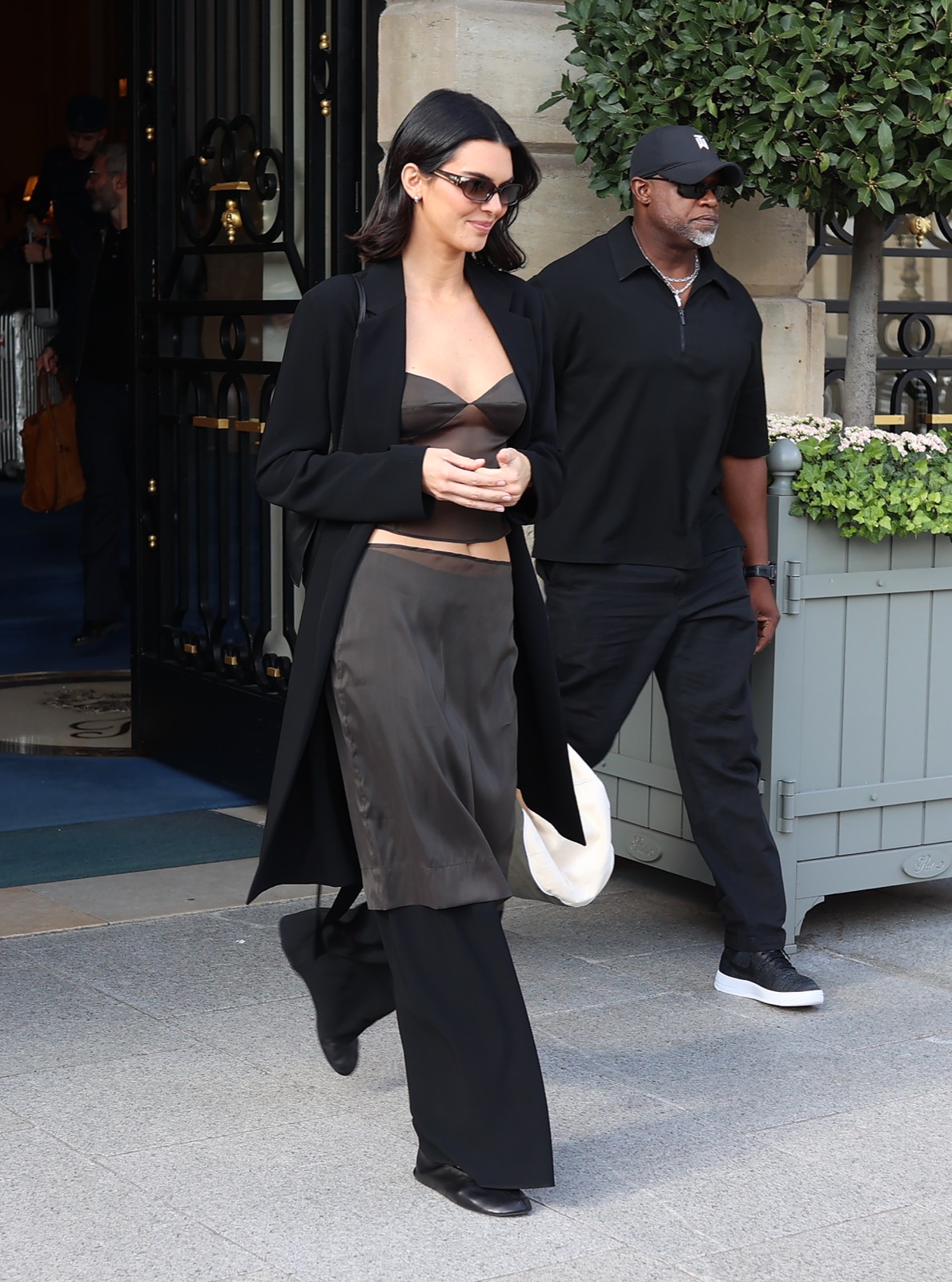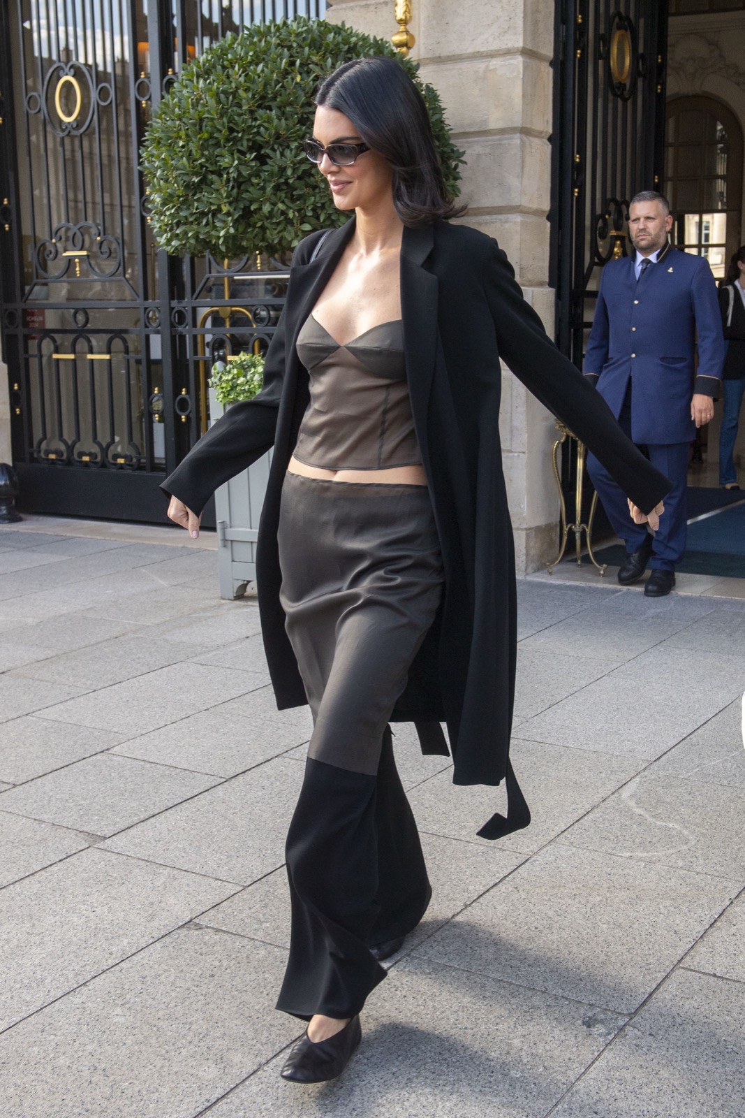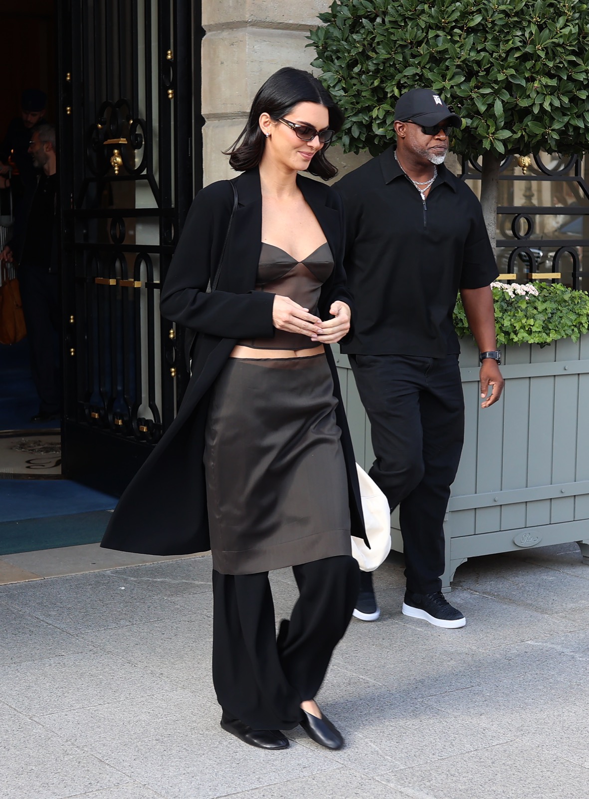 Un bustier brun translucide, une jupe satinée flottante et des lunettes noires façon espionne sensuelle : voilà comment Kendall Jenner quitte le Ritz Hotel, comme si elle s’évadait d’un film interdit. Tout semble étudié, même l’illusion d’un oubli de soutien-gorge, orchestrée comme un manifeste de provocation chic.