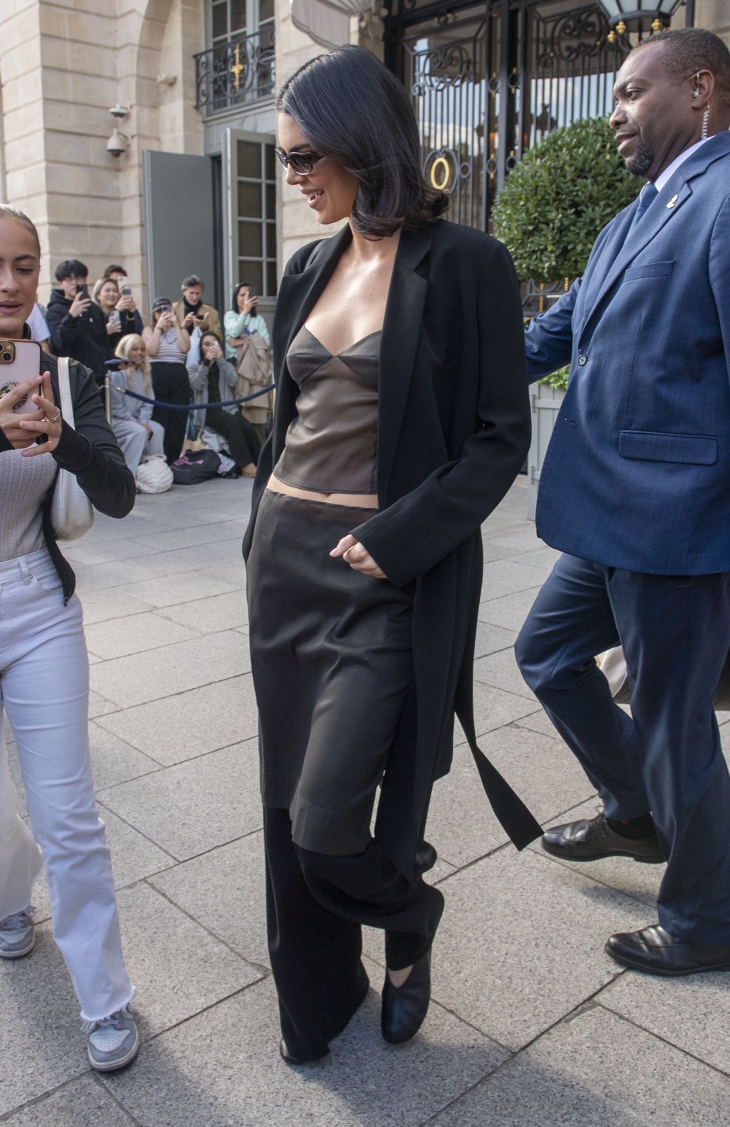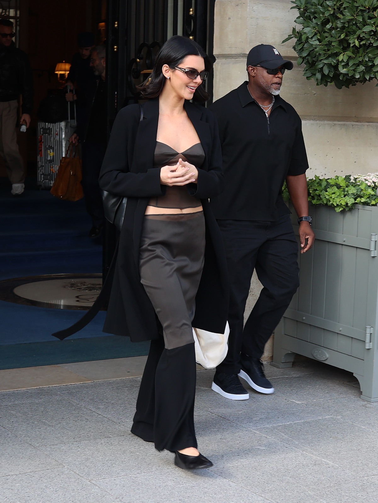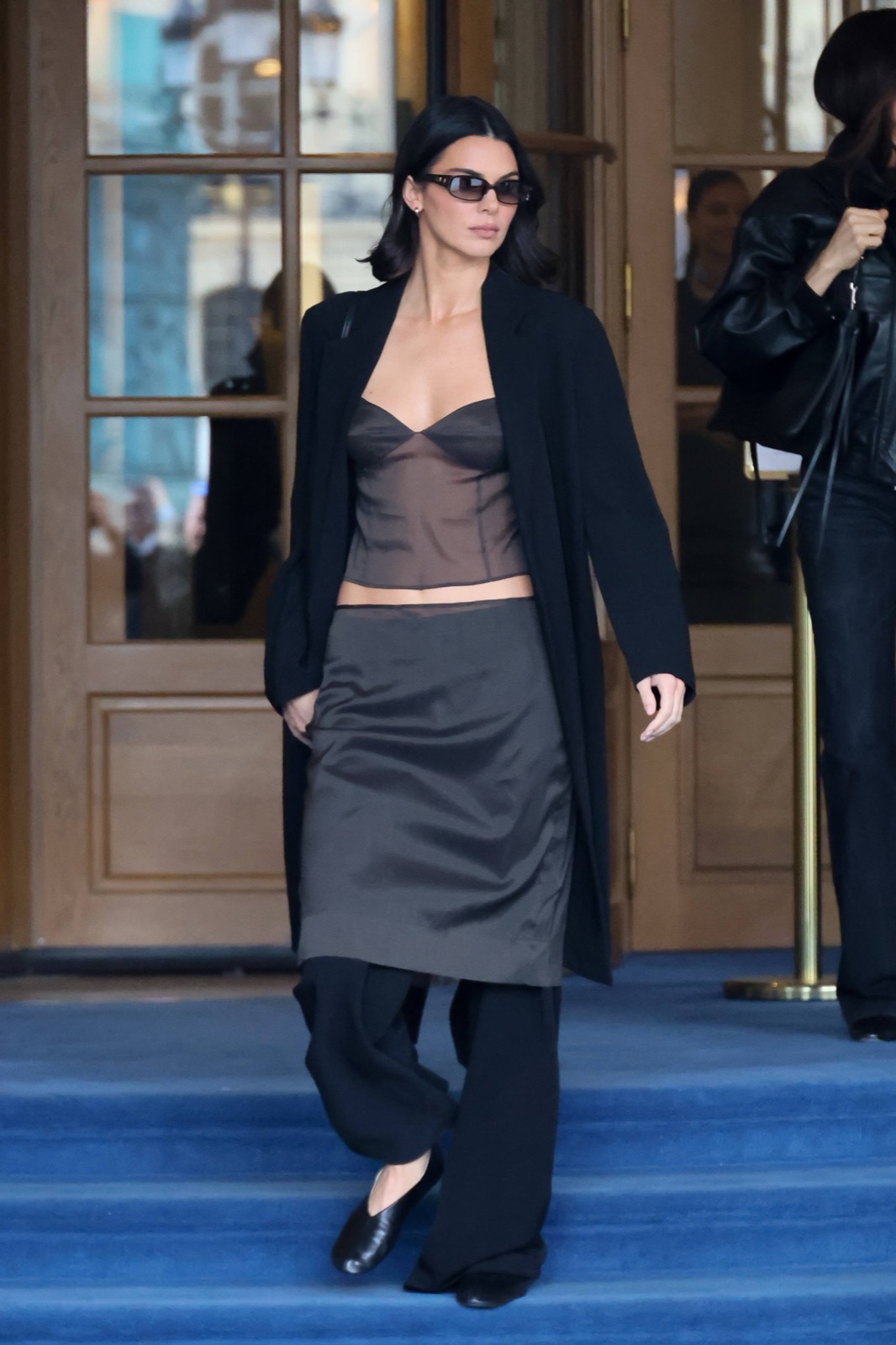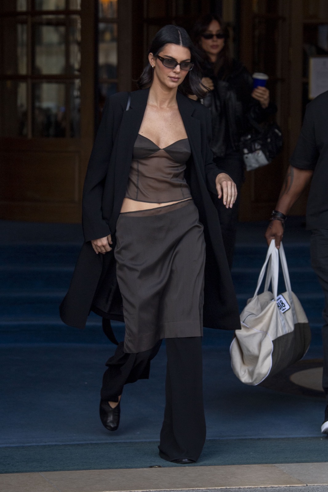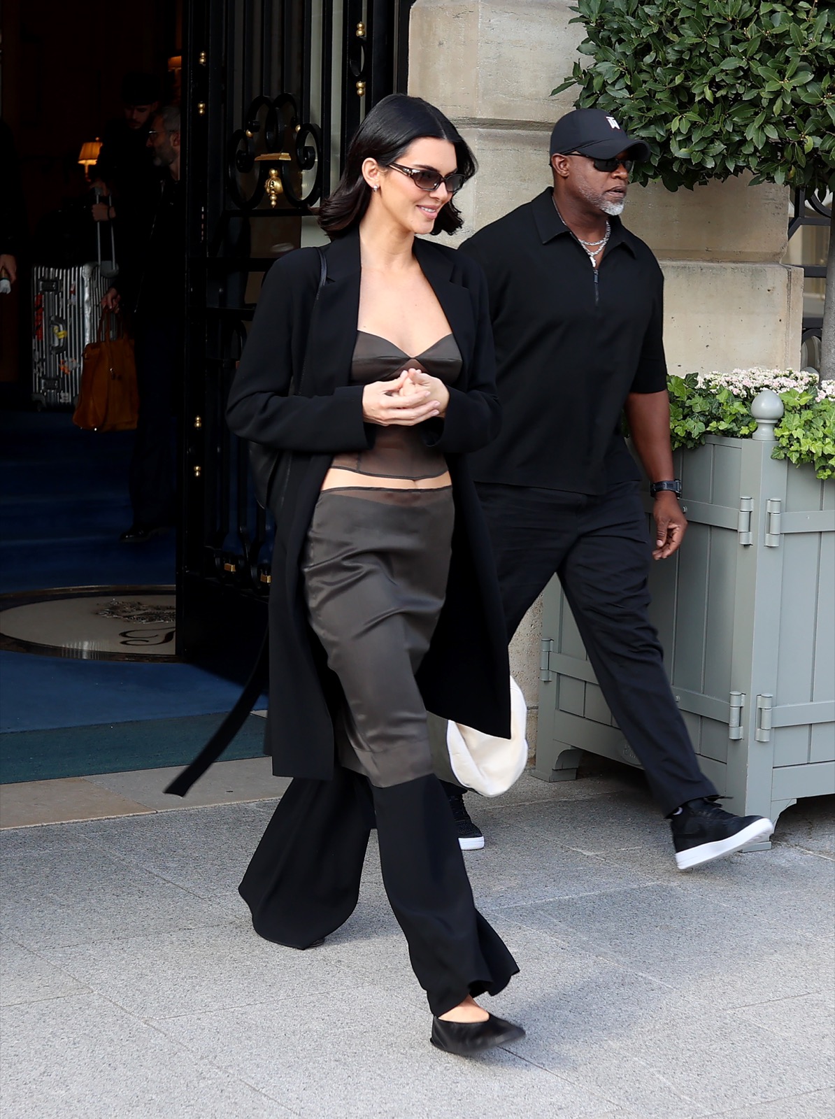 Un bustier brun translucide, une jupe satinée flottante et des lunettes noires façon espionne sensuelle : voilà comment Kendall Jenner quitte le Ritz Hotel, comme si elle s’évadait d’un film interdit. Tout semble étudié, même l’illusion d’un oubli de soutien-gorge, orchestrée comme un manifeste de provocation chic.