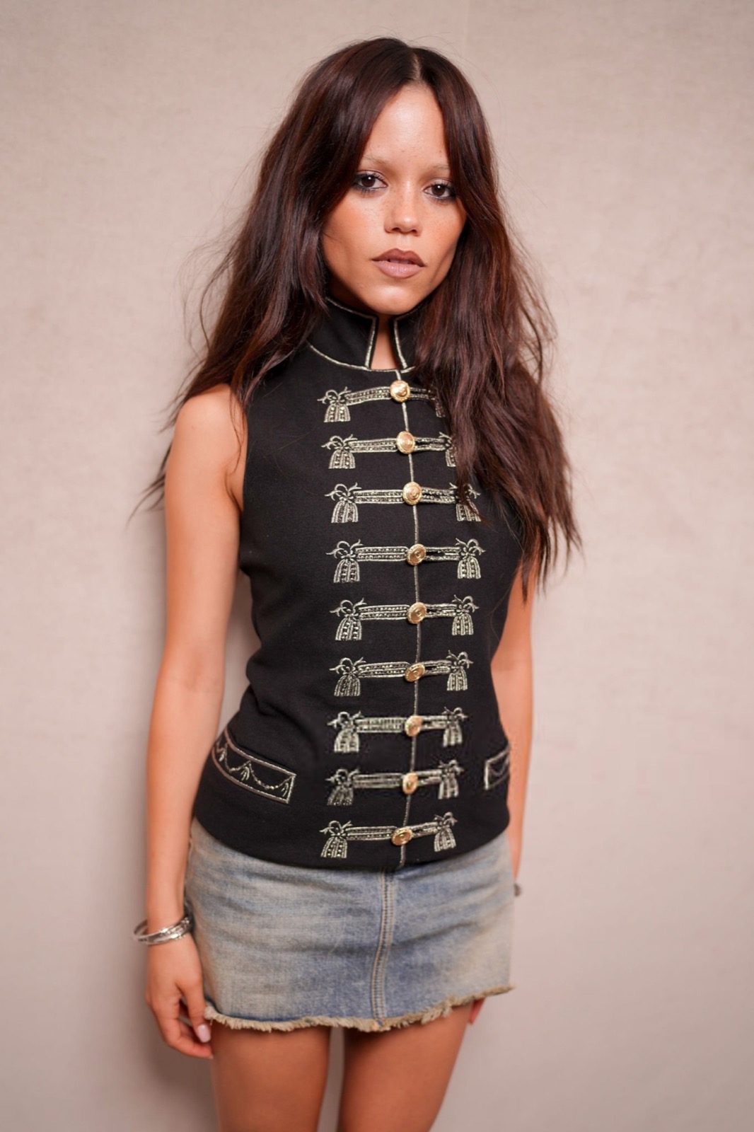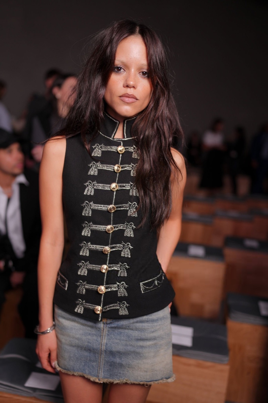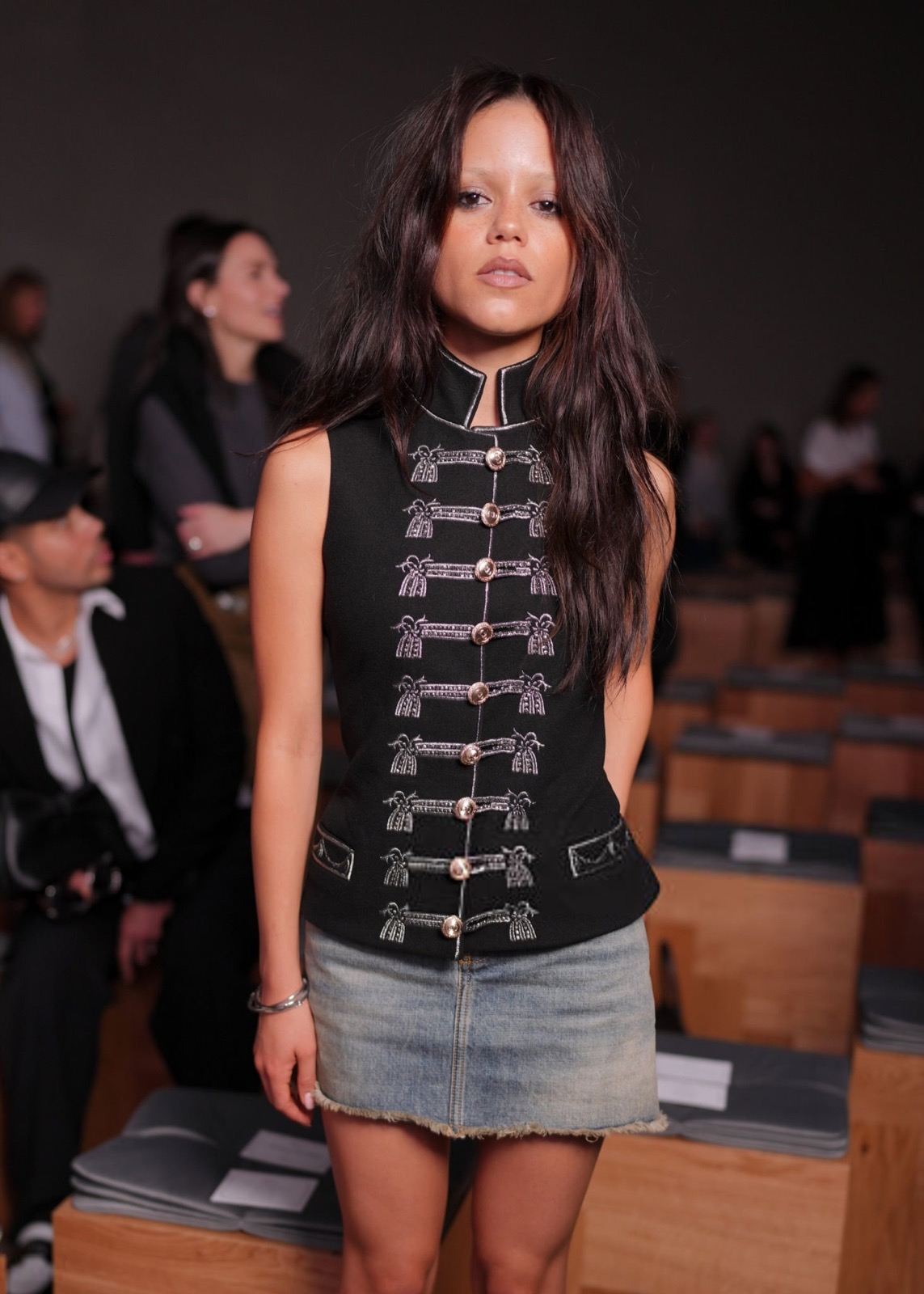 Veste officier cloutée, mini-jupe effilochée et regard qui dit « je ne souris que sous contrat », Jenna Ortega transforme le défilé Christian Dior en caserne chic et sulfureuse. Un uniforme de séduction, version colonel de la tentation.