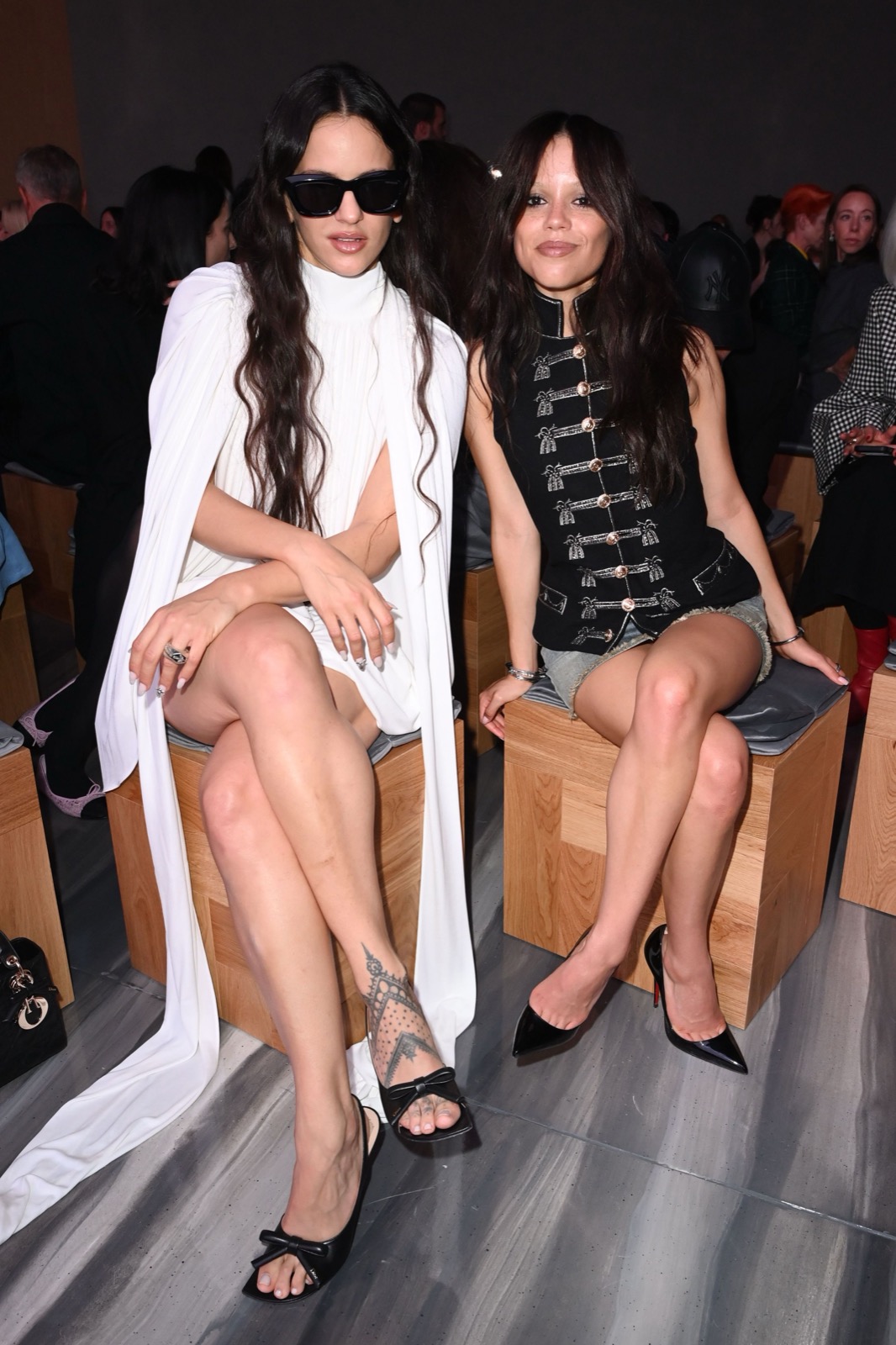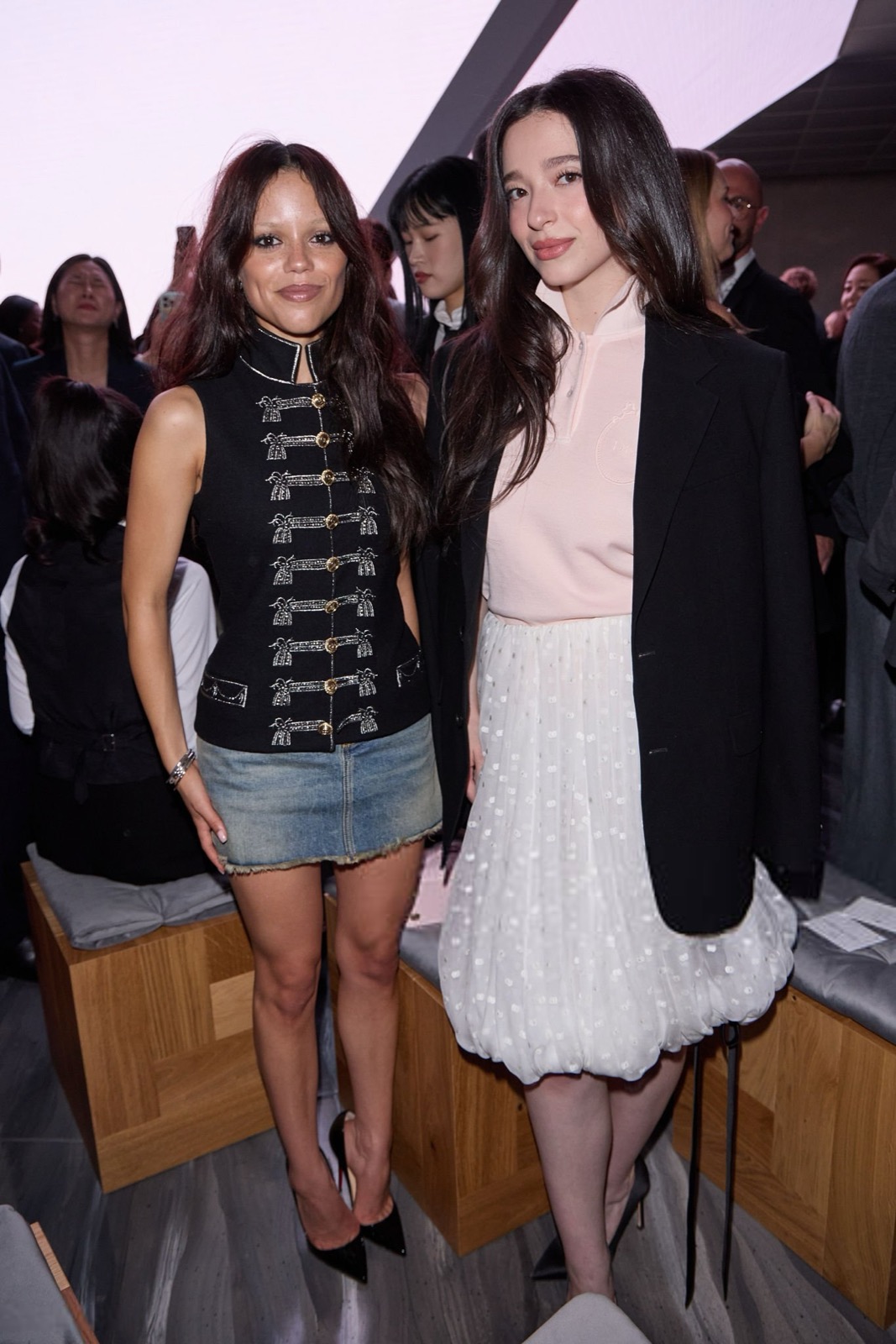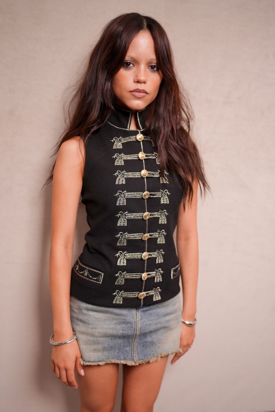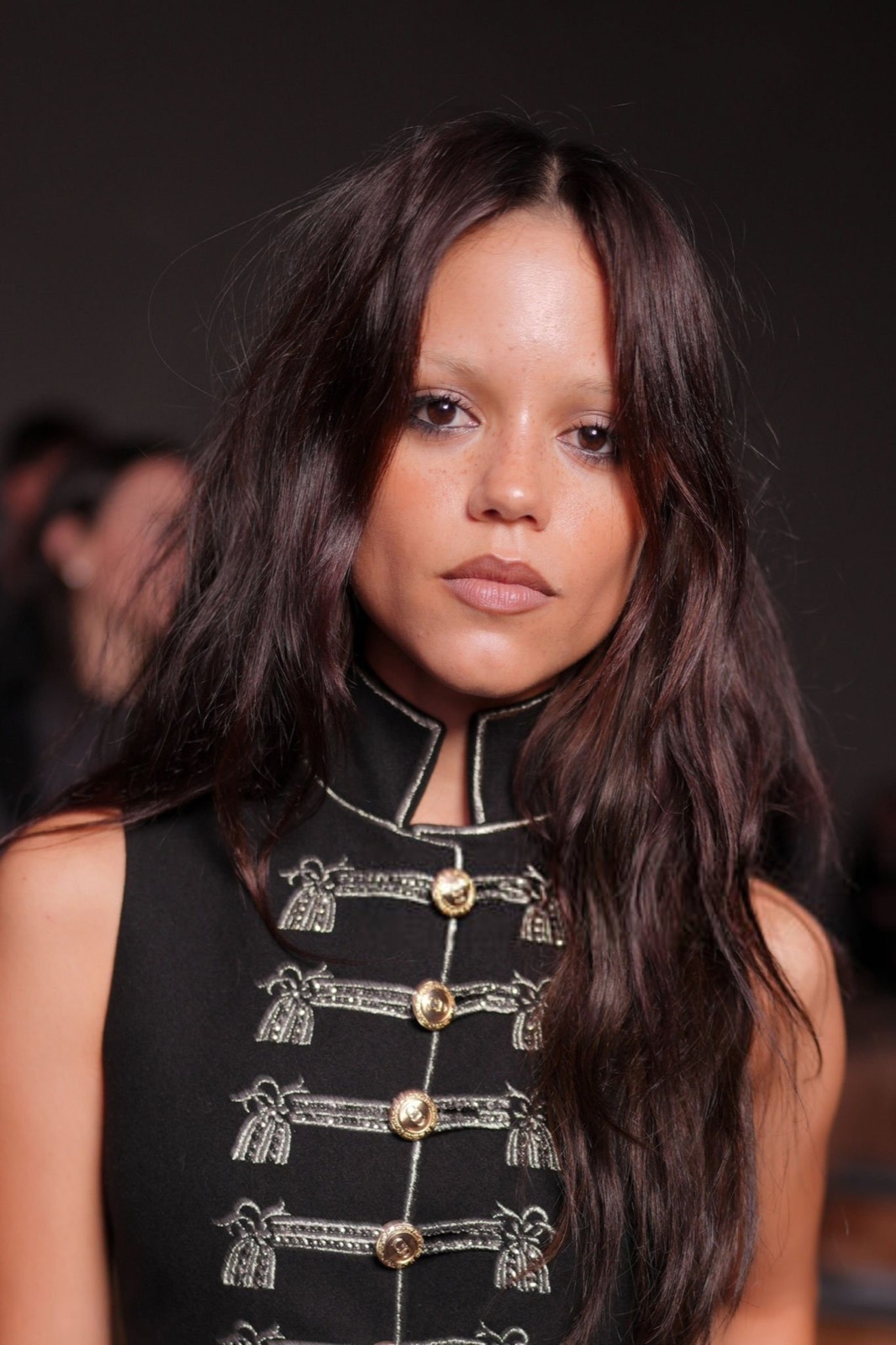 Veste officier cloutée, mini-jupe effilochée et regard qui dit « je ne souris que sous contrat », Jenna Ortega transforme le défilé Christian Dior en caserne chic et sulfureuse. Un uniforme de séduction, version colonel de la tentation.
