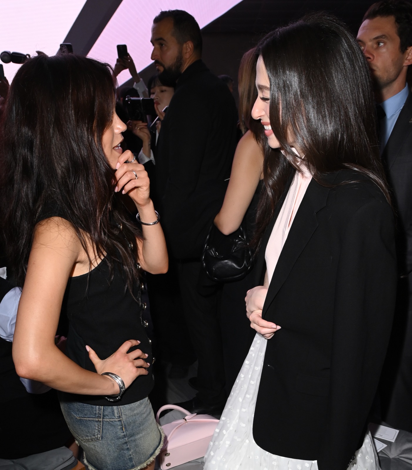 Cheveux en bataille soigneusement calculée, lèvres figées façon film noir, elle impose un style qui sent plus le rock que la couture sage. À côté des mannequins dociles, elle ressemble à une héroïne rebelle sortie d’une série en streaming interdit aux mineurs.