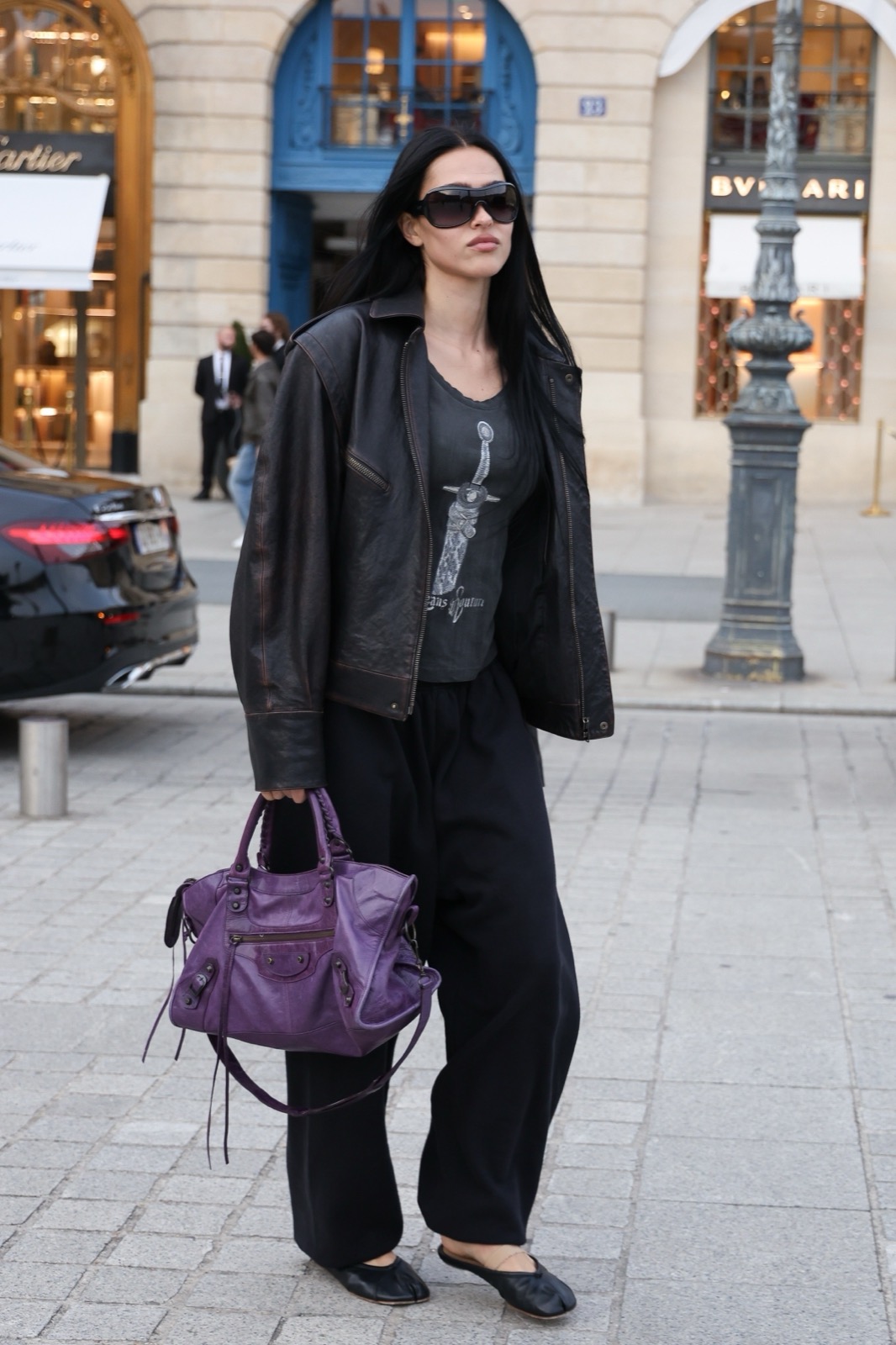 Blouson en cuir, lunettes XXL et allure d’espionne fashion, Amelia transforme la Place Vendôme en décor de film noir où les héroïnes portent du Balenciaga au lieu d’un alibi.