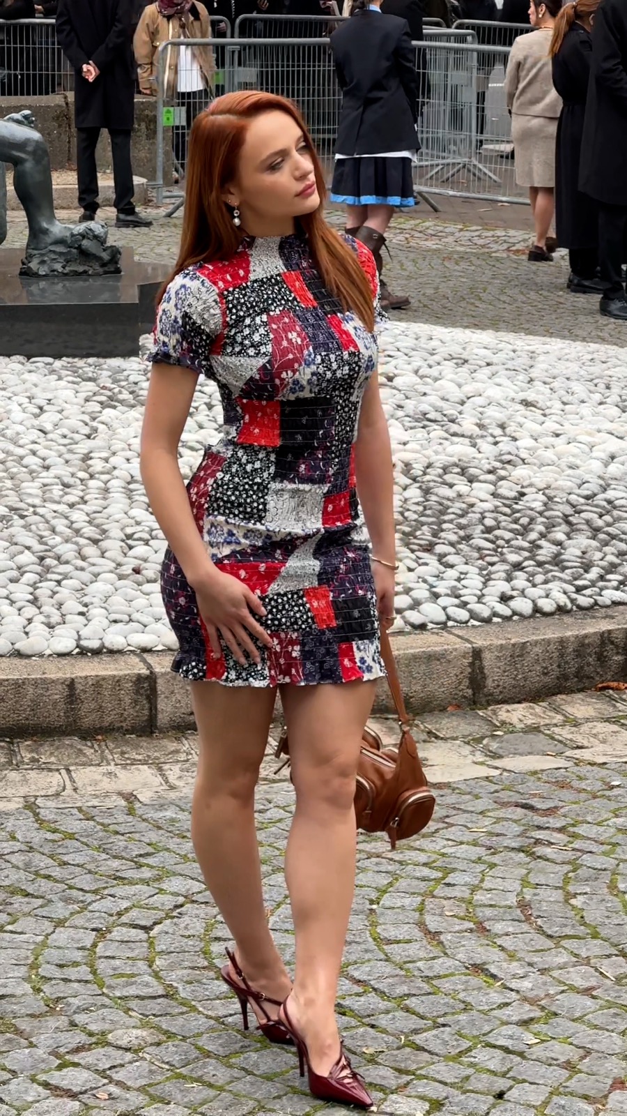 Mini-robe patchée façon puzzle sensuel, talons vernis rouge tentation et regard d’acier : Joey joue la poupée fatale de Miu Miu.