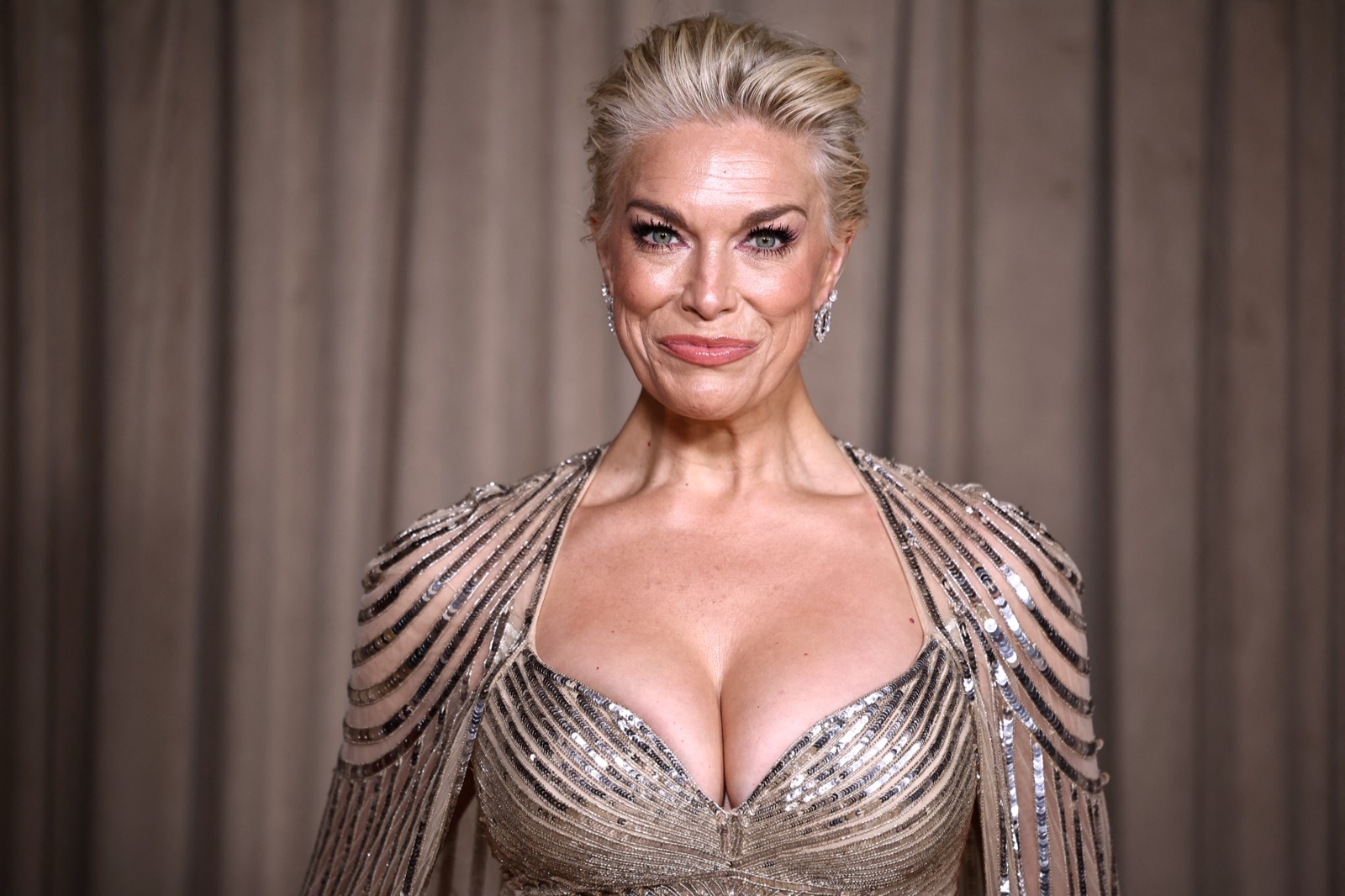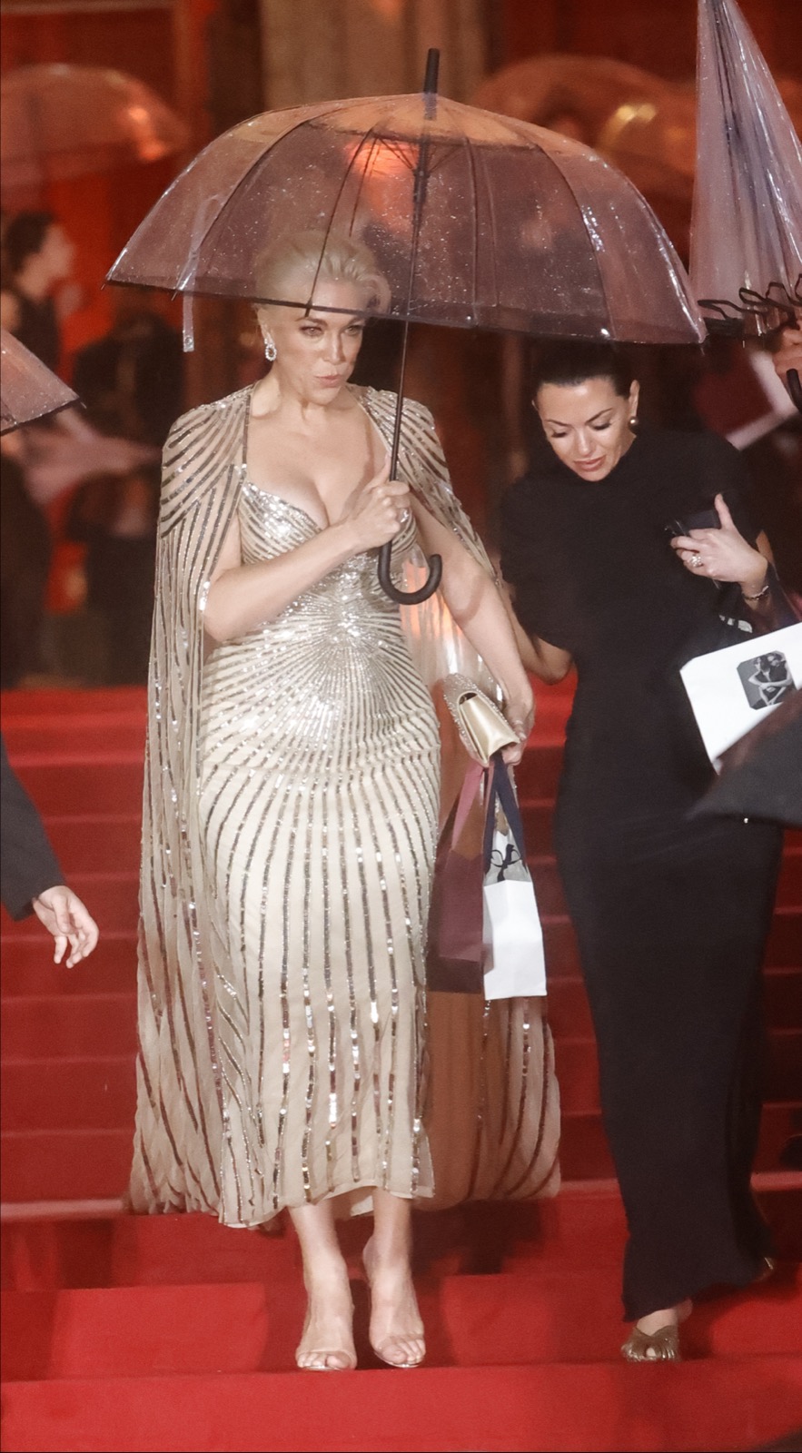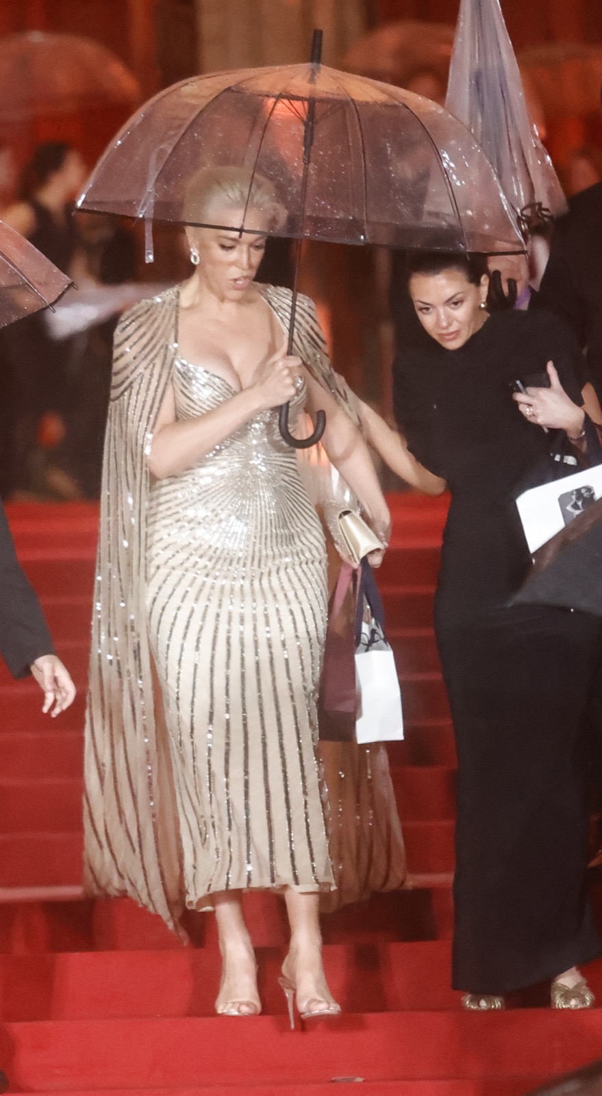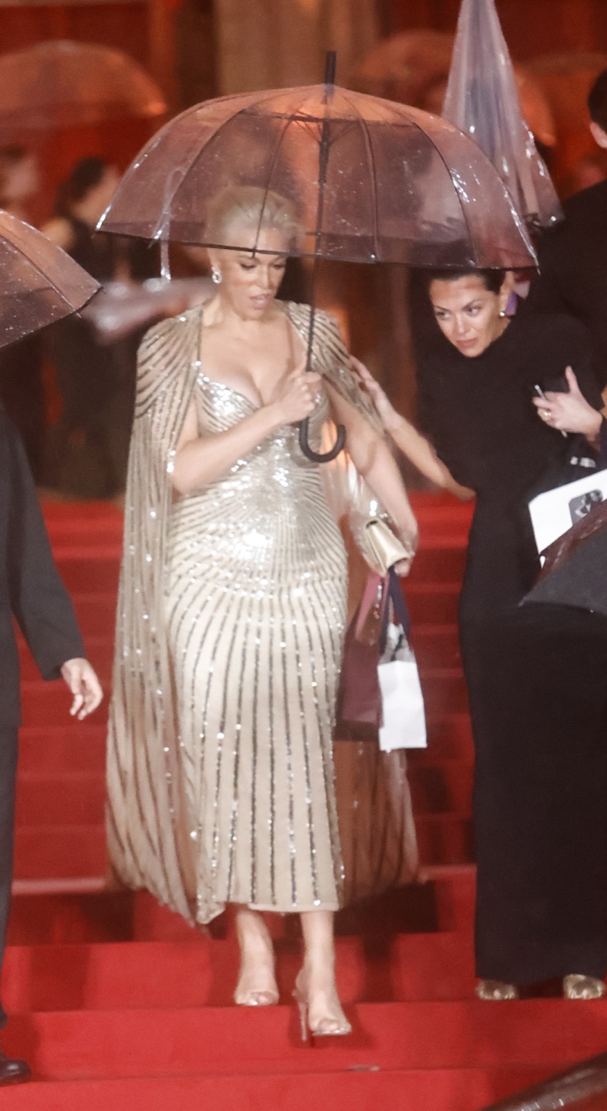 Elle entre en déesse hollywoodienne, robe moulée comme un serment et cape scintillante prête à juger l’humanité... ou la faire rêver.