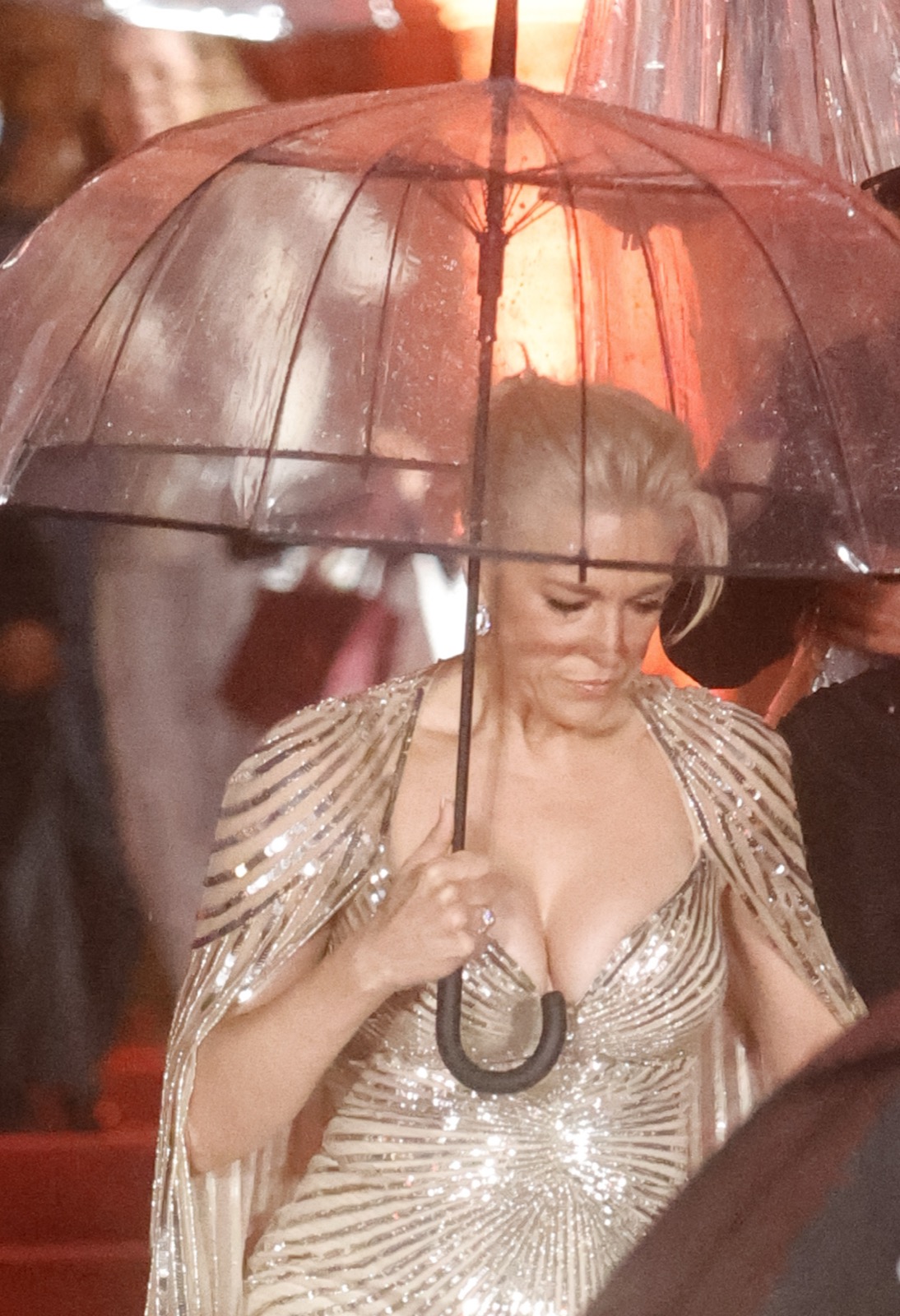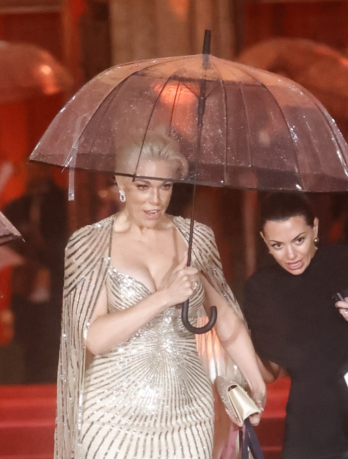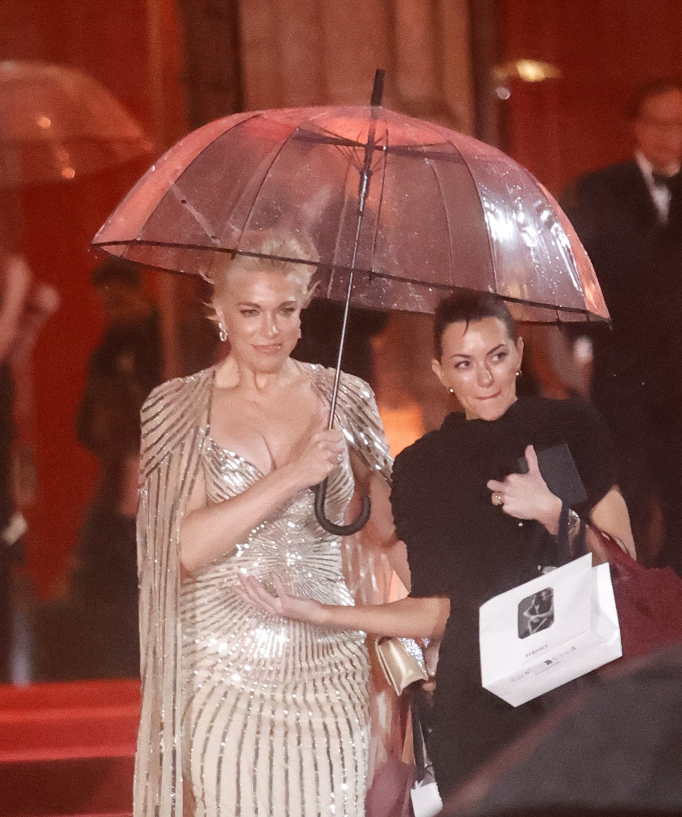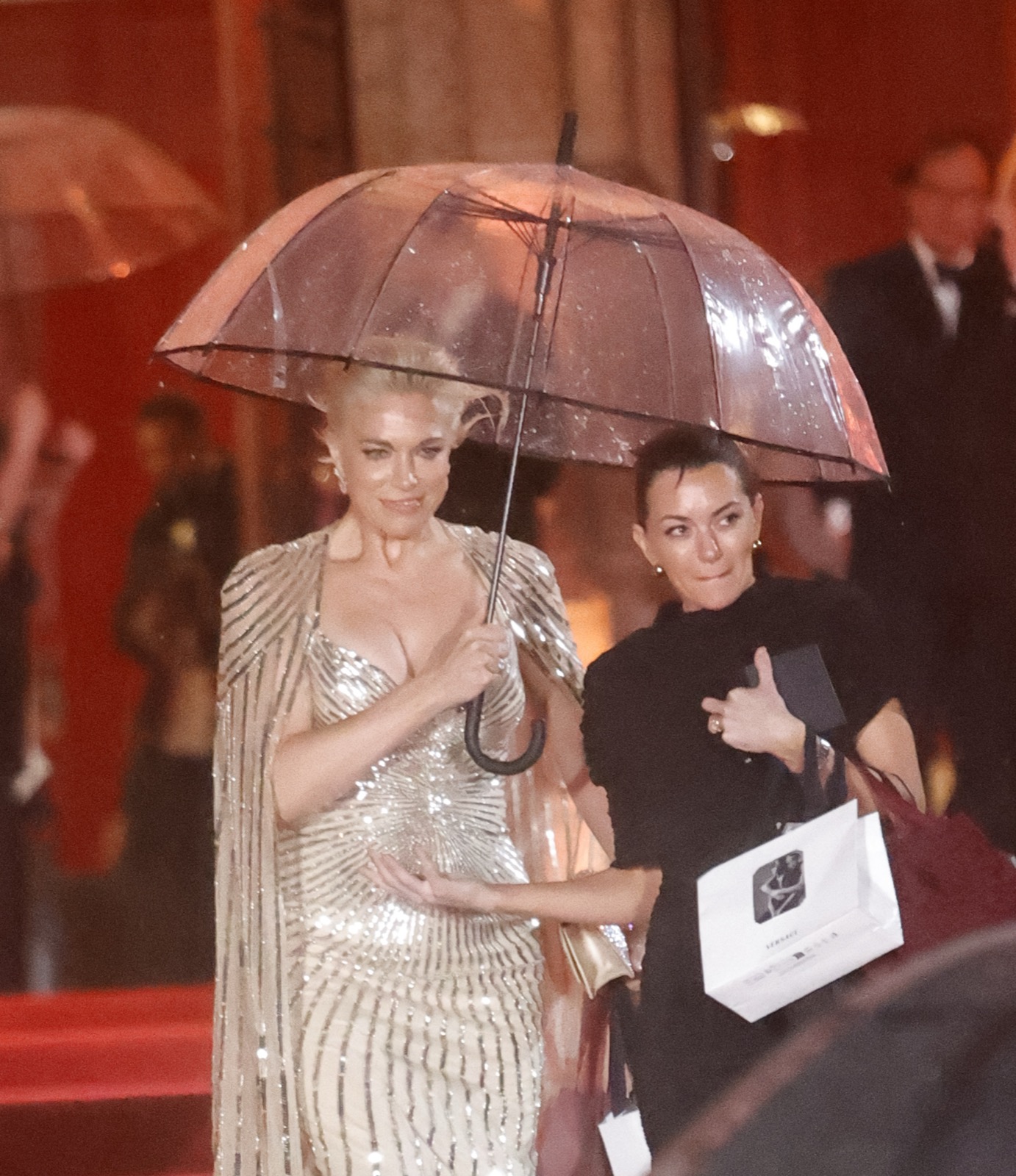 Elle entre en déesse hollywoodienne, robe moulée comme un serment et cape scintillante prête à juger l’humanité... ou la faire rêver.