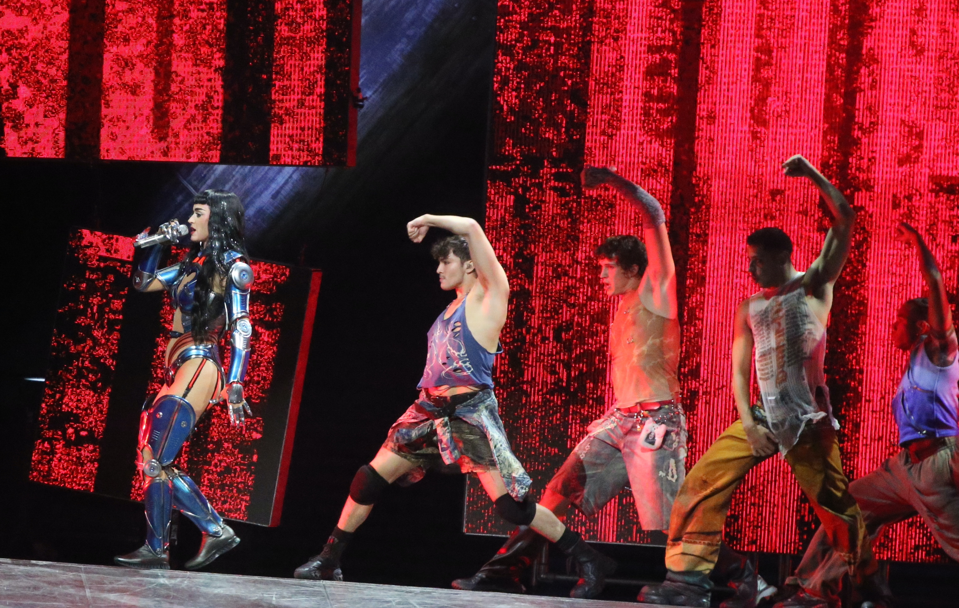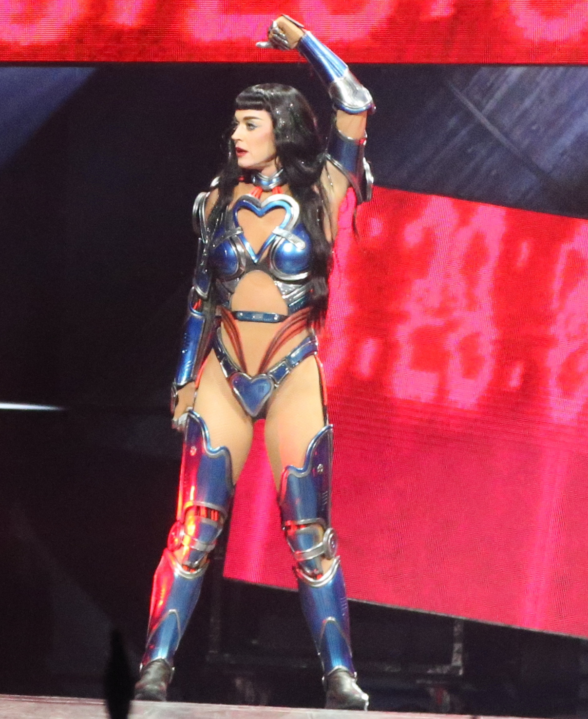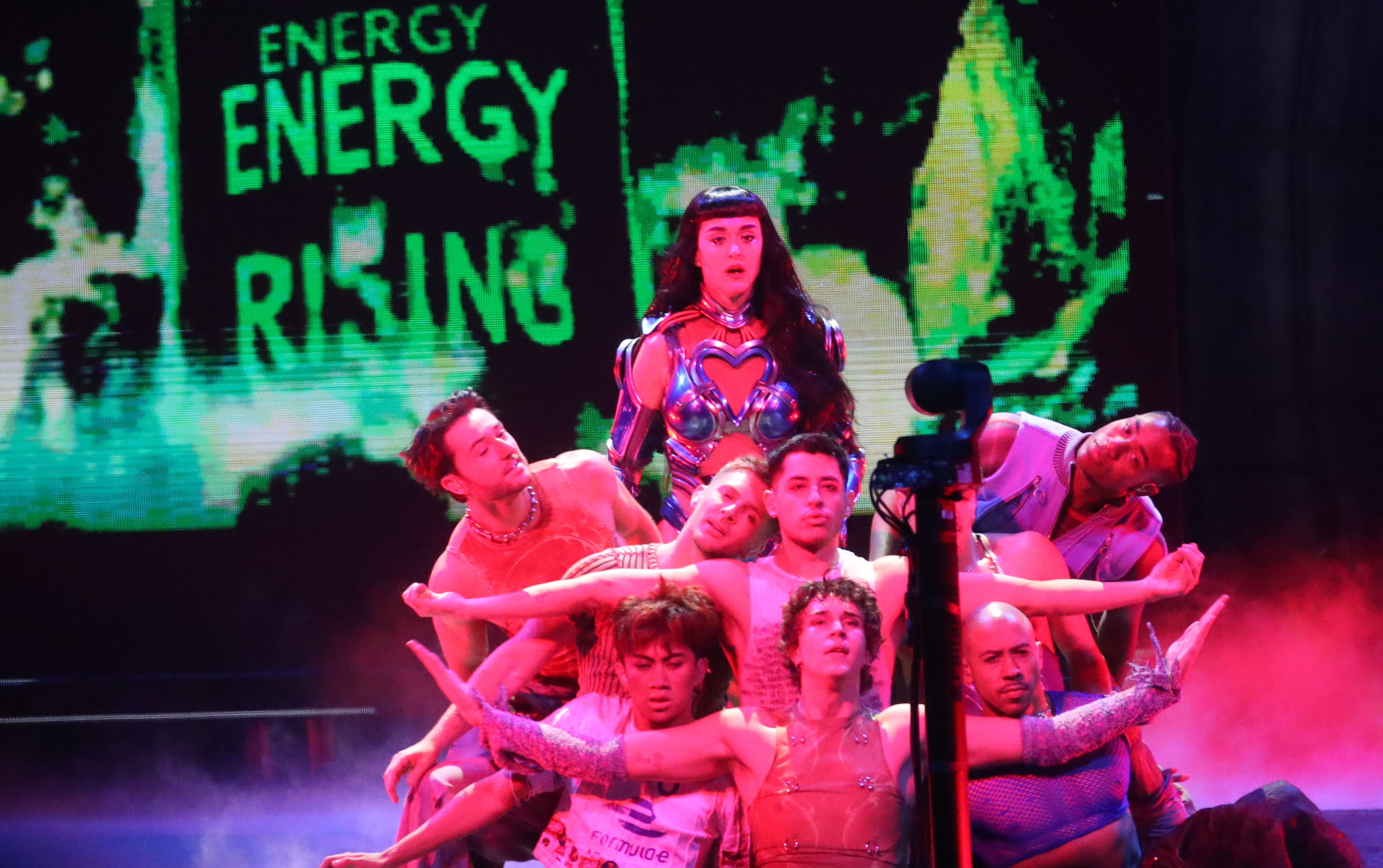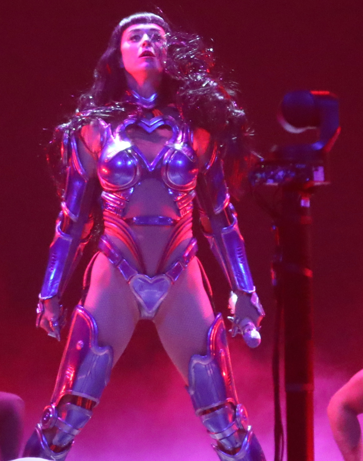 En combi métallique, Katy Perry transforme la scène en champ de bataille intergalactique, micro en main et regard de cyborg conquérante. Chaque note semble fondre le public dans un bain de néon rose et de sueur pop.
