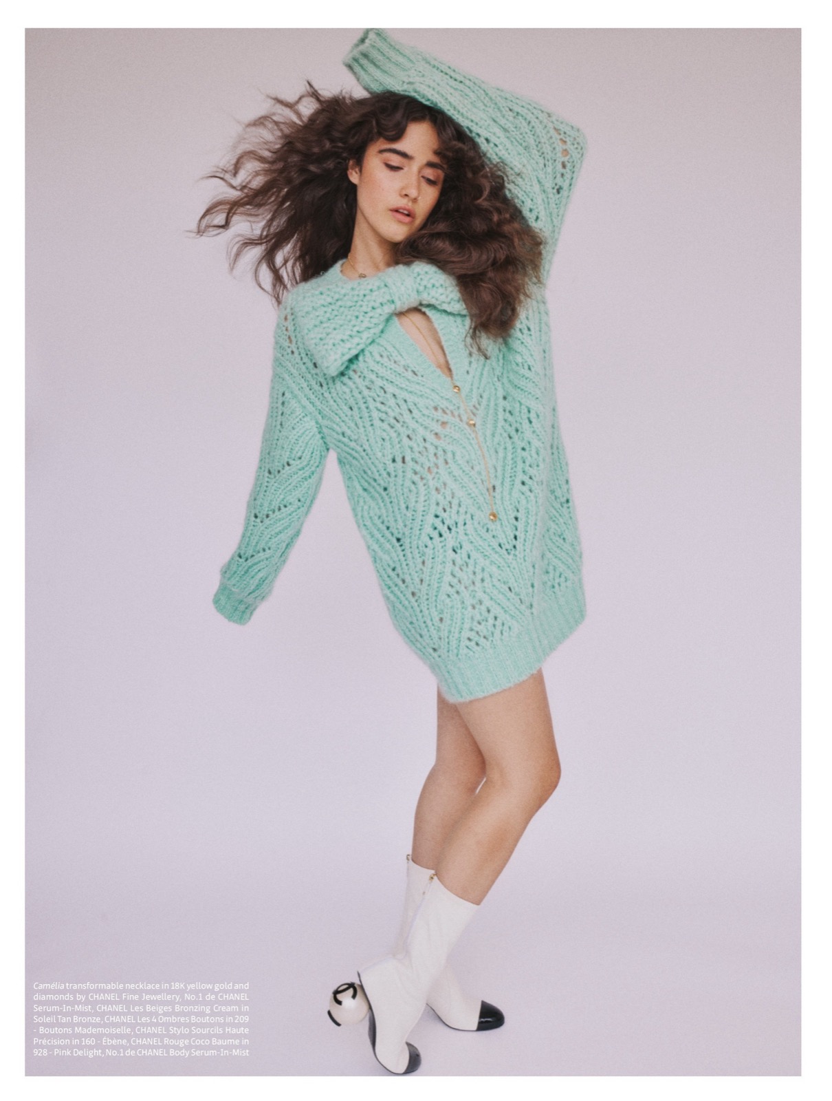 Ses cheveux cascadent, défiant la gravité, tandis que la jupe moulante dévoile un jeu de jambes à damner un saint. Une diva en devenir, qui transforme ce décor pastel en théâtre de luxure, sous l’œil lubrique de Chanel et ses bijoux provocants.