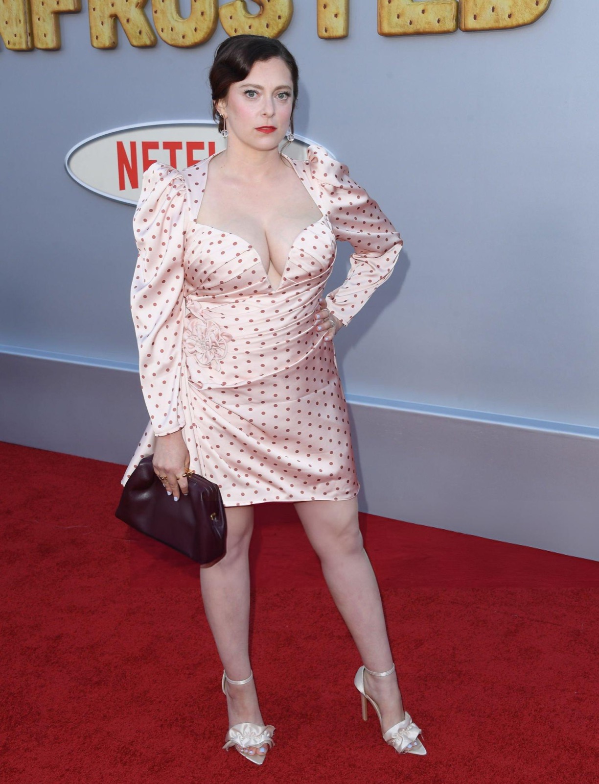 Rachel Bloom débarque à la première de UNFROSTED comme une friandise des fifties sortie d’un rêve torride : robe satin rose à pois coquins, épaules bouffantes et sourire qui dit « je sais très bien ce que je fais ». Même les affiches derrière semblent rougir de jalousie.