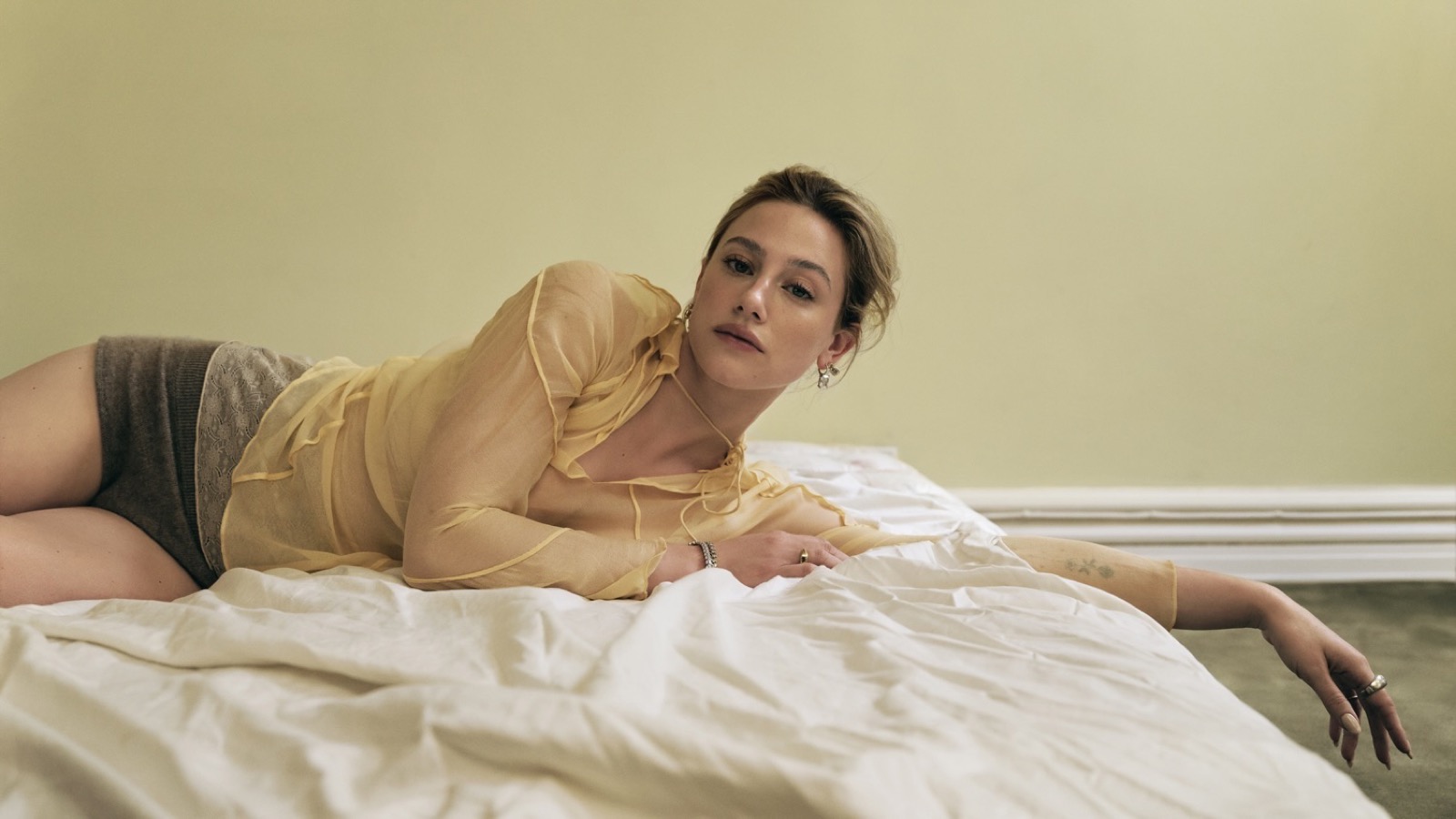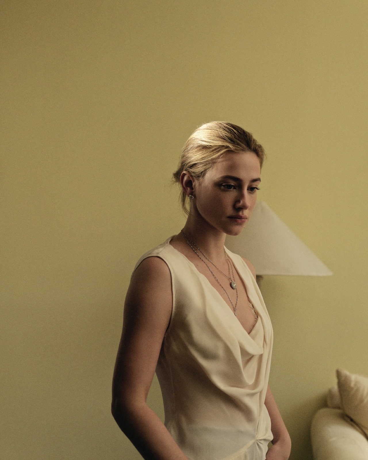 Dans un clair-obscur poudré, Lili Reinhart effleure la décadence avec nonchalance. Satin, tulle, peau nue : tout respire la volupté lasse.