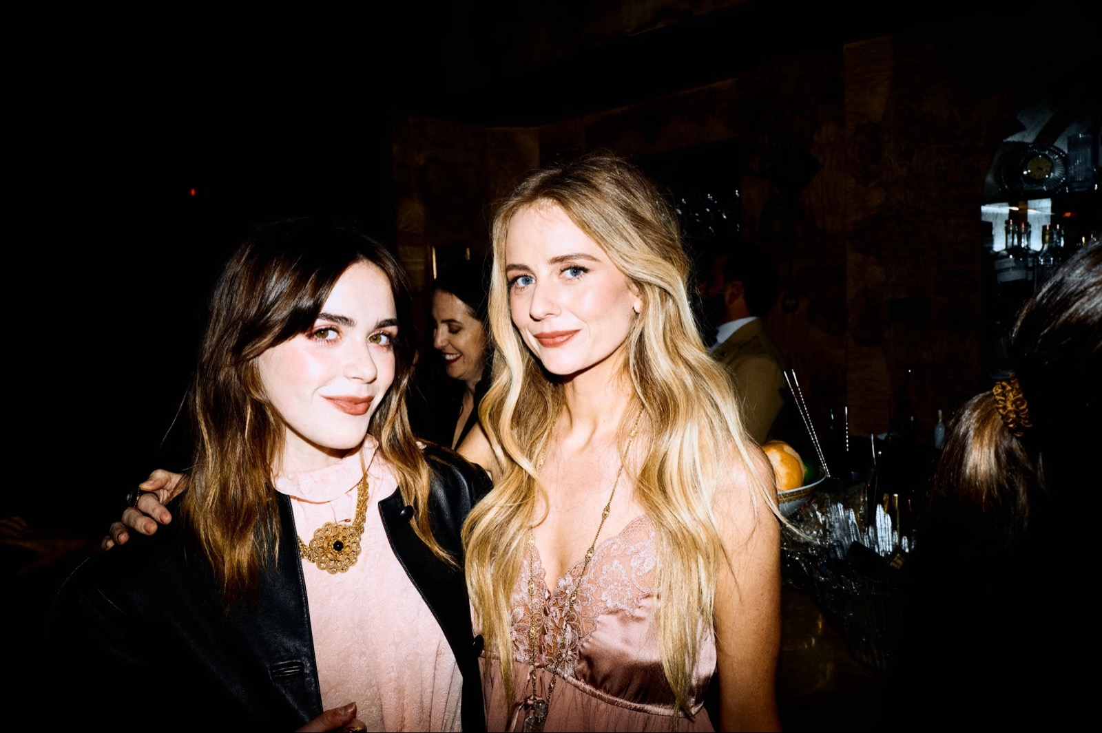 Les flashs s’attardent sur son collier doré, clin d’œil coquin à un cou qui ne demande qu’à être admiré. Autour d’elle, les coupes tintent, les regards glissent, et le cuir promet des histoires que la soie préfère taire.