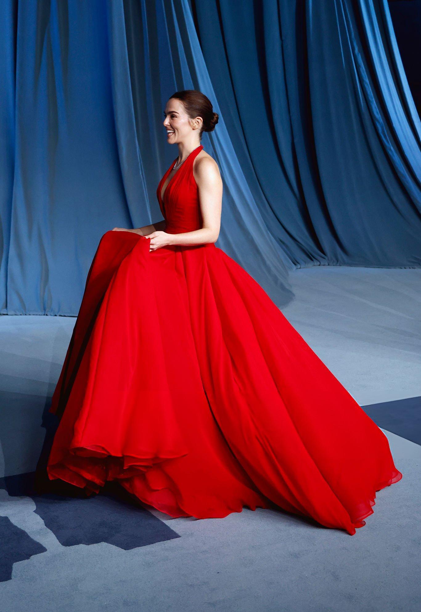 Rouge incendiaire, sourire désarmant : la belle incendie le tapis avec la grâce d’une tentation sous contrôle.