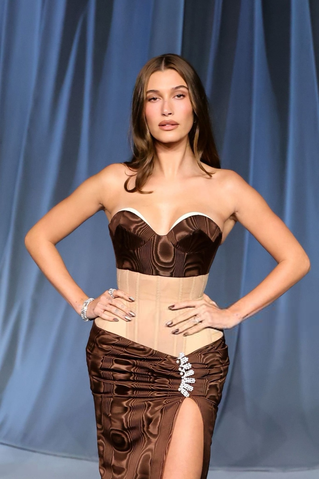Au 5th Annual Academy Museum Gala, Hailey Bieber apparaît en corset chocolat et transparence caramel, silhouette taillée au scalpel de la tentation. Chaque pli de satin ondule comme un soupir refoulé sous la lumière mondaine.