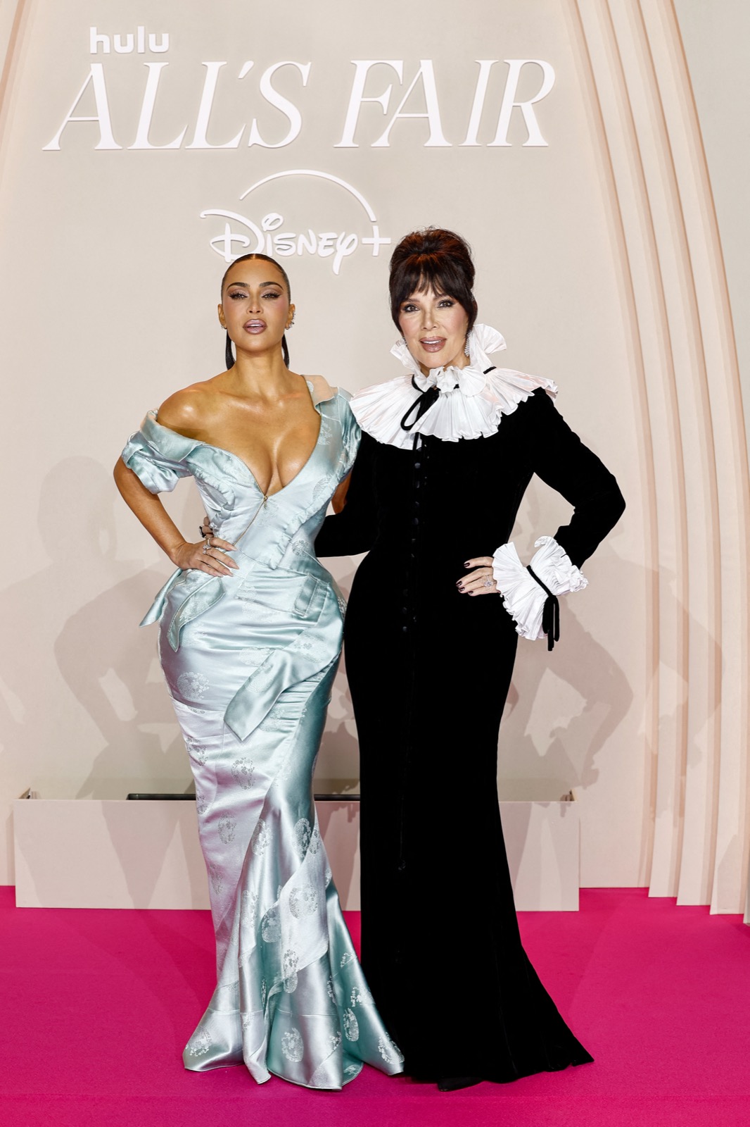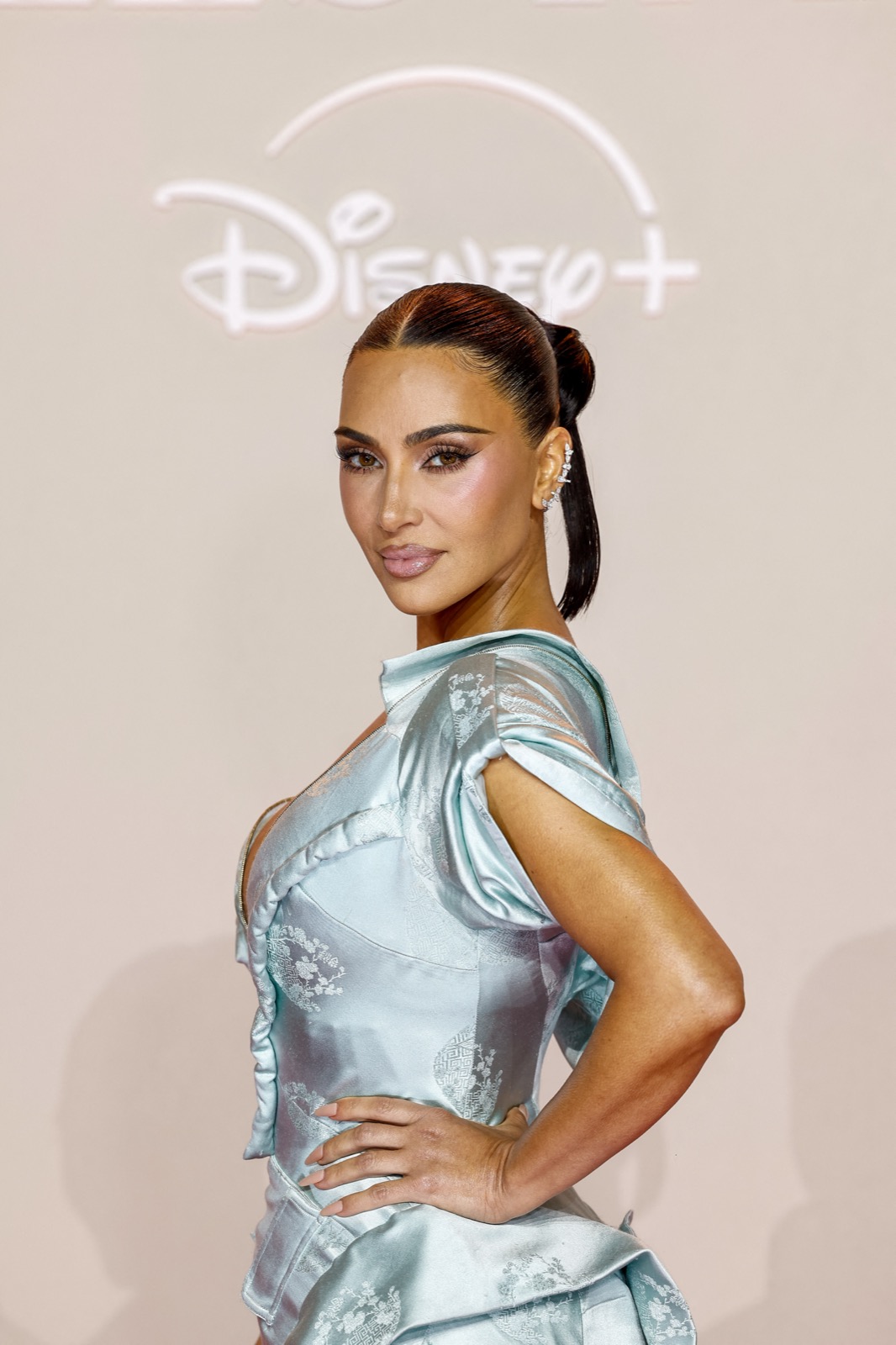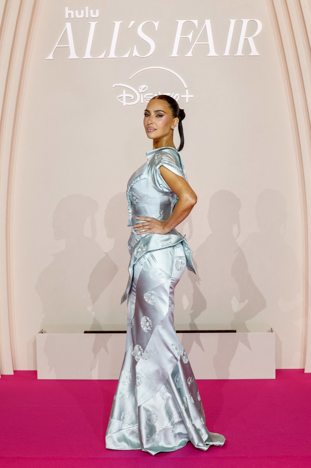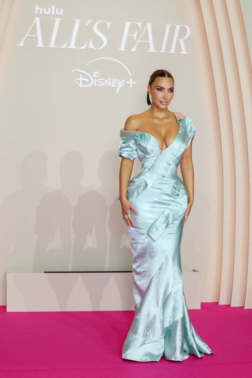 Kim Kardashian en sirène de satin au tapis rose de l’avant-première d’All’s Fair à Paris