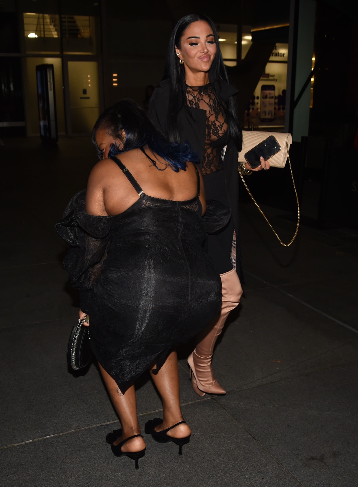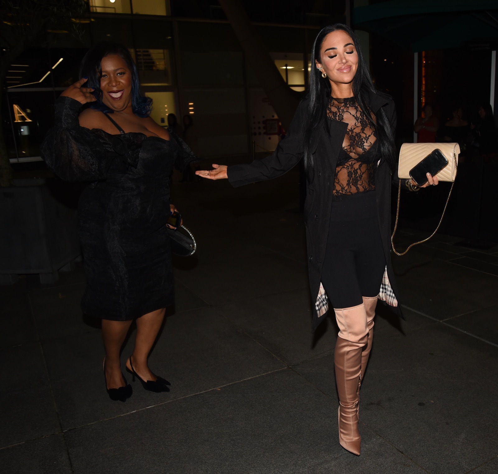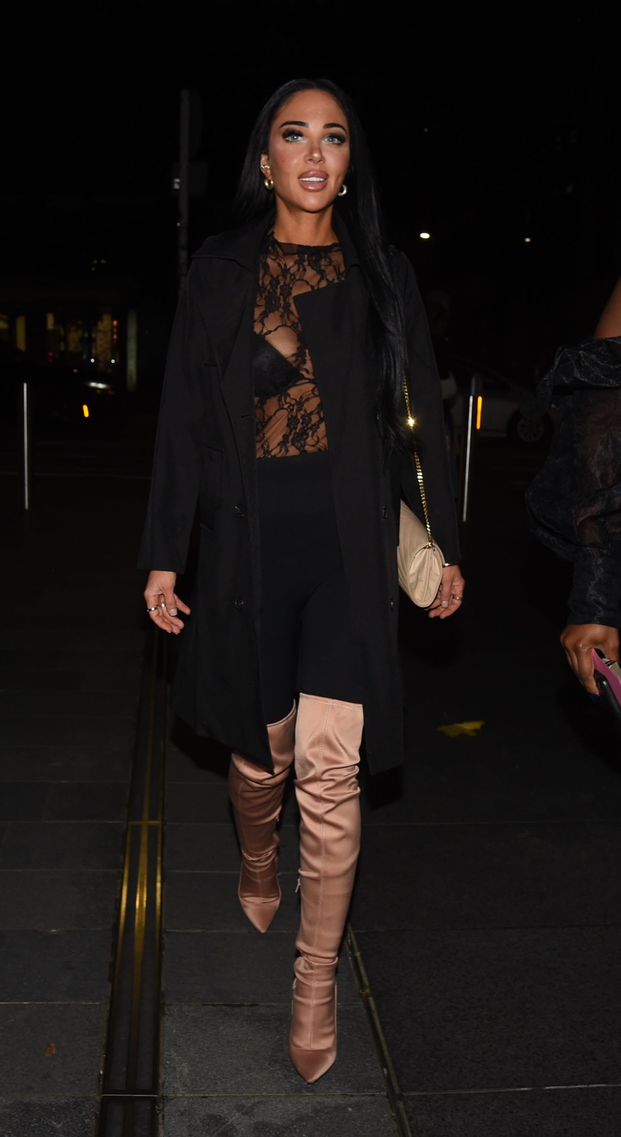 Tulisa Contostavlos s’avance vers Sexy Fish comme une héroïne de soap en mission érotique. Son haut en dentelle défie la gravité, son manteau la décence. Chaque pas claque comme un spoiler de scandale imminent.
