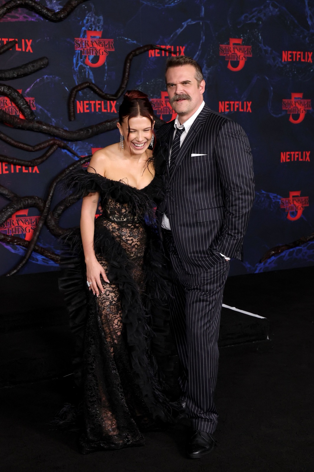 À Los Angeles, Millie Bobby Brown réapparaît dans un rôle qu’elle maîtrise à la perfection : muse damnée à la sensualité surnaturelle. Drapée de plumes et de dentelle, elle semble sortie d’un cauchemar chic signé Netflix, prête à aspirer les regards plus sûrement qu’un monstre du Upside Down.