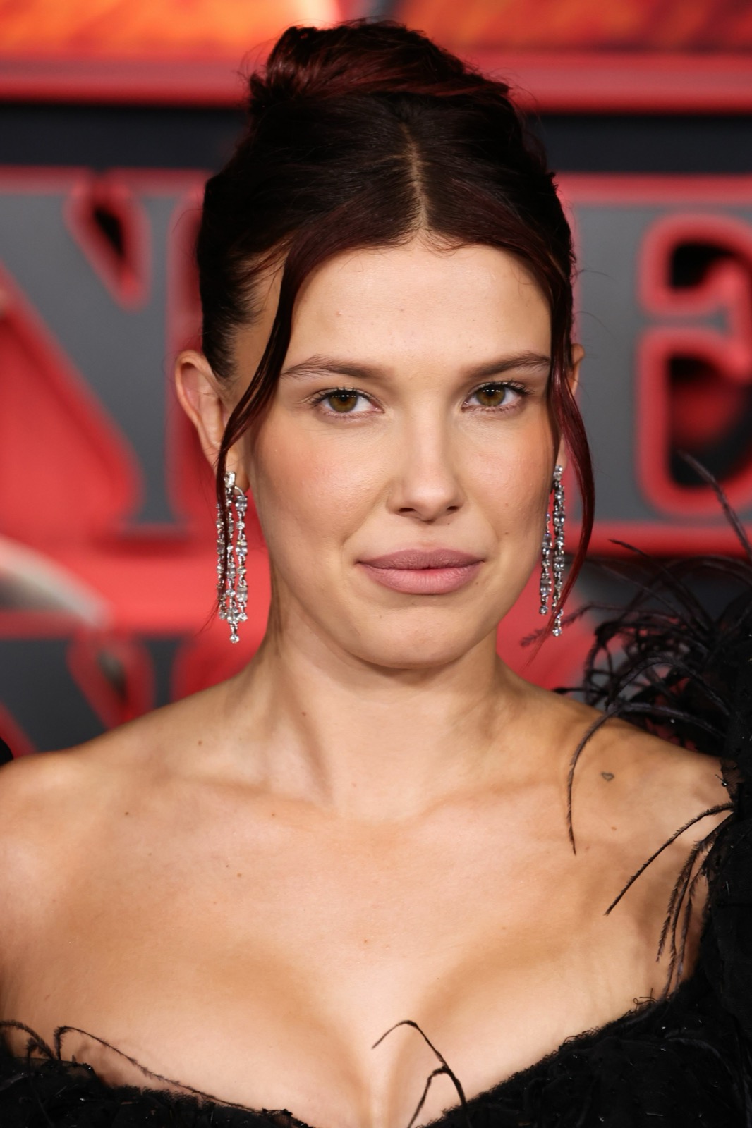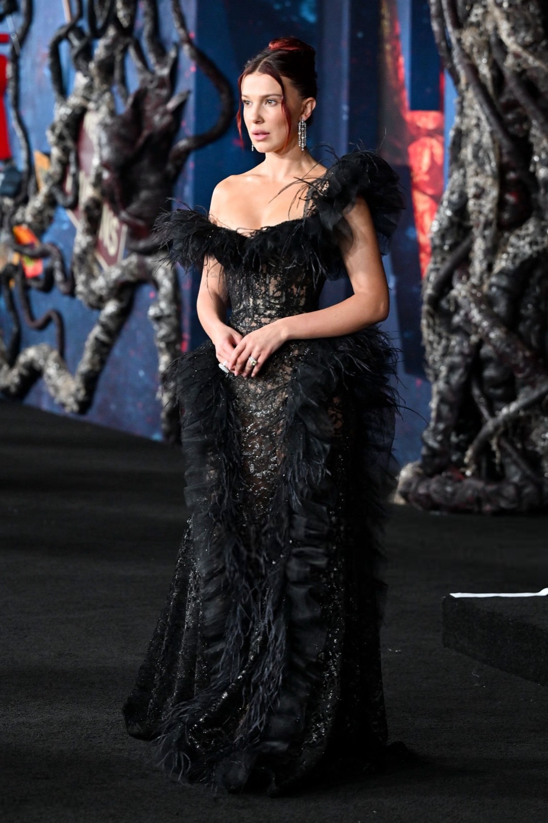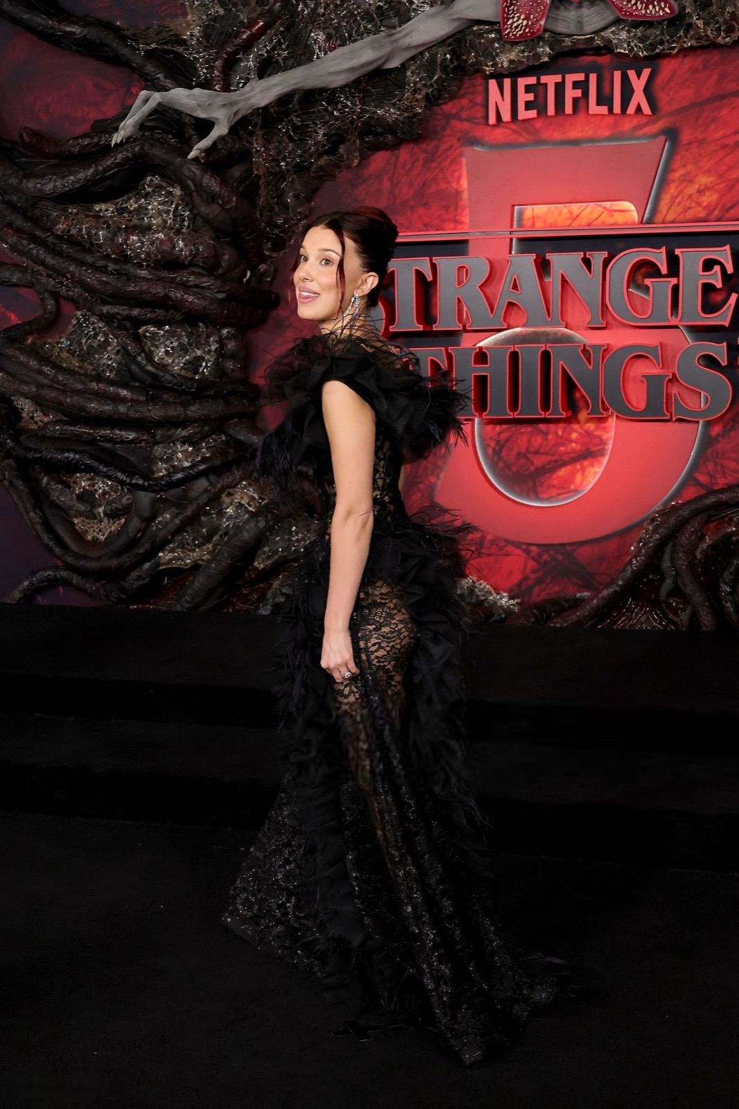 Son décolleté frôle l’insolence, ses épaules défient l’innocence : la jeune icône a troqué Eleven pour une héroïne de décadence. Chaque plume vibre comme une menace, chaque sourire s’efface en sortilège.