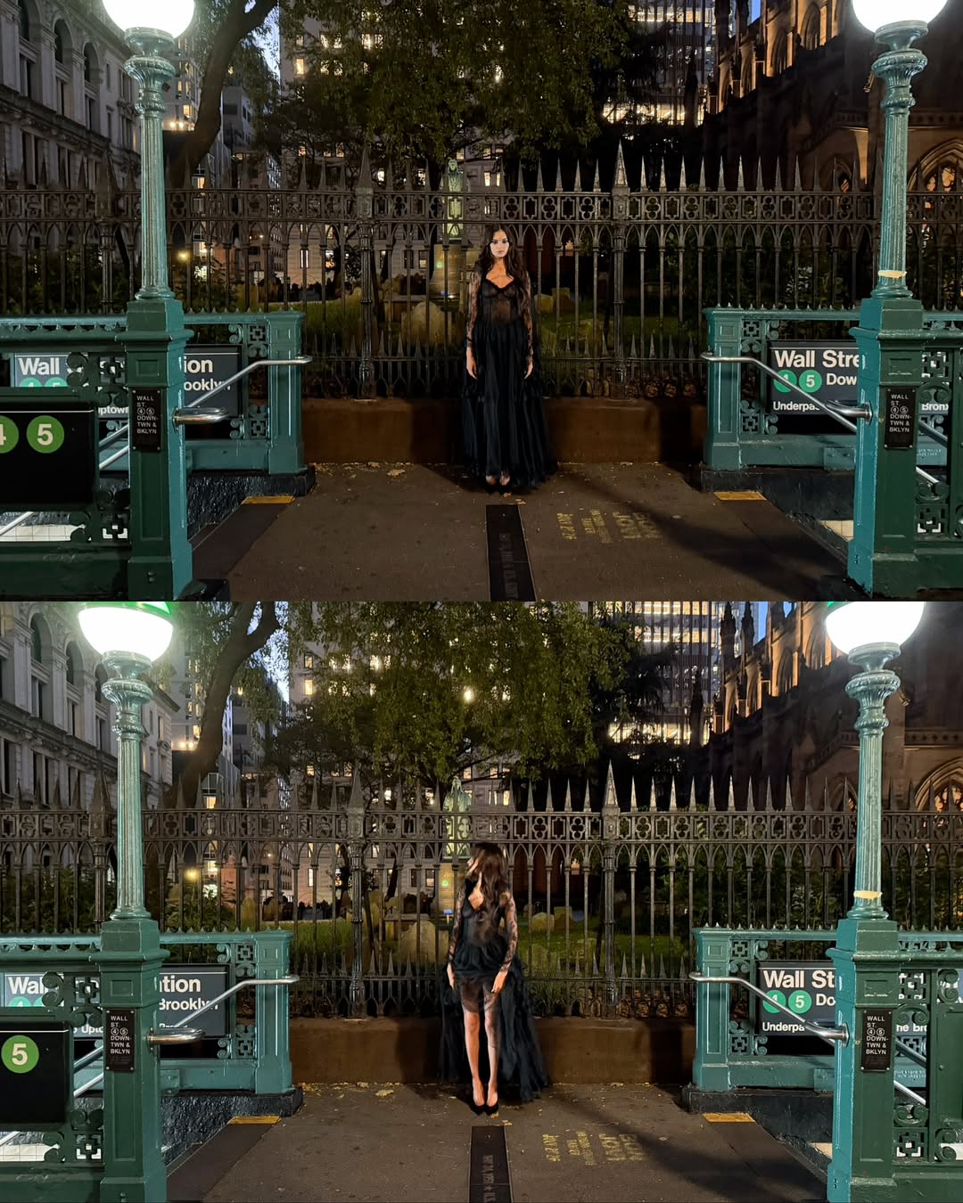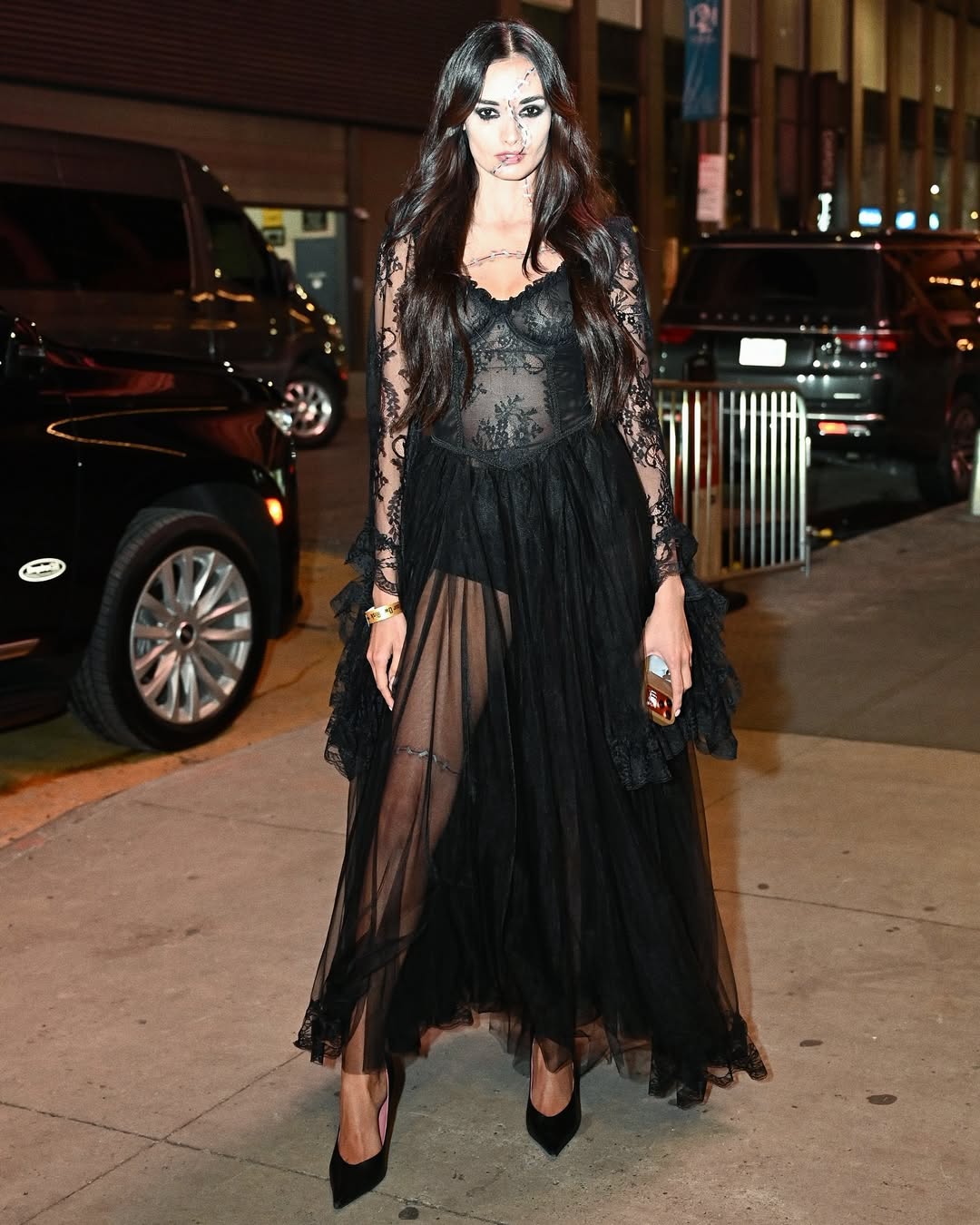 Devant le Hard Rock Hotel, Gizele Oliveira surgit dans une robe de dentelle transparente qui sent la luxure noire et la décadence victorienne. Chaque couture semble une caresse de damnée, chaque transparence un appel du néant, version couture par Heidi Klum Halloween.