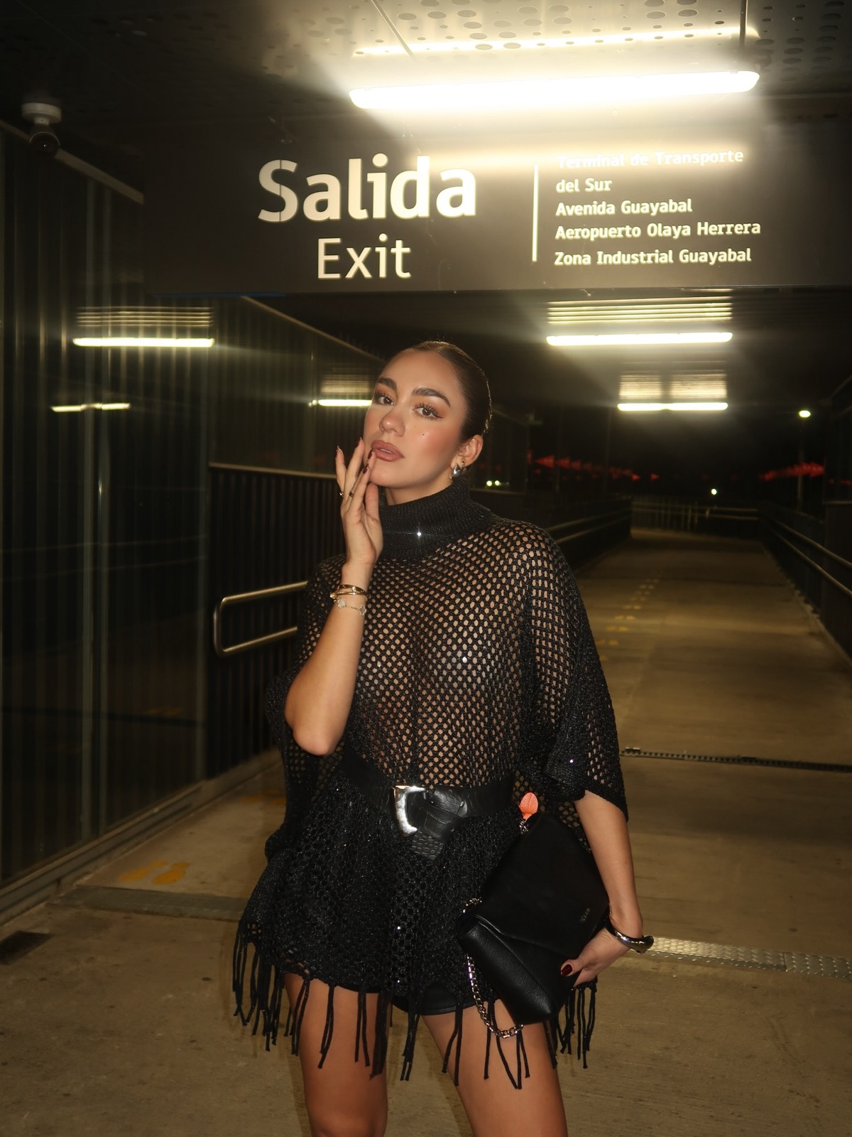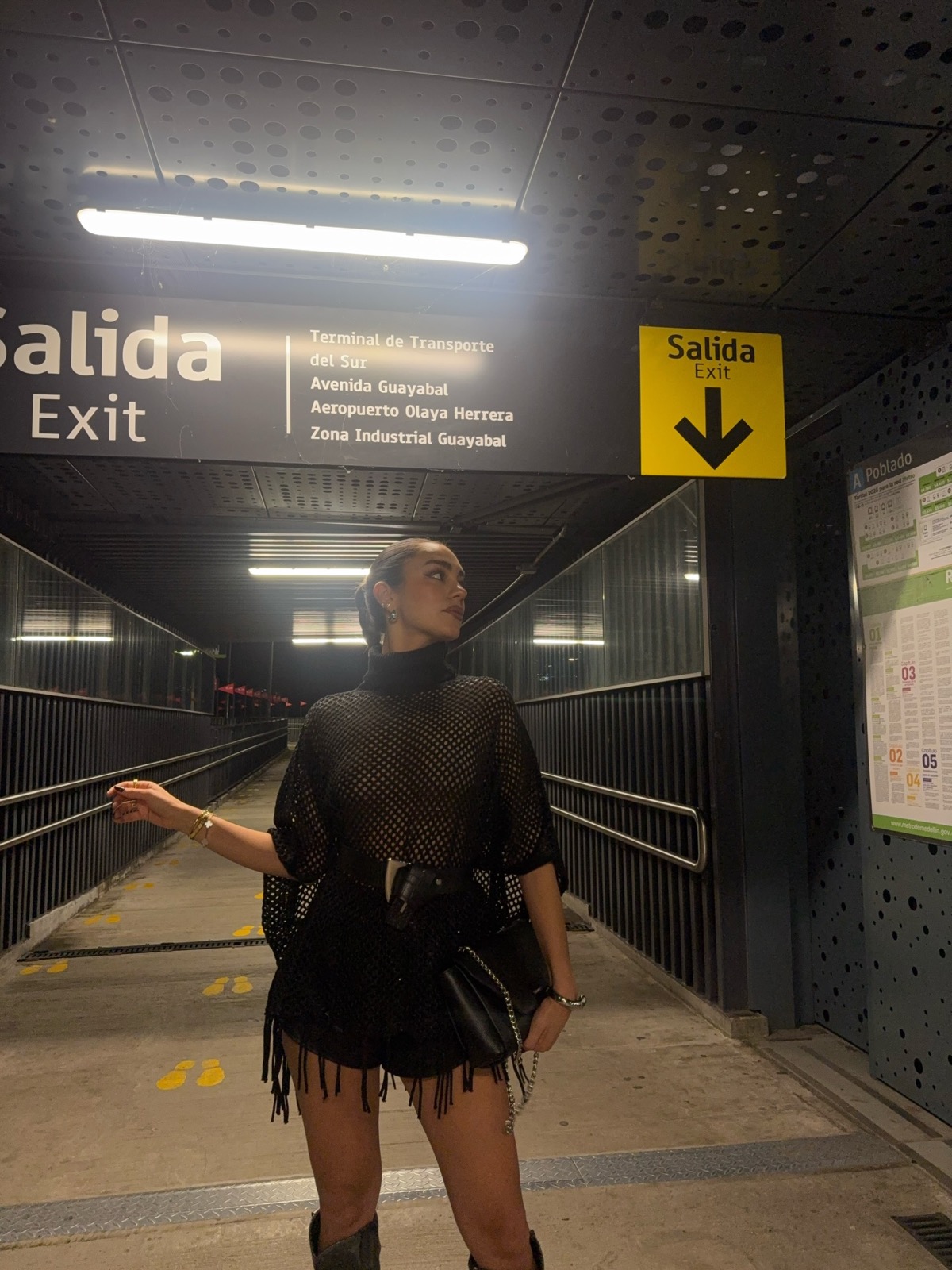 On la retrouve dans le métro, l’air de toiser le panneau “Salida” comme une provocation personnelle, sa silhouette tissée jouant avec les ombres qui s’étirent pour mieux lui emboîter le pas.