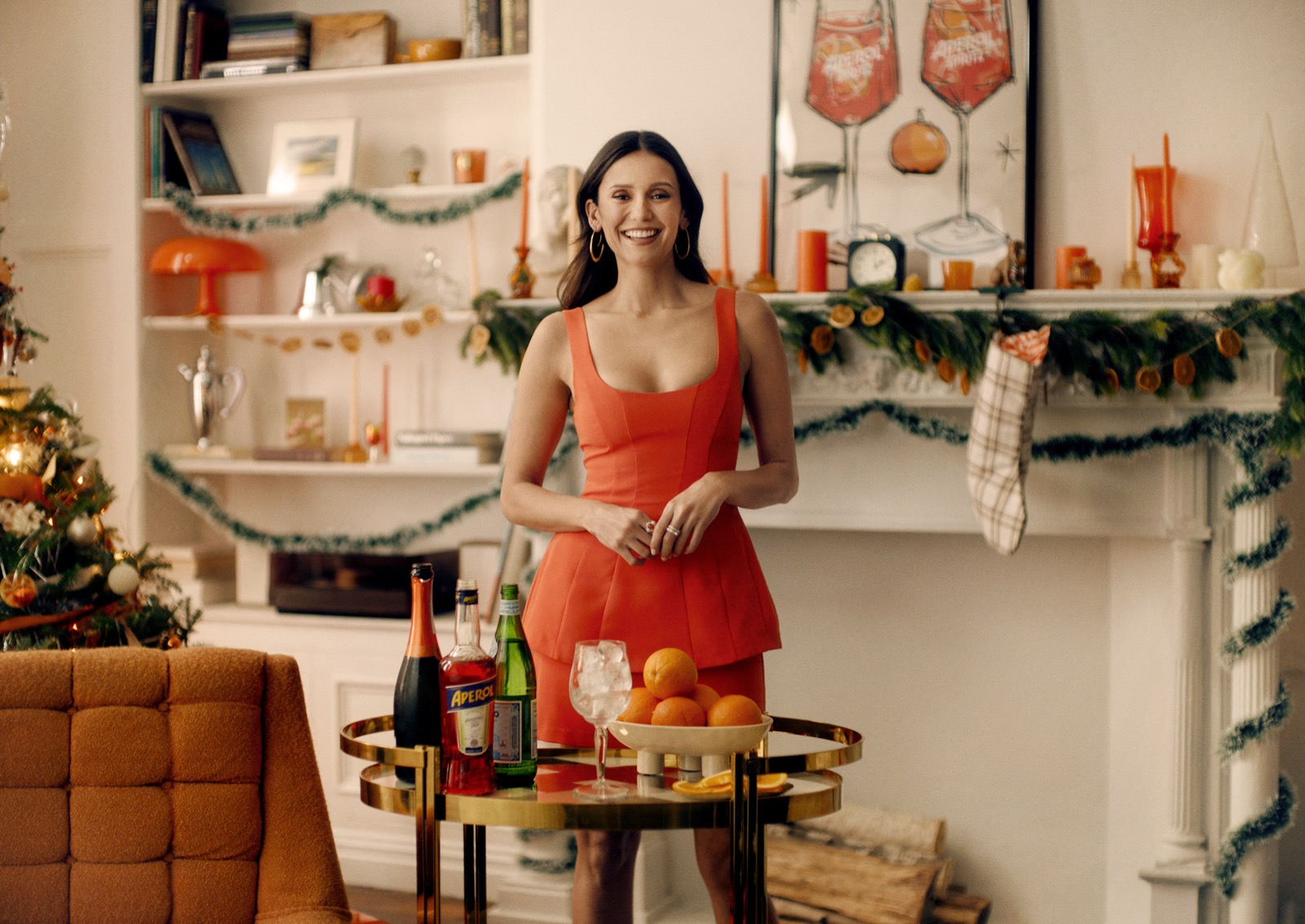 Nina Dobrev en campagne Aperolidays dans un salon plus orange qu’un sunset
