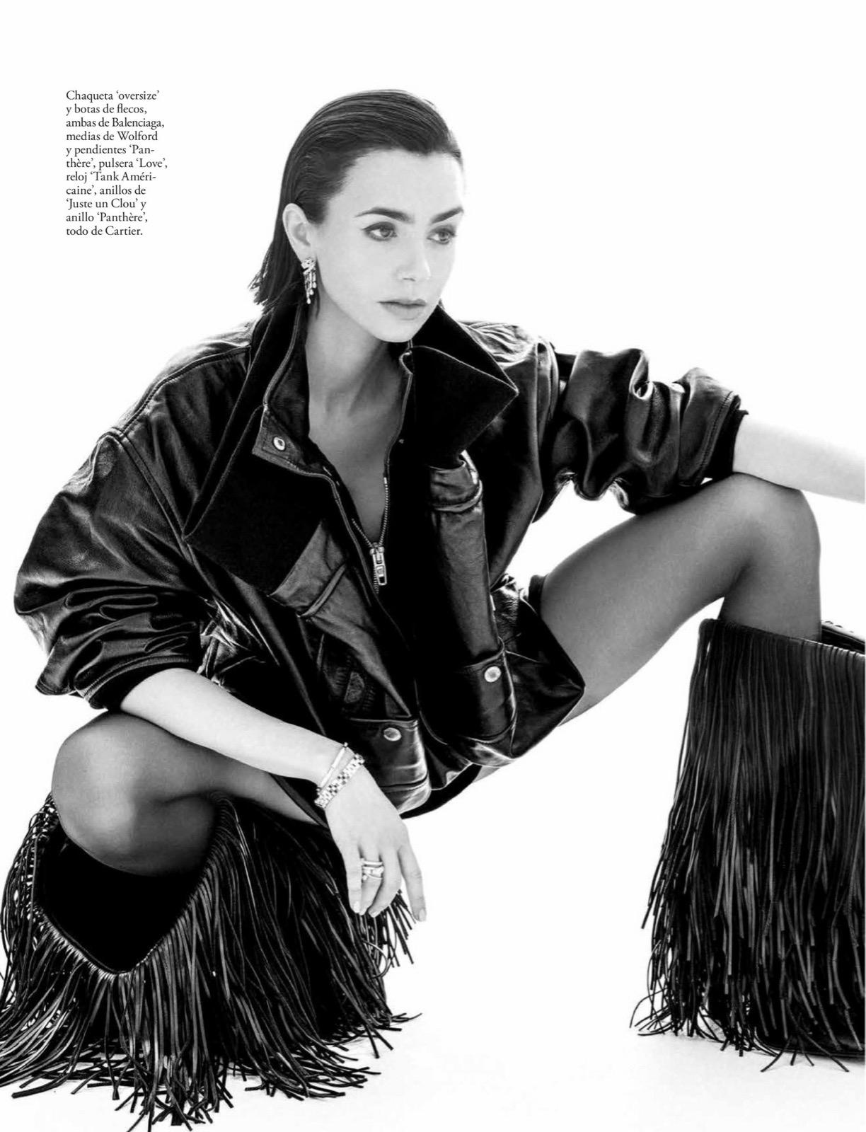 Entre deux poses blasées, Lily Collins donne ce fameux regard « mon planning vaut un abonnement premium », pendant que Elle essaie de suivre.